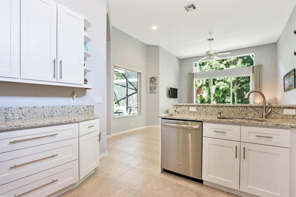 Sought-after Hamilton model 3br,3ba in quiet location at The Grande in Ibis. Double door entry with large foyer. Beautiful, spacious split layout. Home is being sold TURN-KEY and in MOVE-IN condition. Interior recently painted with designer colors. Completely remodeled kitchen with 42'' white maple Shaker cabinets, soft close doors and drawers. All SS GE Profile appliances. Granite counters with backsplash trim. Great Room off kitchen has triple glass slider doors leading to patio. Large living room with triple glass slider doors to screened lanai. Separate spacious dining room. Two large additional bedrooms. Separate laundry room with new LG washer/dryer and sink. Primary bedroom offer 2 walk-in closets as well as coffered ceiling that gives dramatic height.