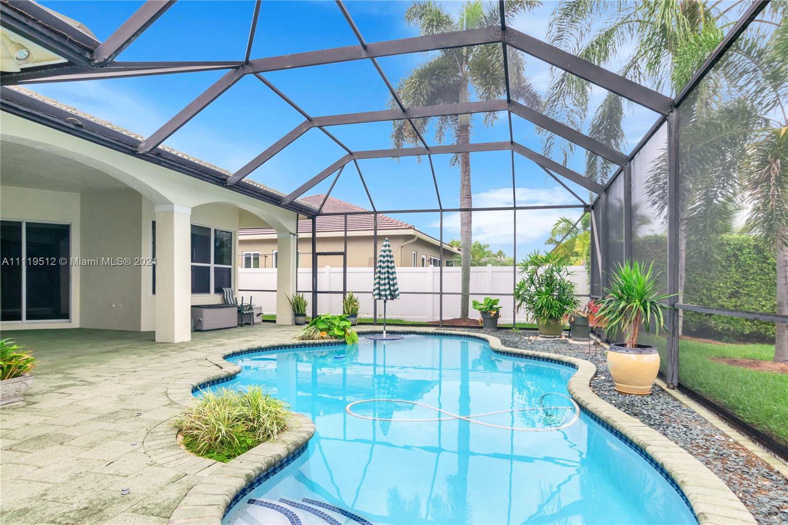 Bring the party outside and entertain multiple guests simultaneously in your free form pool and on your oversized lot- ALL with beautiful, wide lake views. Unpredictable weather pattern? Don't let rain ruin the party- fit everyone under your extended covered patio to continue the celebration. You and your indoor guests will enjoy the widely popular, 4-bedroom split floor plan with a cabana bath, a huge kitchen with power island along with separate breakfast, living, dining, and family room spaces. The spacious primary bedroom boasts a sitting area and dual walk-in closets. The exterior was recently painted and the pool was recently resurfaced. Pembroke Shores is a guard gated community that is conveniently located near I-75, parks, golf, restaurants, shopping, and great schools.