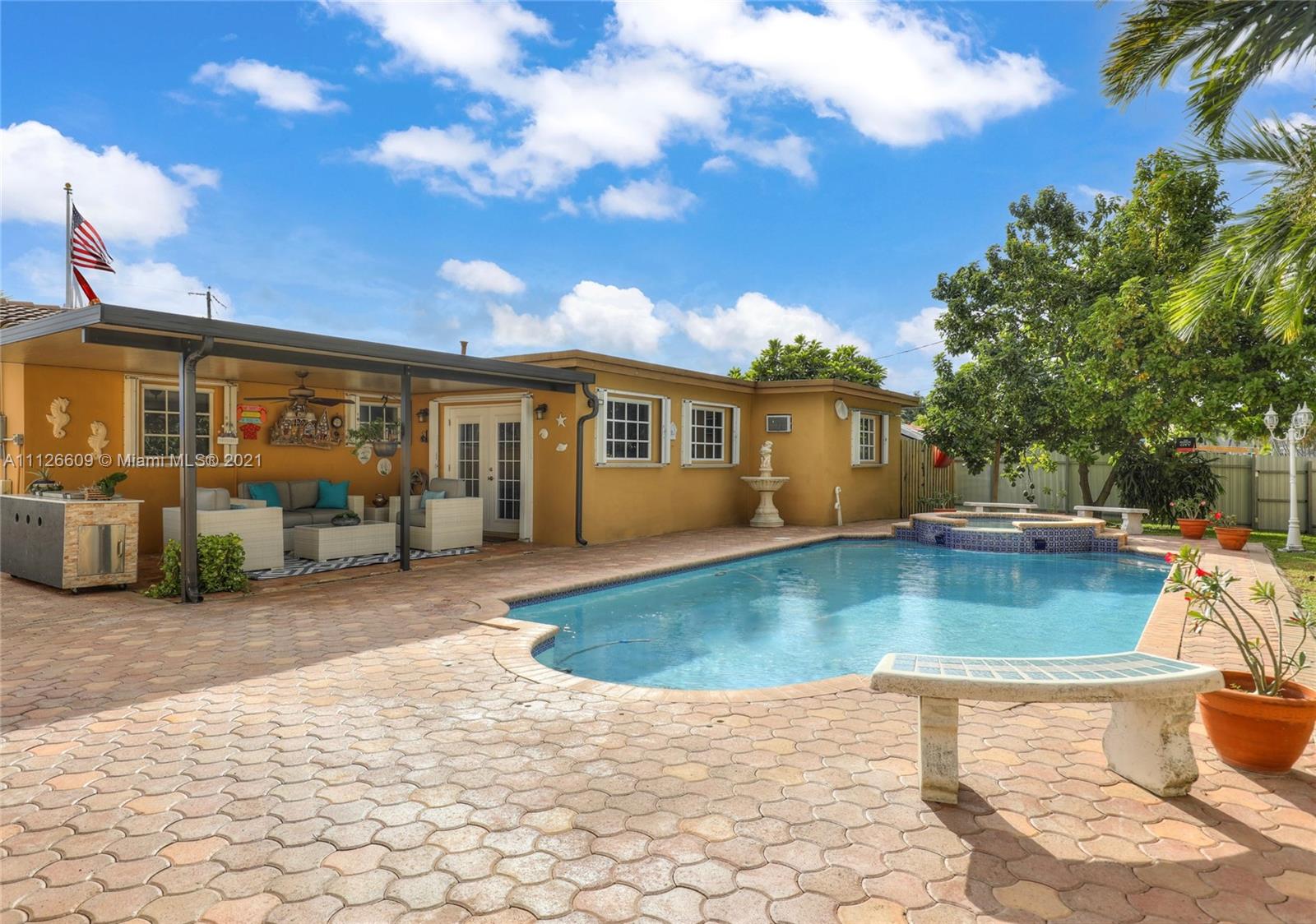 Rarely available opportunity, prepare to fall in love with this home! SFH in great location & highly sought after area, this spectacular property offers an array of features that include a spacious living room, breakfast bar, dining room w/ pool views, & direct French door access to Outdoor Living. Covered Patio, Saltwater Pool, Hot Tub, New Concrete Fenced Backyard,Avocado & Mamey Trees,Garage,Carport,& Workshop area w/ Shed. Interior features include completely Remodeled bathroom,master walk-in closet, real wood kitchen cabinets, SS appliances,Granite Countertops,Large Laundry Room & Pantry w/ extensive storage space.