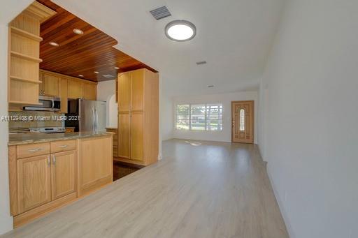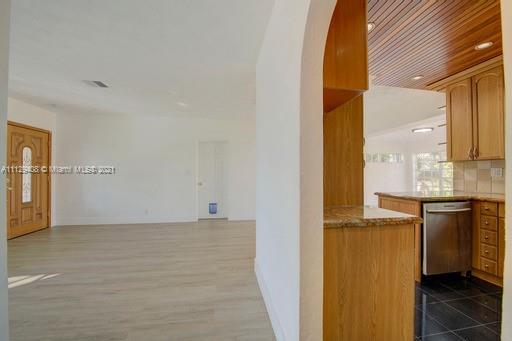 3 BR 2 BATH WITH 1 CAR GARAGE 1292 SQ FT LV 1492 ADJ SQ FT in Quiet Neighborhood. Recently Updated Home, New Waterproof laminate floors throughout.. Wood kitchen cabinets with granite counter tops and stainless steel appliances, Central A/C. Large utility room with New Gas Water Heater, Large Enclosed terrace . Bathrooms have new vanities, toilets and fixtures, windows have accordion shutters.