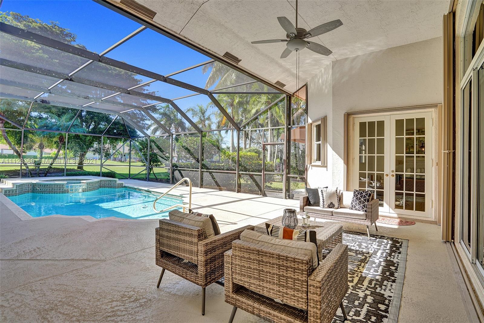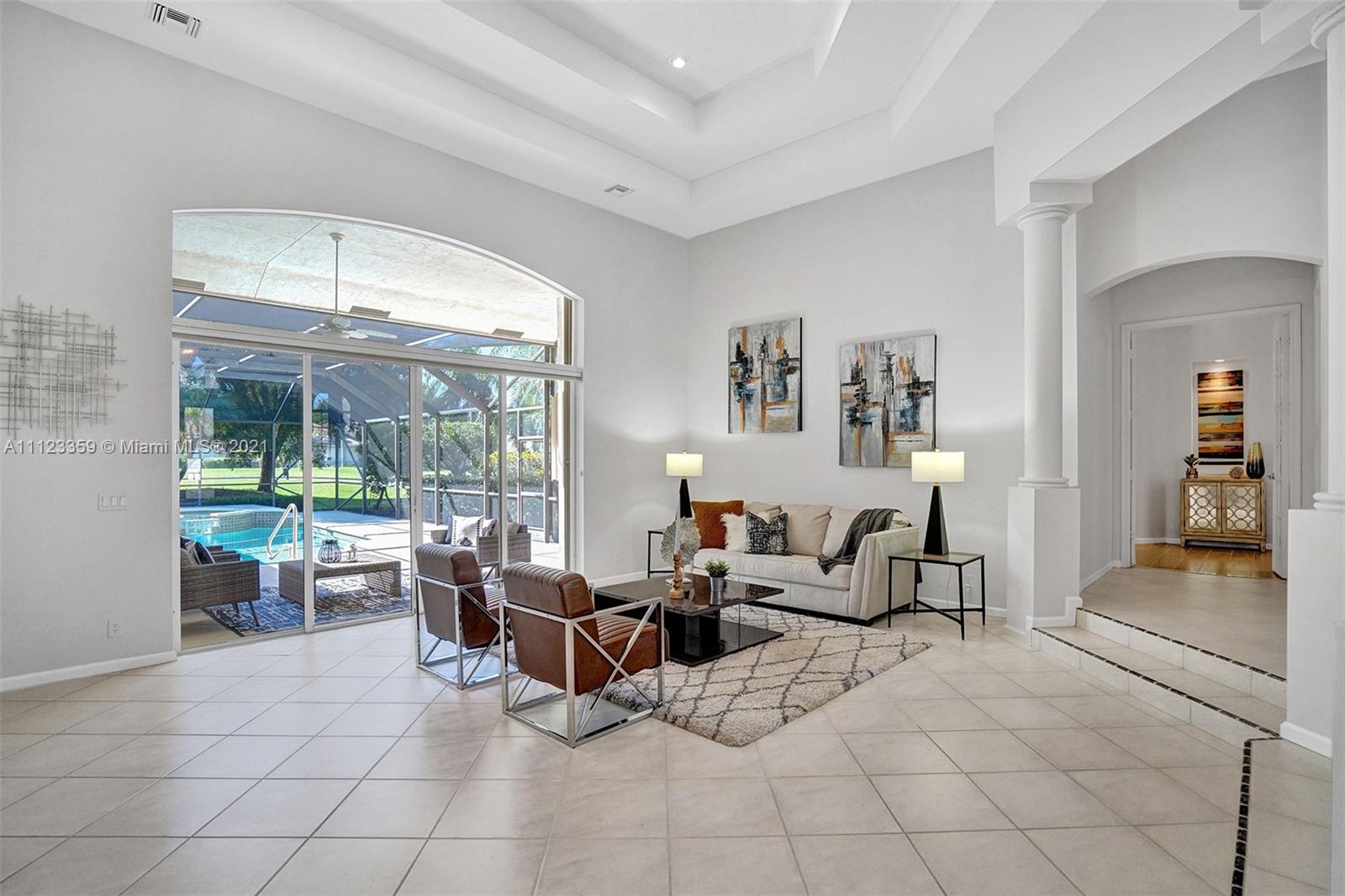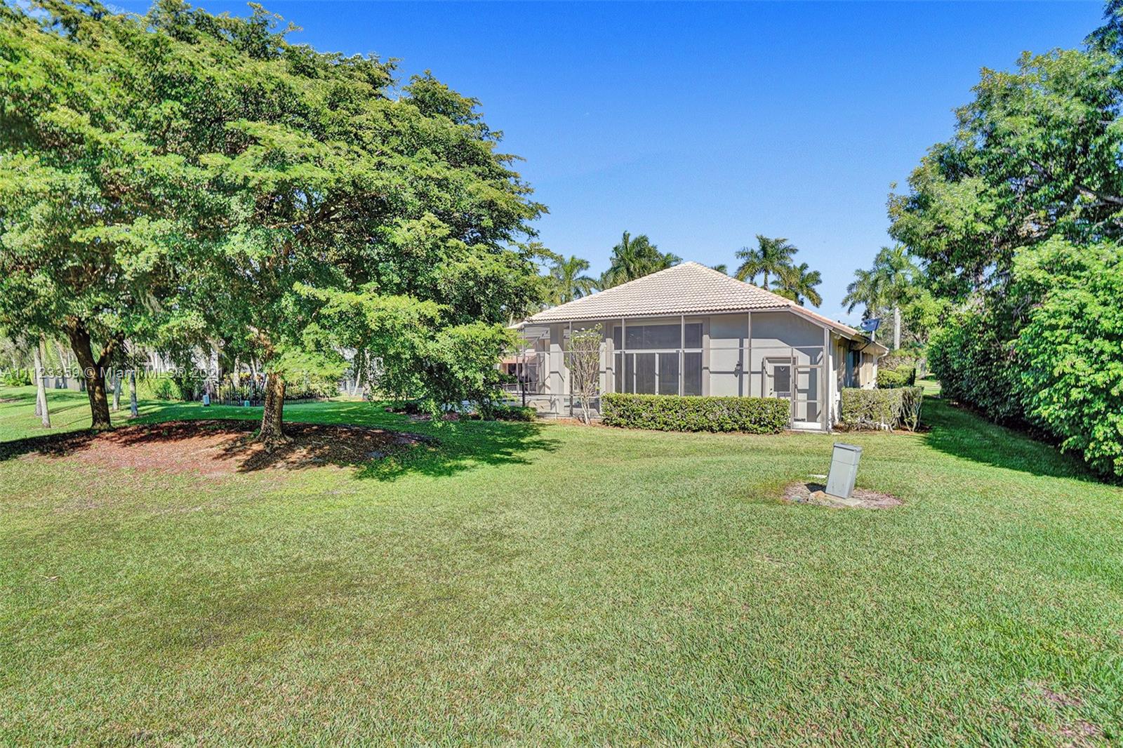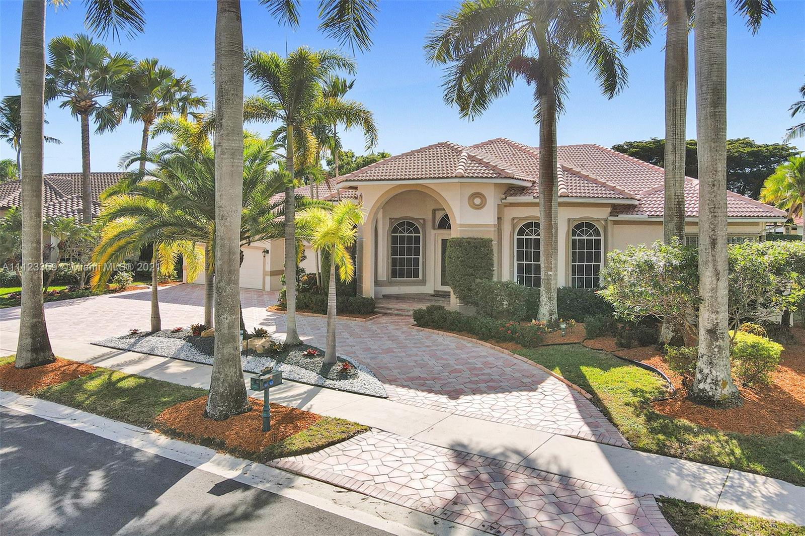 TUCKED ON A ROYAL PALM TREE LINED STREET. THIS MAGNIFICENT HOME BACKS TO GOLF WITH A SCREENED PATIO WITH POOL AND SPA. OVERSIZED 15,046 SQUARE FOOT LOT TO ENJOY. GRAND CIRCULAR PAVER DRIVEWAY WELCOMES YOU HOME. FULL ACCORDION PROTECTION. CUSTOM ONE STORY FRESHLY PAINTED IN TODAY'S NEUTRAL COLORS. PRIMARY BEDROOM HAS FRENCH DOORS TO THE POOL AND PATIO. TWO SPACIOUS CLOSETS WITH A RENOVATED BATH, DUAL SINKS, OVERSIZED SHOWER. KITCHEN WITH MAPLE WOOD CABINETS AND GRANITE COUNTERTOPS. NEUTRAL TILE FLOORING THROUGHOUT LIVING AREAS. GRAND BILLIARD/PLAYROOM (CAN BE CONVERTED TO BEDROOM) PLUS CABANA BATH.