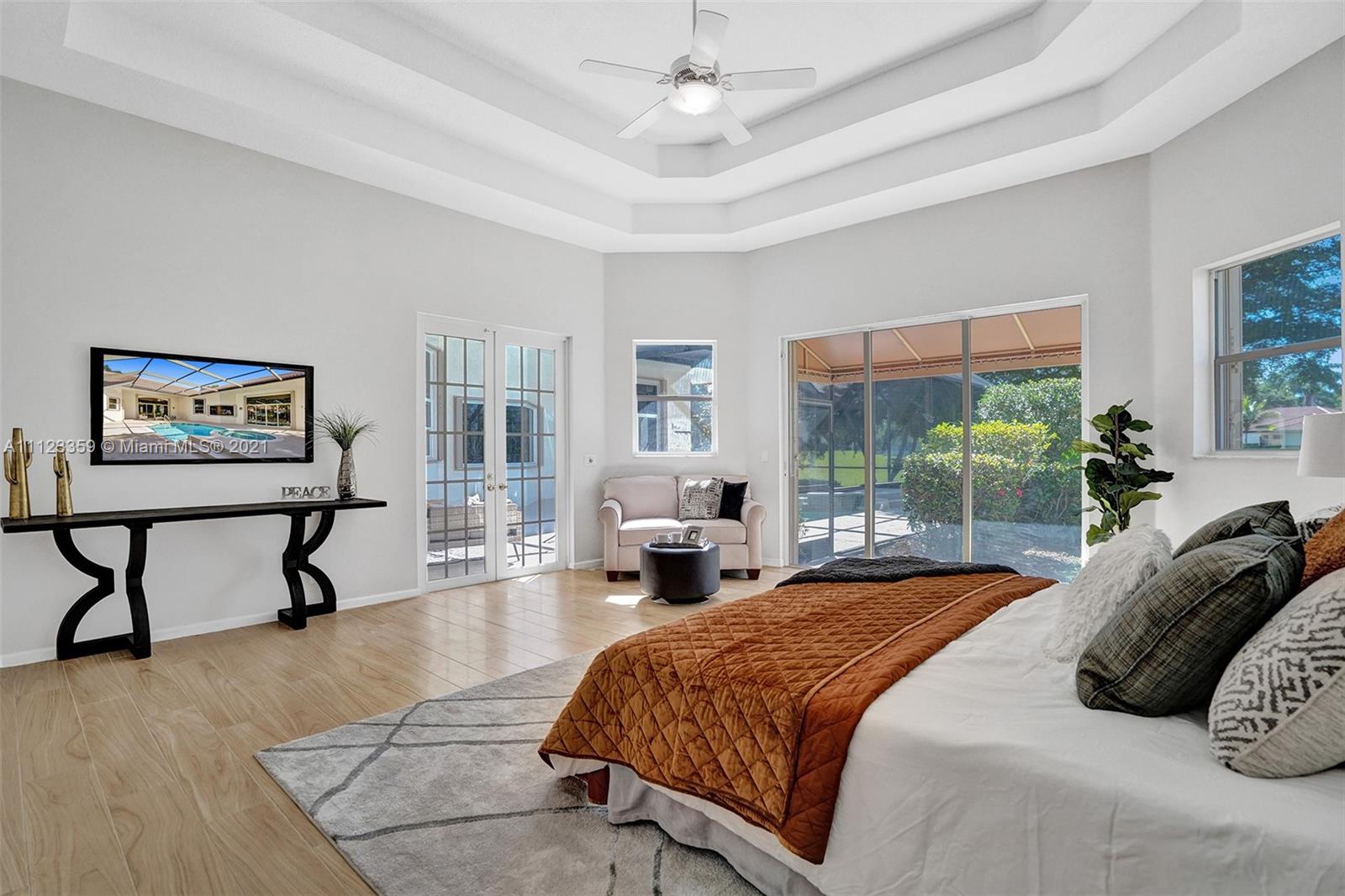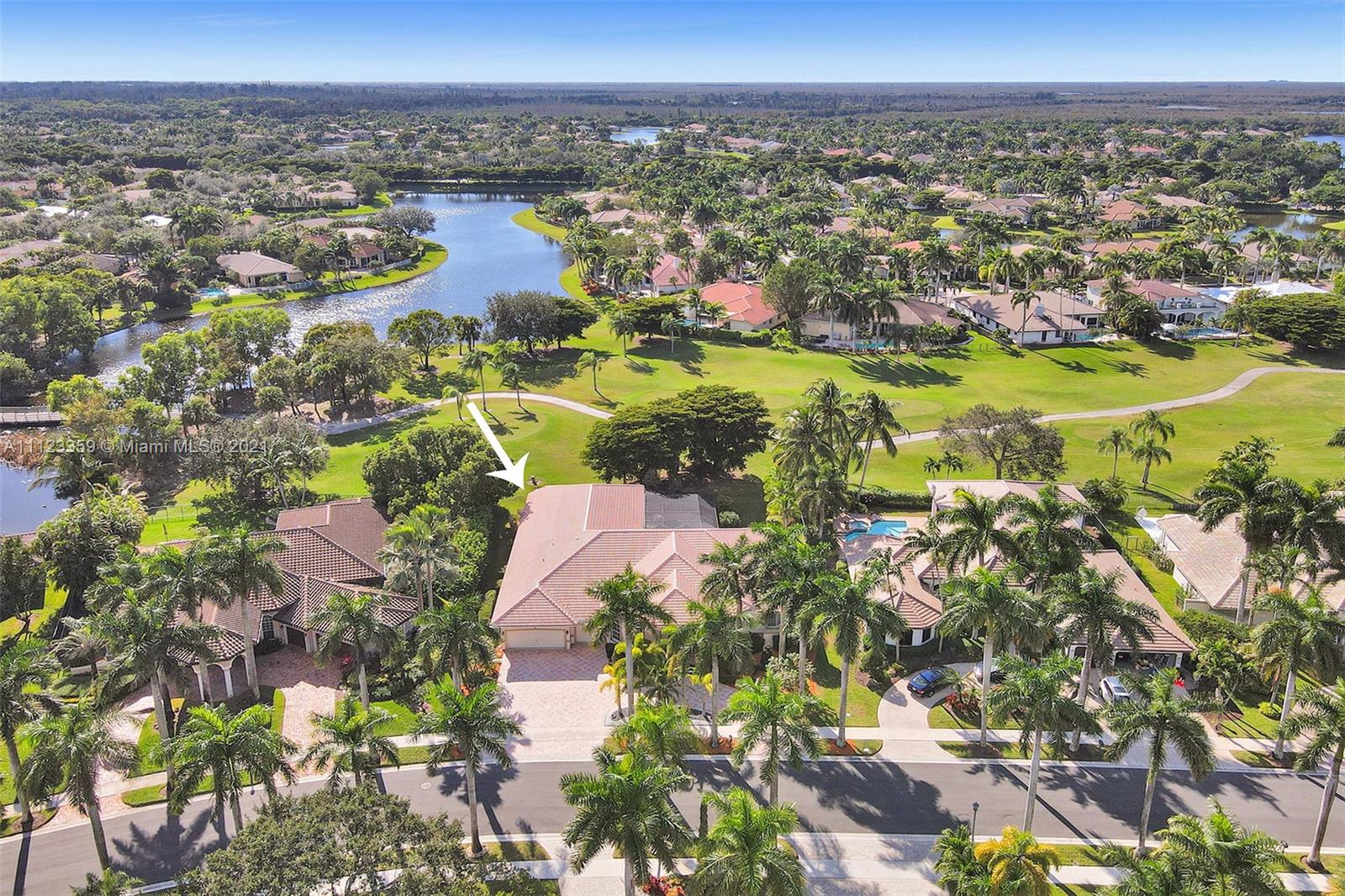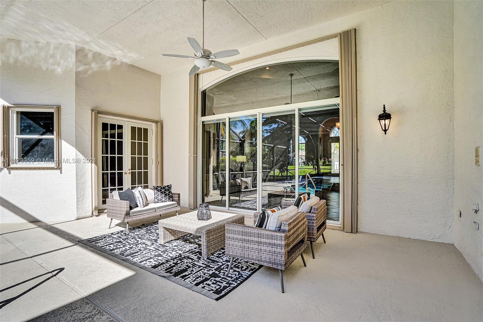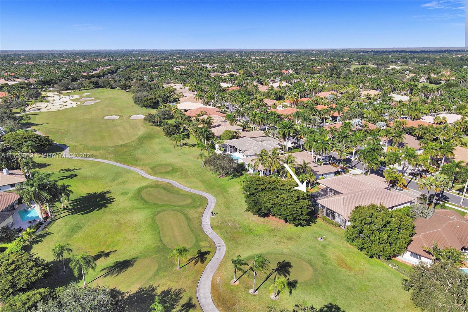 TUCKED ON A ROYAL PALM TREE LINED STREET. THIS MAGNIFICENT HOME BACKS TO GOLF WITH A SCREENED PATIO WITH POOL AND SPA. OVERSIZED 15,046 SQUARE FOOT LOT TO ENJOY. GRAND CIRCULAR PAVER DRIVEWAY WELCOMES YOU HOME. FULL ACCORDION PROTECTION. CUSTOM ONE STORY FRESHLY PAINTED IN TODAY'S NEUTRAL COLORS. PRIMARY BEDROOM HAS FRENCH DOORS TO THE POOL AND PATIO. TWO SPACIOUS CLOSETS WITH A RENOVATED BATH, DUAL SINKS, OVERSIZED SHOWER. KITCHEN WITH MAPLE WOOD CABINETS AND GRANITE COUNTERTOPS. NEUTRAL TILE FLOORING THROUGHOUT LIVING AREAS. GRAND BILLIARD/PLAYROOM (CAN BE CONVERTED TO BEDROOM) PLUS CABANA BATH.