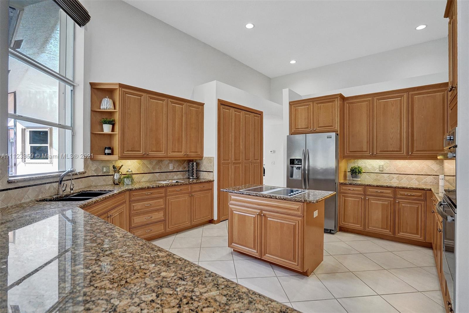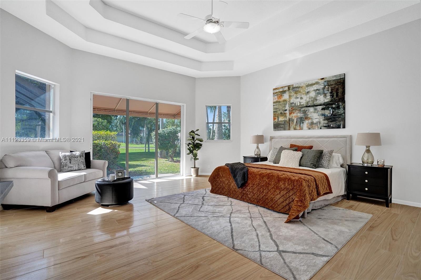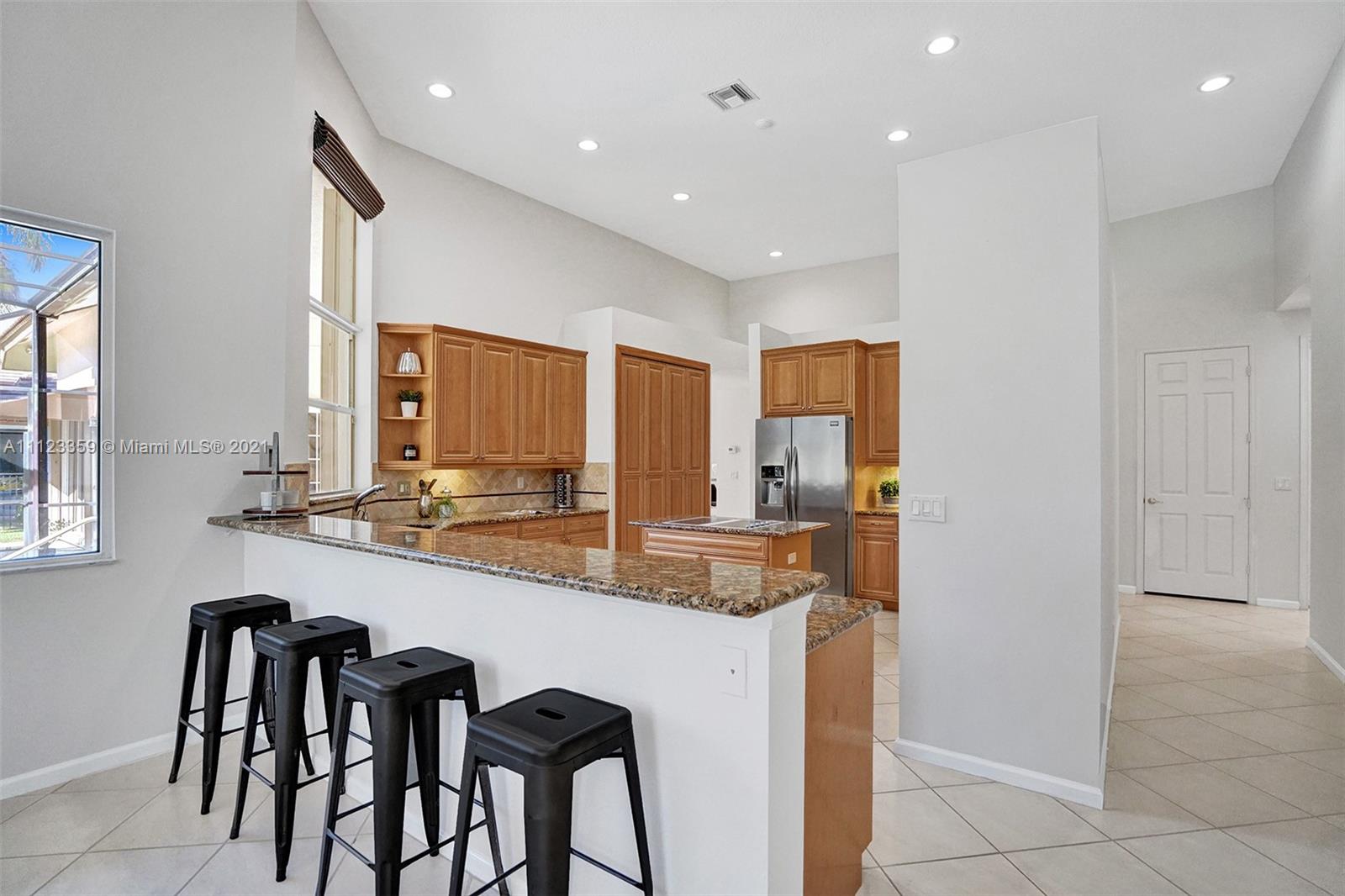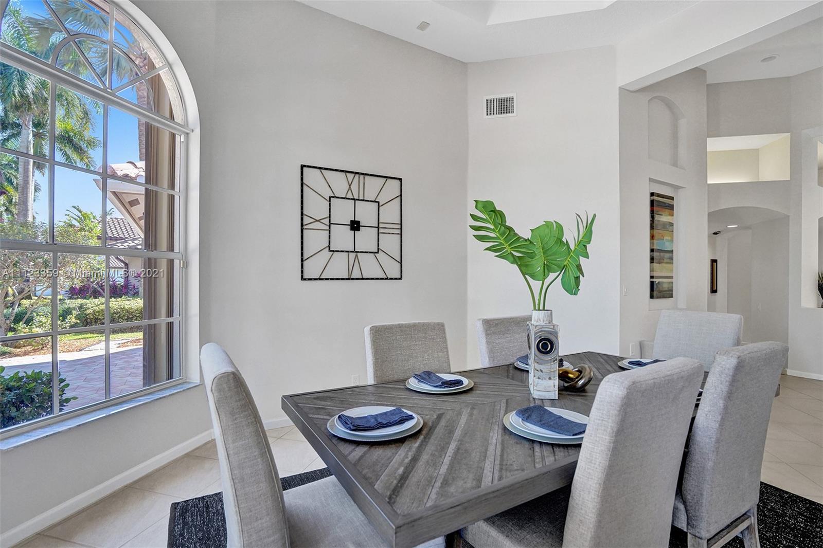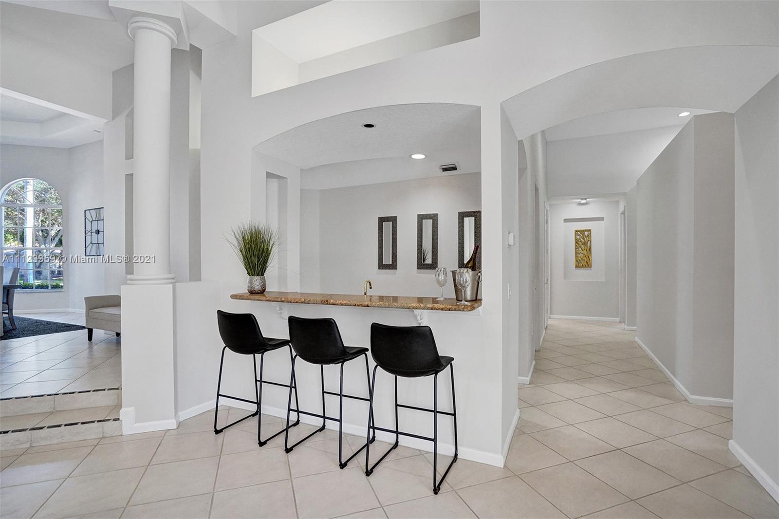 TUCKED ON A ROYAL PALM TREE LINED STREET. THIS MAGNIFICENT HOME BACKS TO GOLF WITH A SCREENED PATIO WITH POOL AND SPA. OVERSIZED 15,046 SQUARE FOOT LOT TO ENJOY. GRAND CIRCULAR PAVER DRIVEWAY WELCOMES YOU HOME. FULL ACCORDION PROTECTION. CUSTOM ONE STORY FRESHLY PAINTED IN TODAY'S NEUTRAL COLORS. PRIMARY BEDROOM HAS FRENCH DOORS TO THE POOL AND PATIO. TWO SPACIOUS CLOSETS WITH A RENOVATED BATH, DUAL SINKS, OVERSIZED SHOWER. KITCHEN WITH MAPLE WOOD CABINETS AND GRANITE COUNTERTOPS. NEUTRAL TILE FLOORING THROUGHOUT LIVING AREAS. GRAND BILLIARD/PLAYROOM (CAN BE CONVERTED TO BEDROOM) PLUS CABANA BATH.