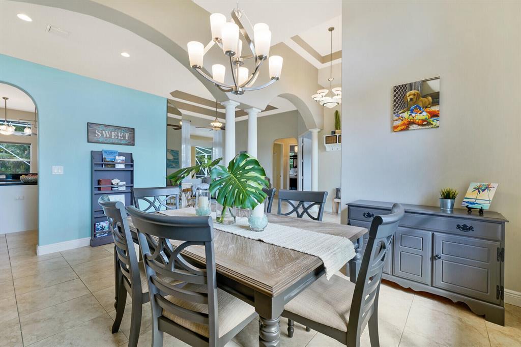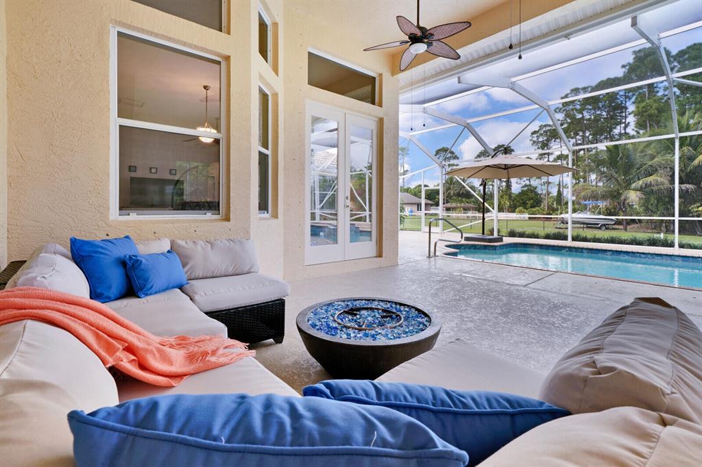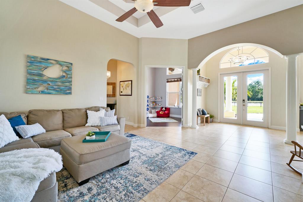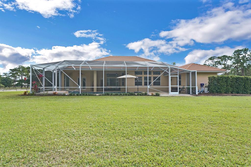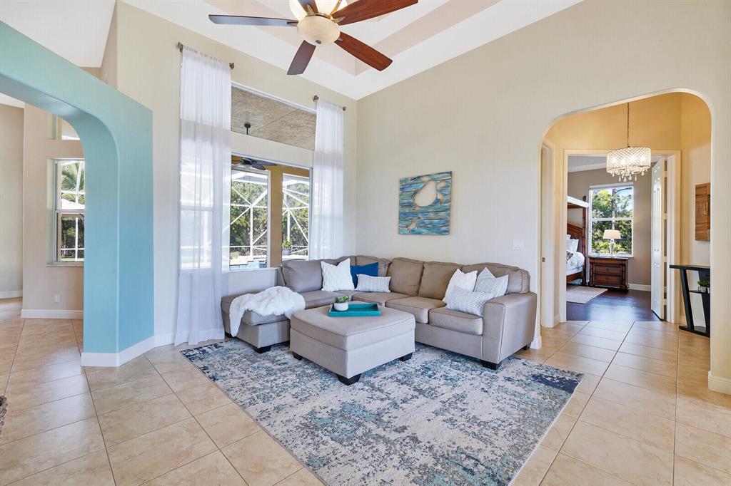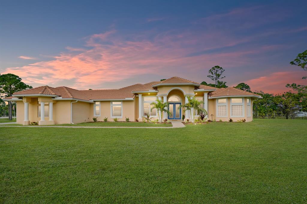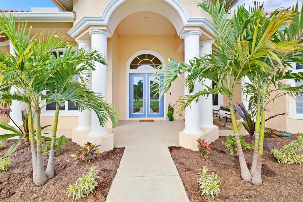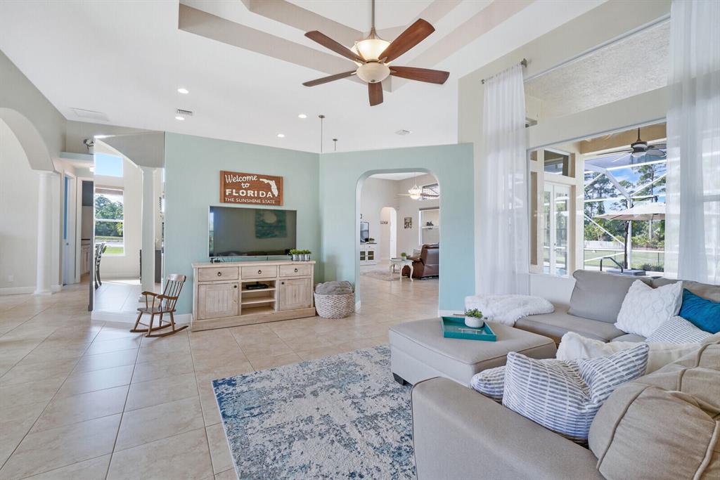 Are you seeking a spacious Floridian home with Smart home features, a sparkling saltwater swimming pool, and a luxe primary suite? Look no further! Supremely located just off a paved road on an enormous and a fully-fenced 2.19-acre corner lot, this 5 bedroom (plus den)/4.5 bathroom, 3,234sqft (under-air) residence conveys immense curb appeal with Mediterranean architecture, tropical landscaping, and a grand covered entrance. Elegantly styled for modern desires and preferences, the luminous interior embraces open concept living with a 3-way split floorplan, attractive ceramic tile flooring, a flood of shimmering natural light, a lovely den/office, and a fabulous formal living room boasting soaring double tray ceilings.