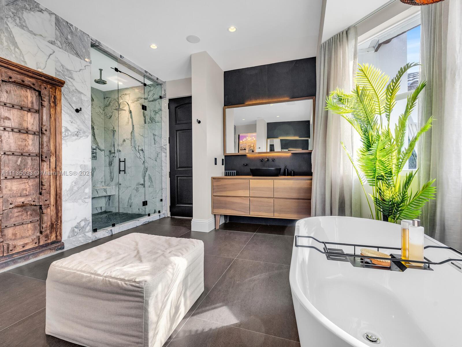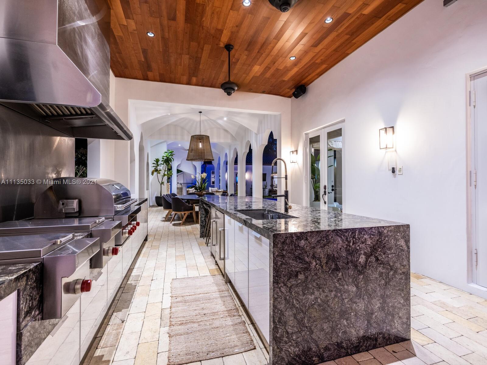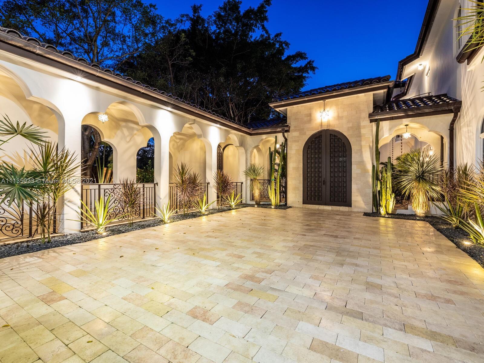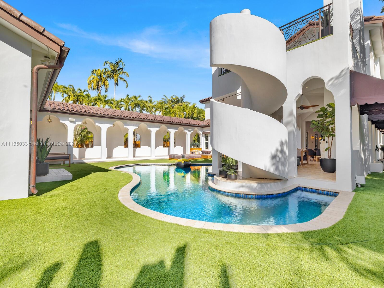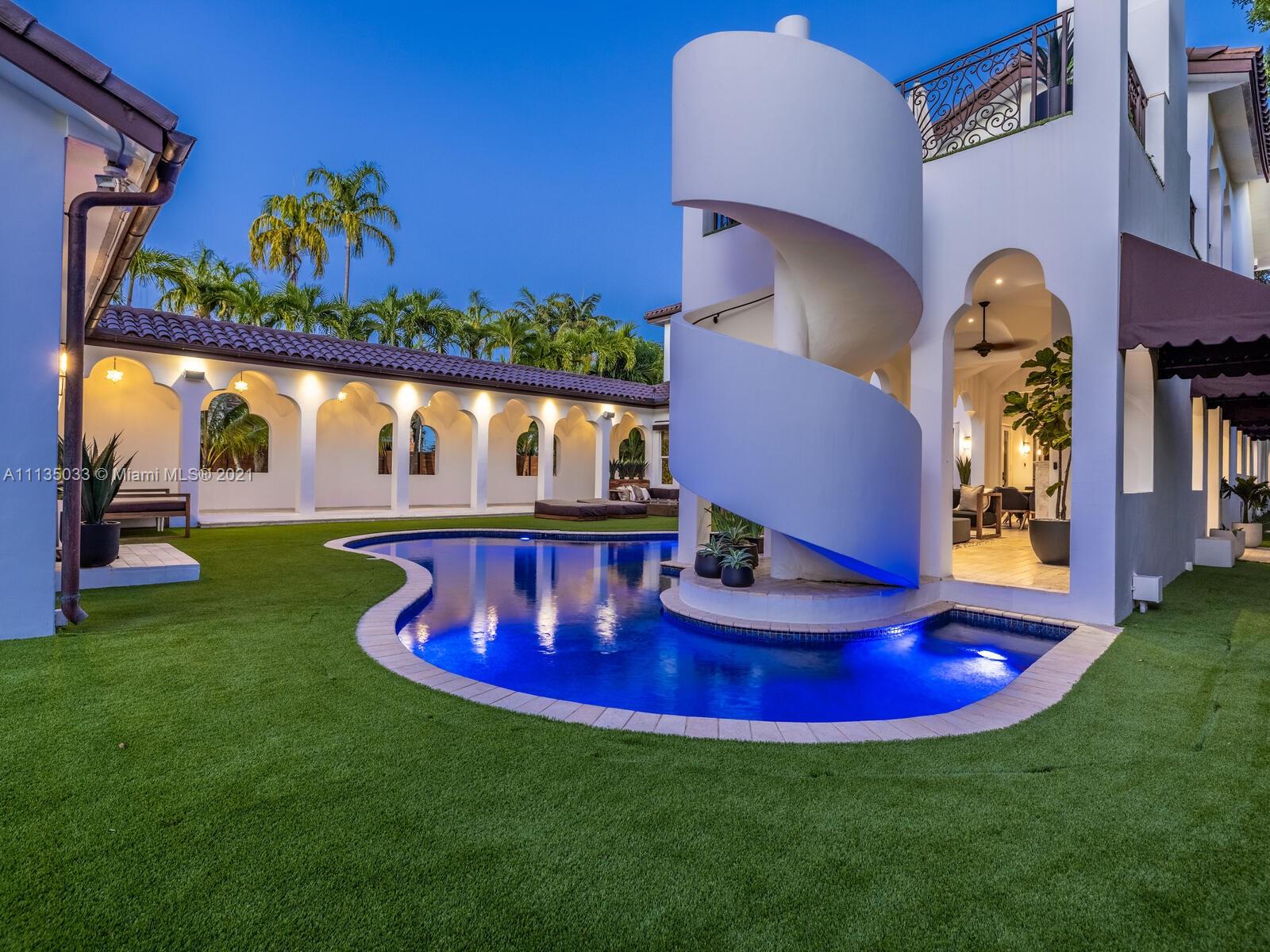This Modern-Mediterranean resort style home is expertly designed for Miami entertaining, including a 2-bed Guest house! Impressive arrival through oversized doors lead to hacienda inspired courtyard with custom water fountain and koi pond, complete with viewing deck. Highly coveted covered outdoor entertainment area including full outdoor Mia Cuccina kitchen with top appliances. All new lush landscape, premium turf, and light system installation. Spectacular Lagoon style pool curls around stunning outdoor spiral staircase leads to oversized loggia, perfect for sunset viewings. Extensive interior renovation-all new custom designer bathrooms, surround sound movie theatre, wine bottle display, and entertainment bar to name a few. Separate living quarters and plenty of parking.Turn-key estate.