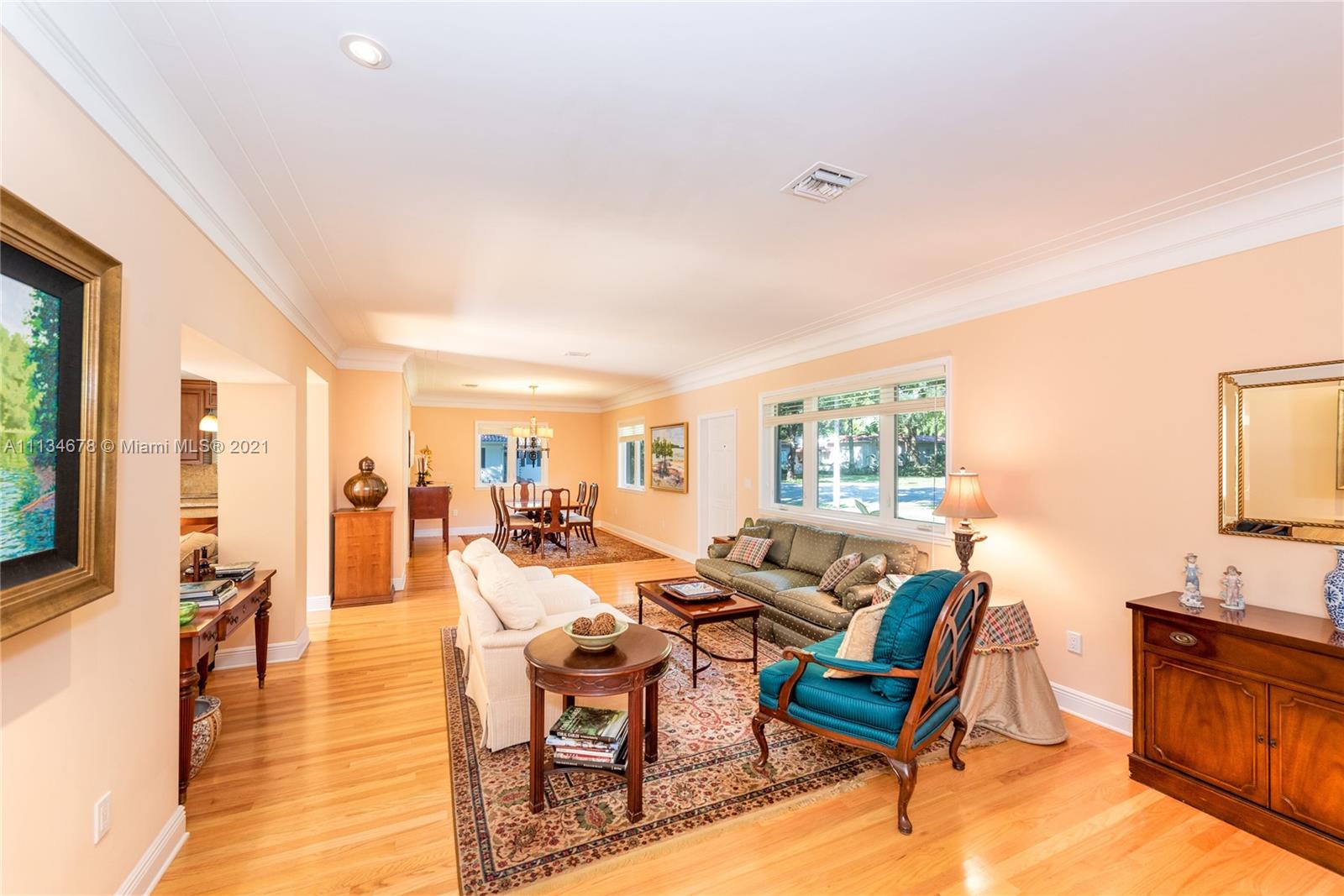 New Listing close to the Library in central Gables. This 4bdrm/4bath home has 3051 adj. sq. ft and sits on an 11,328-ft corner lot. Ready to move into with many charming features. Living room with decorative fireplace, Formal DR, newer kitchen with an island overlooks Family room. Two bedrooms with two baths in the front plus den and a spacious main suite that was an addition in the back. Lots of closets and storage space. Wood floors. The home is built around a courtyard which has a carport, garage, covered patio for entertaining, a guest room with a full bath, plus a putting green in the back yard. Pristine condition. Well located. Short closing possible. FIRM LIST PRICE OR HIGHER EXPECTED. This home has everything the current buyers are seeking. Offers accepted through Sunday, the 19th.