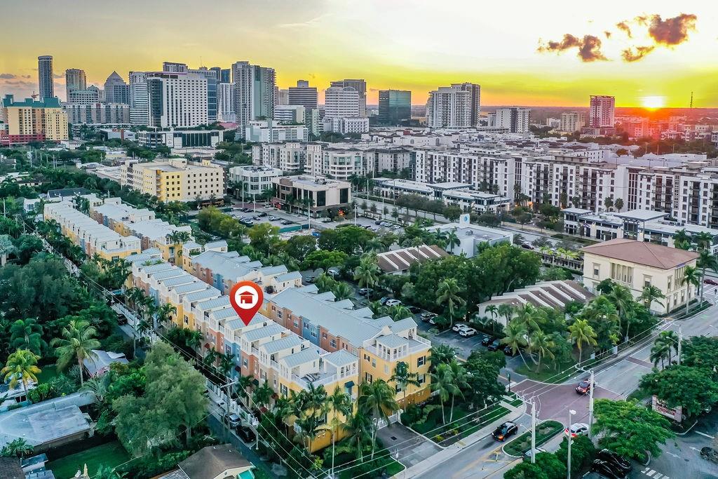 The Ellington in Victoria Park is in the heart of it all! This four level townhome offers one of the best values in Victoria Park. The 1st floor features a 2 car garage, office/den/guest room with ensuite bath. The entire home has been freshly painted and new carpeting installed on the 3rd level. The 2nd level offers volume ceilings, tile flooring, an open living/dining/kitchen area with great natural light to the east. Enjoy a GAS range/oven in the kitchen with stainless steel appliances and fresh white cabinetry. Dual primary bedrooms encompass the 3rd level with ensuite baths. The large rooftop terrace offers sweeping views from east to west! The fee simple townhome offers hurricane impact protection, a gas tankless water heater, a fabulous heated community pool, and gated entry!