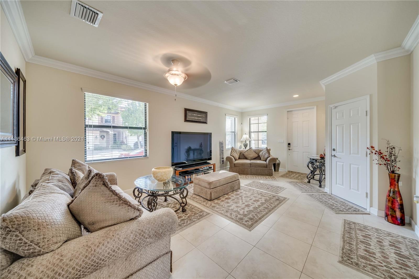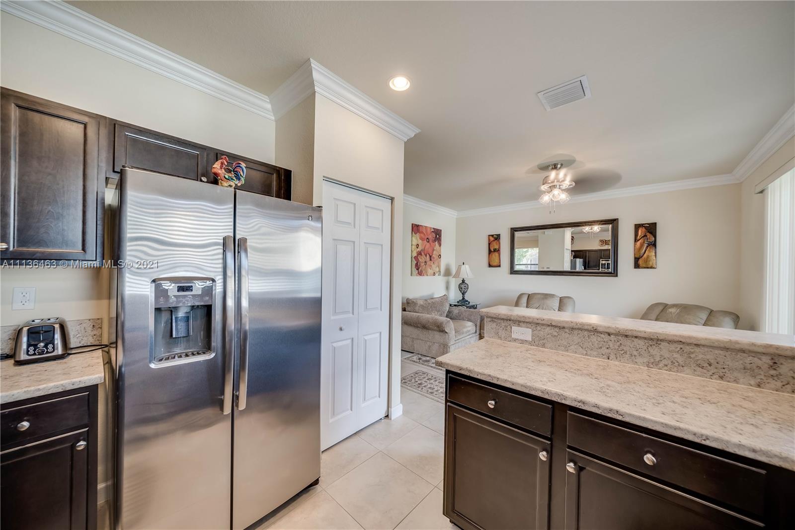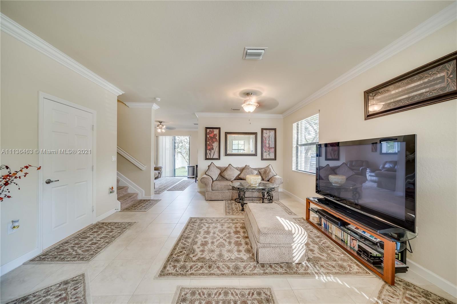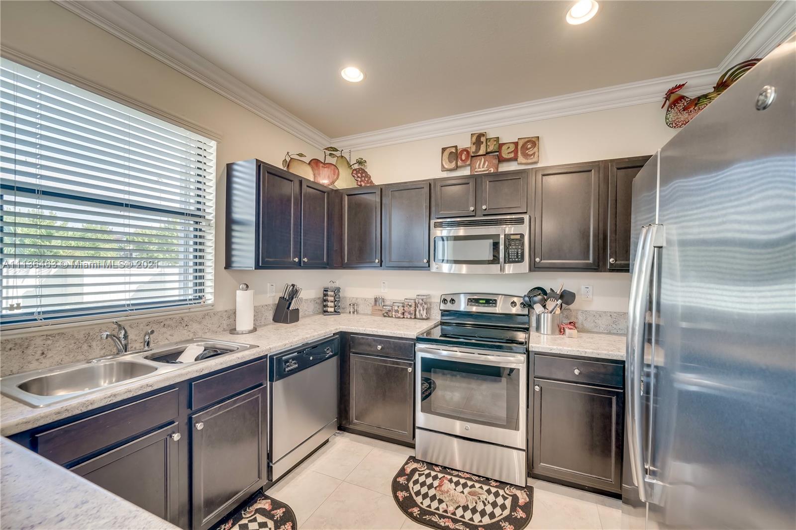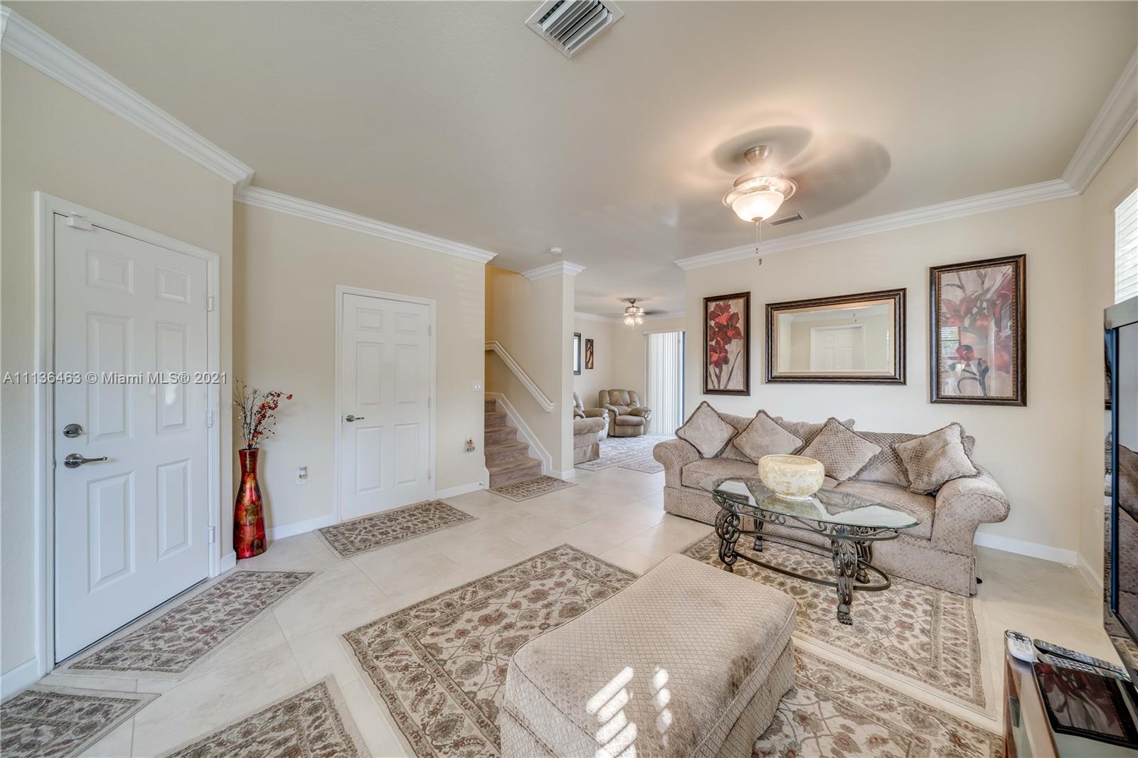 3 Bed 2 and 1/2 Bath 2 Story Corner Unit Townhouse with 1 Car Garage INTERIOR FEATURES: 18 Inch Tile throughout the Lower Level•6' Inch Baseboards and Crown Molding Up and Down•Fresh Neutral Interior Paint•Nice Big Front Room full of Windows•Separate Family Room•36' Dark Pine Cabinets•Stainless Steel Appliances•High Hat Lights•Snack Bar overlooks Family Room•Pedistal Sink in Half Bath•Raised Panel Interior Doors•Fully Carpeted Upstairs•2nd Floor Laundry•2 Walk In Closets•Large Bedrooms•Upgraded Shower Tile n 2nd bath•Master with Tray Ceiling & Double Crown•Dual Sinks in Master•Master Shower with Glass Doors EXTERIOR FEATURES: Complete Set Accordion Shutters•Fenced Backyard•2 Car Wide Large Paver Driveway•Covered Front Entry•Concrete Landscaping Boards•Nearby Guest Parking•Gated Community