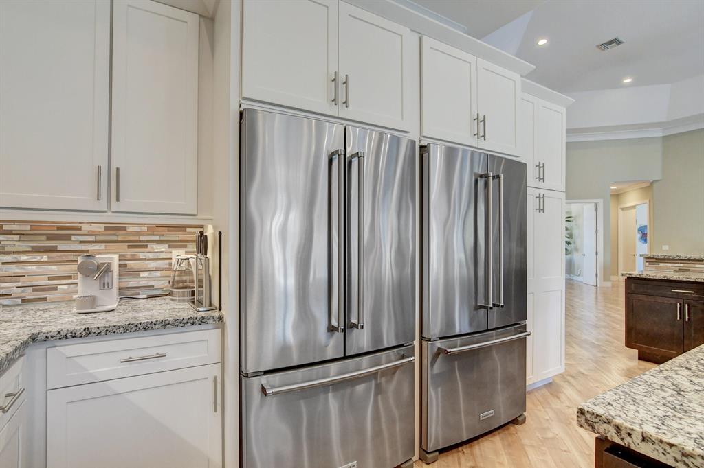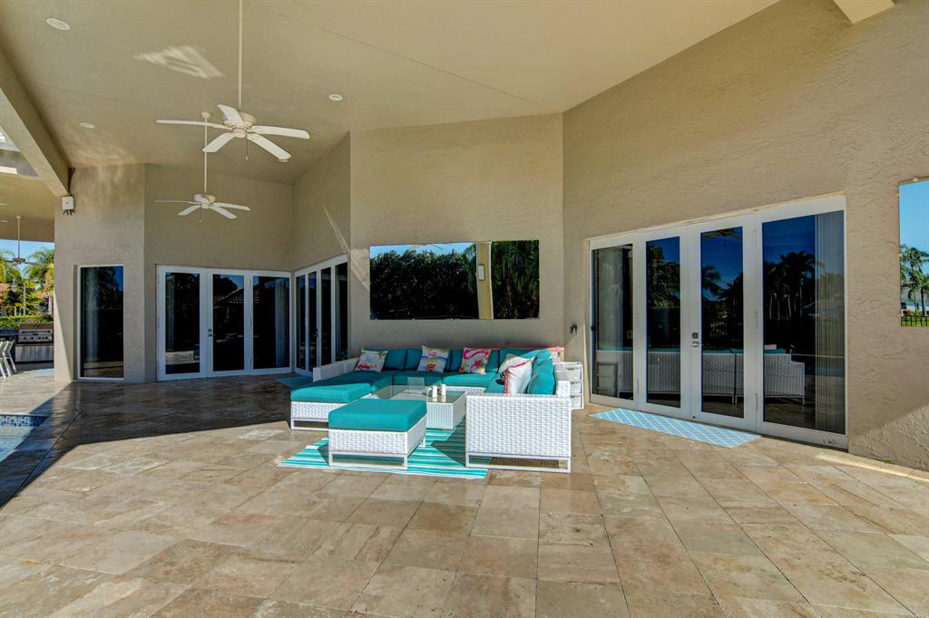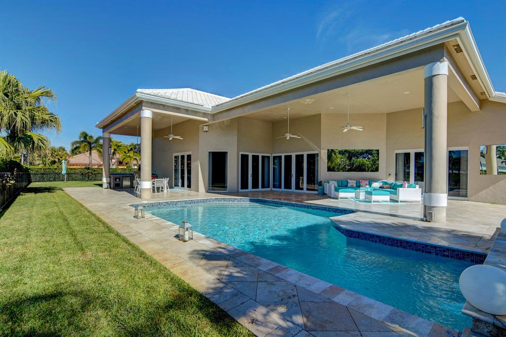 Spectacular! Completely renovated, like new construction, 4703 square feet of perfection on almost half an acre, overlooking lake. Spacious chefs kitchen with gas stove, two fridges, two sinks, two dishwashers! Separate office (could be 4th bedroom) separate dining room. Two primary bedrooms, split bedrooms all ensuite, large laundry room, two decorative fireplaces, open concept for entertaining & easy living. Gorgeous huge backyard with summer kitchen, heated spa & pool, covered & open patio & grassy yard for playing or pets! Roof & impact windows 2015. Bocaire Country Club mandatory membership - only 239 homes boasts resort style amenities, championship golf course, tennis, fitness, high end dining & a friendly community. A rated schools, close to beach, restaurants, shopping.