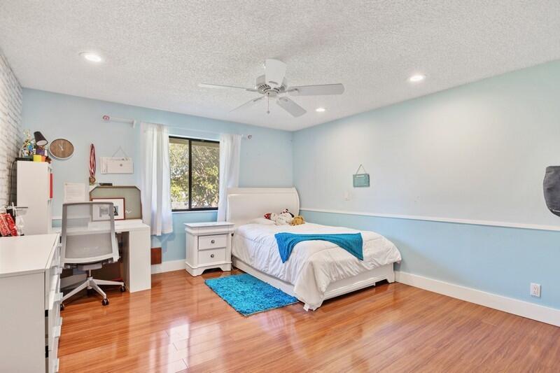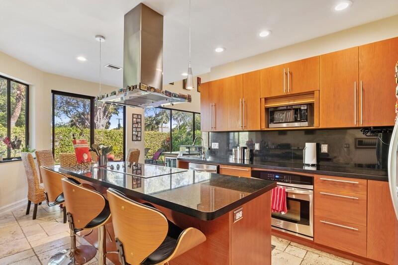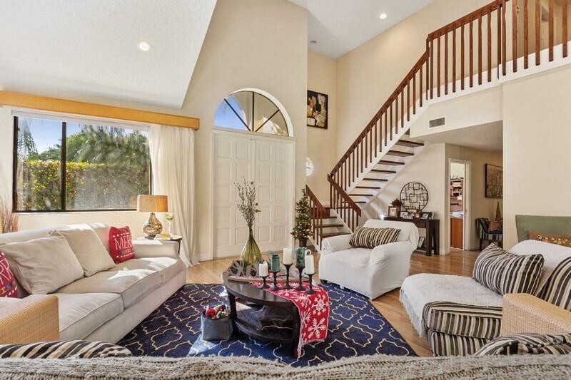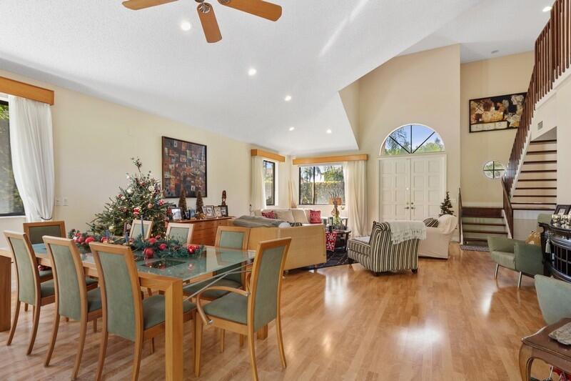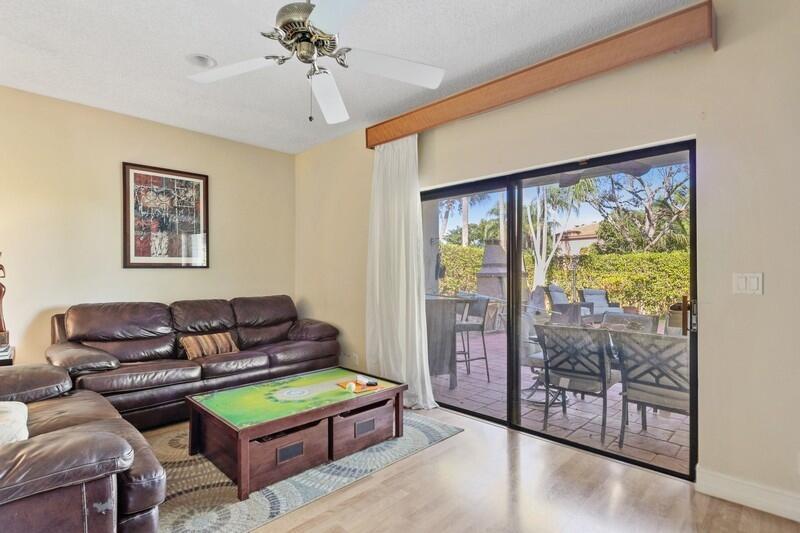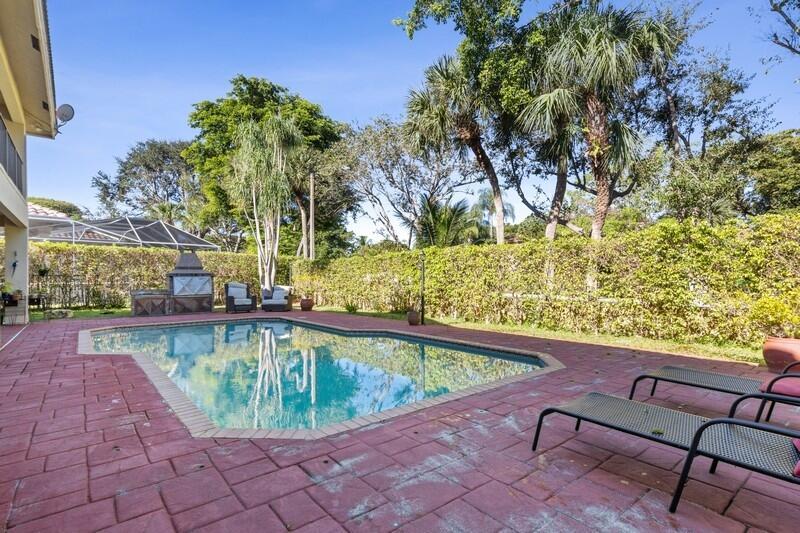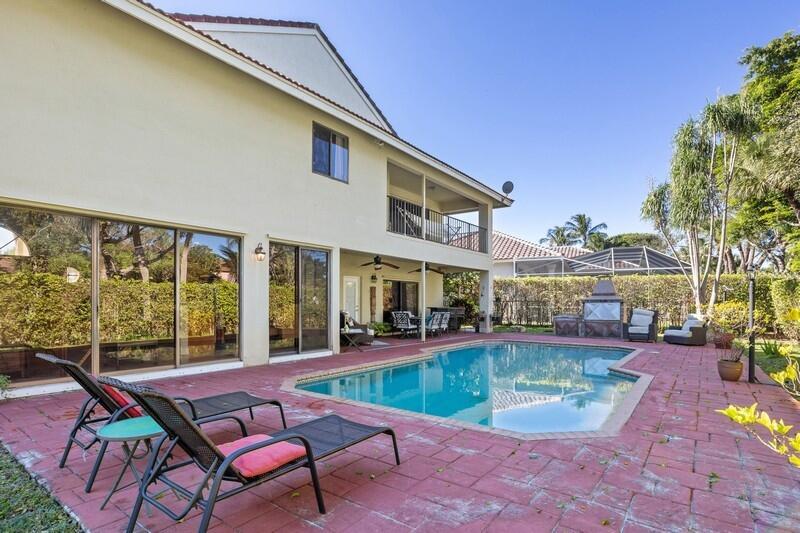 Rarely available opportunity at secluded Cloisters of Boca Raton. 4 bedrooms plus an office and a bonus den room, 3 full bathrooms. Large front yard and private, hedged, fenced backyard. Private pool. Custom build Argentinian brick grill. Updated floors, kitchen and bathrooms. Two newer A/C units. Master bedroom and two other bedrooms upstairs. One bedroom, an office, a den and full cabana bathroom downstairs. Soaring ceilings. Master bedroom has a covered outdoor balcony. Gated community in SE Boca Raton.