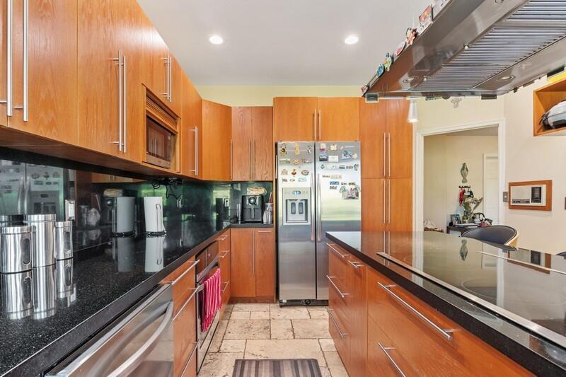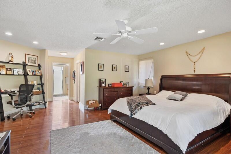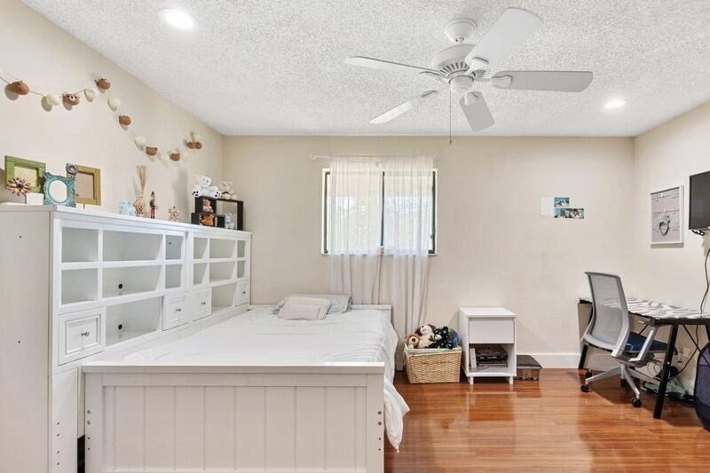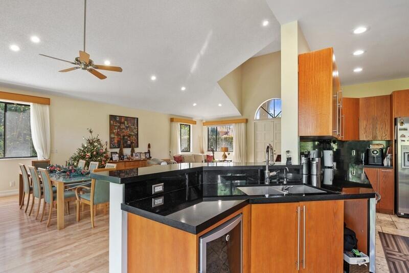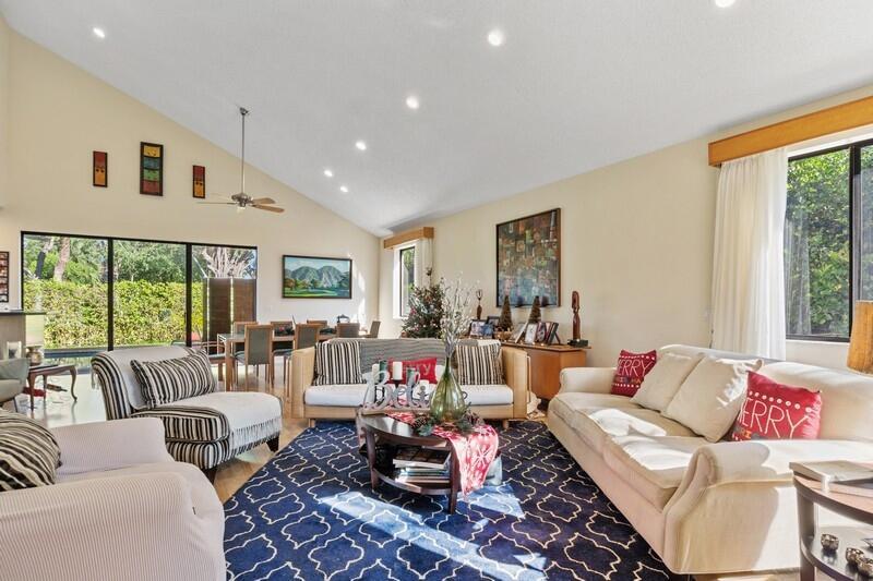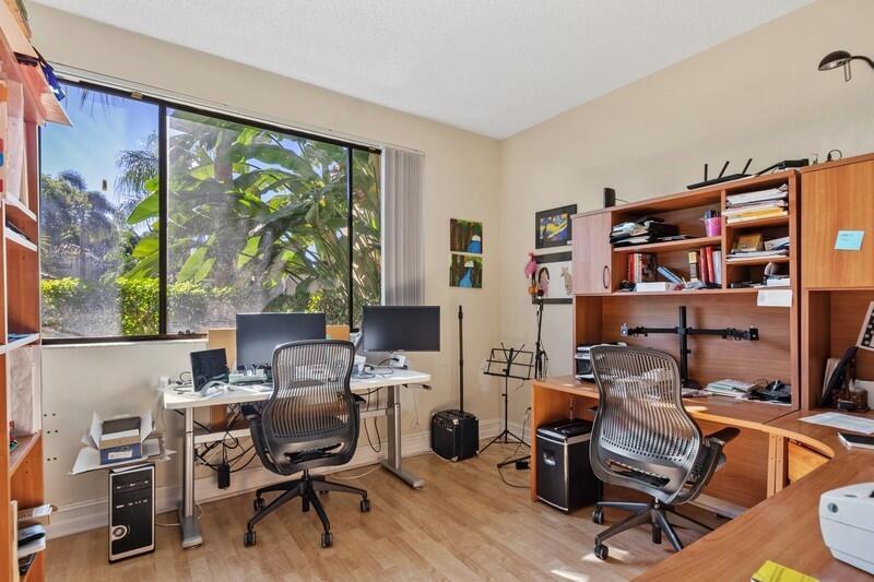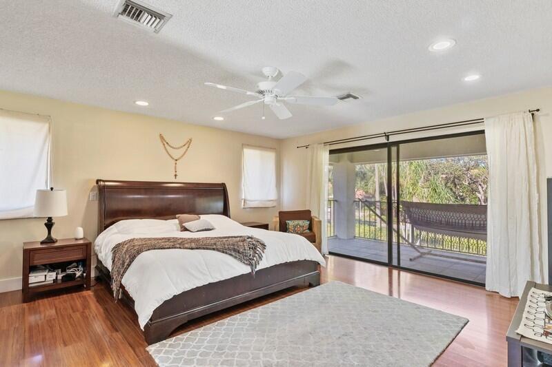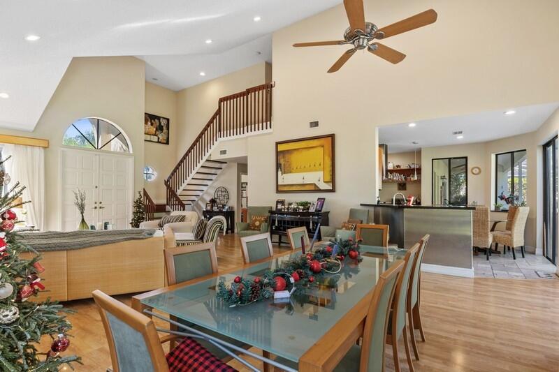 Rarely available opportunity at secluded Cloisters of Boca Raton. 4 bedrooms plus an office and a bonus den room, 3 full bathrooms. Large front yard and private, hedged, fenced backyard. Private pool. Custom build Argentinian brick grill. Updated floors, kitchen and bathrooms. Two newer A/C units. Master bedroom and two other bedrooms upstairs. One bedroom, an office, a den and full cabana bathroom downstairs. Soaring ceilings. Master bedroom has a covered outdoor balcony. Gated community in SE Boca Raton.