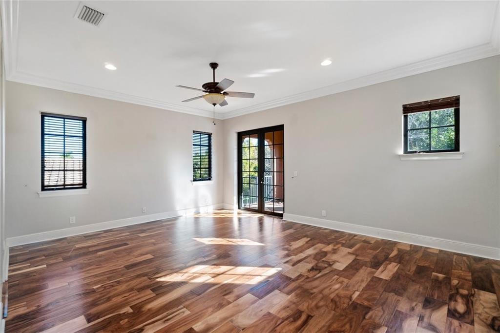 This beautiful home with 5 bedrooms + den is sited on a lot backing up to serene & lighted water features. Captivating curb appeal with wrought iron gates, courtyard/motor court with fireplace, balcony, arches & manicured landscape. Sun-Drenched formal living areas with walls of glass doors leading to intimate outdoor living areas & gardens. Large family room/kitchen area features a spacious island kitchen with painted wood cabinetry, double oven, granite & a sunny breakfast room surrounded by glorious windows. Luxurious Owner's suite with spa-like bathroom & balcony overlooking the backyard & waterfalls. An impressive staircase, soaring ceilings & walls of windows add to the home's splendor. Other offerings: 1st-floor guest suite, large backyard with room for a pool & impact windows/doors