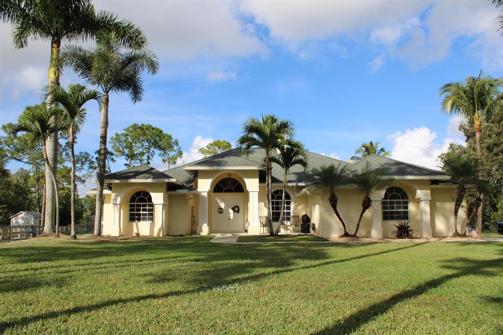 If you are looking for peace and tranquility then you just found your new home! This beautiful 4BR/3BA pool home in The Acreage is fully fenced and gated. This lot has an ideal location at the end of the street and next to a canal for added privacy, with a 1.31 acre manicured and landscaped land, which even includes a horse paddock. Enjoy the warm Florida sunshine by the beautiful pool/spa with salt chlorination and top quality travertine decking. This split floor plan features three guest rooms on one side of the home with the master suite on the other. The updated kitchen opens to the family room for entertaining your family and friends. A lovely wood burning fireplace adds to the ambiance in the living room.