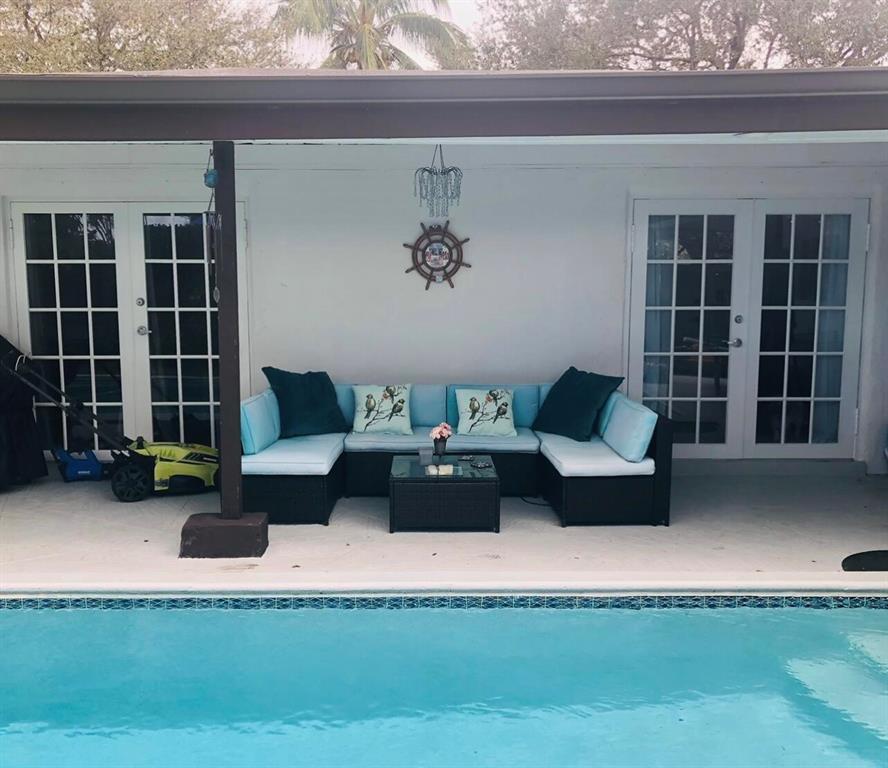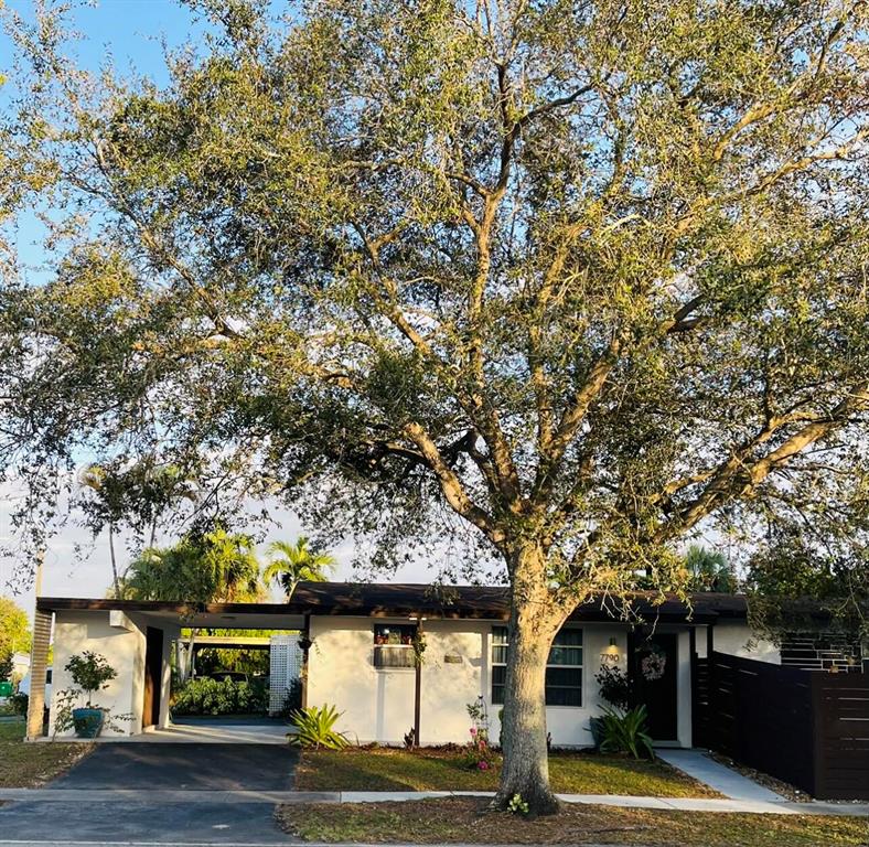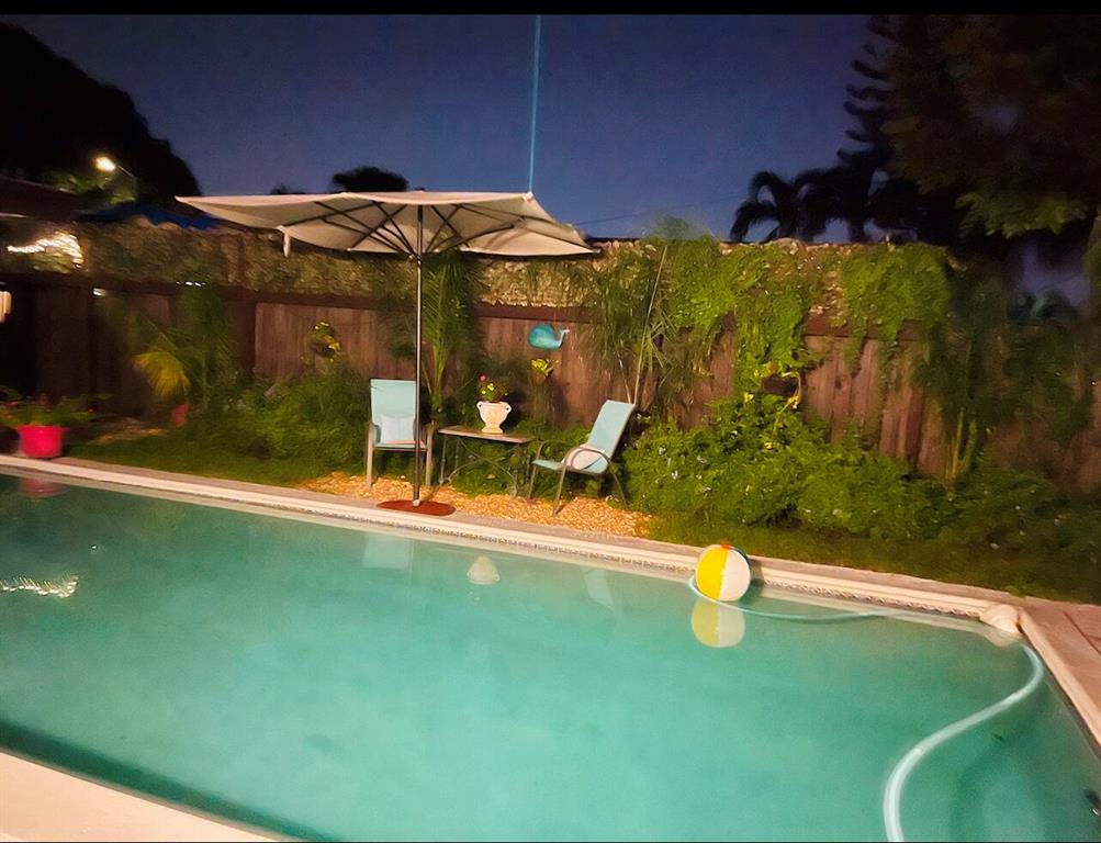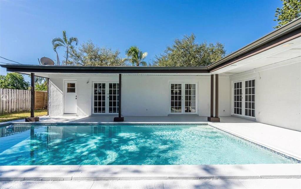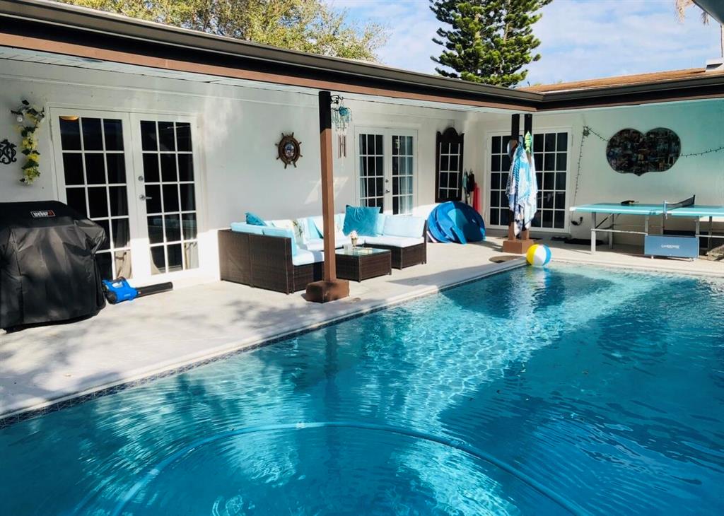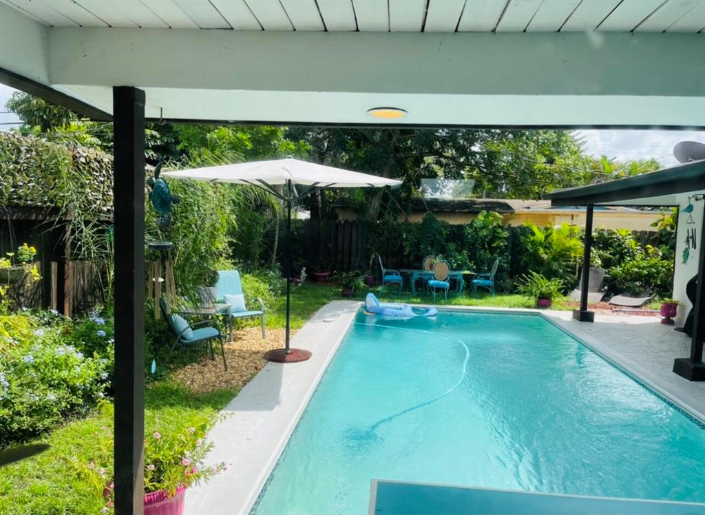 Luxurious Pool House on Covered Drivethrough Corner Lot featuring Open Kitchen / Dining / Living Split Bedroom Plan with Large Quartz Countertop, Deep Farm Sink, Elegant Recessed Lighting inside and poolside, Beautiful Bathrooms, 3 sets of French Doors showcasing Stunning Poolside Views from Both Bedrooms, Livingroom, Diningroom and Master Bath with an Amazing Flow from South Wing to East Wing. Self-cleaning pool vacuum, ping pong area, views of towering oaks, palm trees, bougainvillea, hibiscus, jasmine, crotons, bromeliads and more!!! Just off University and 33rd, close to Publix, Target, Restaurants. Ideal for modern living. Nightly laser stream poolside from Hard Rock Billion Dollar Guitar Hotel