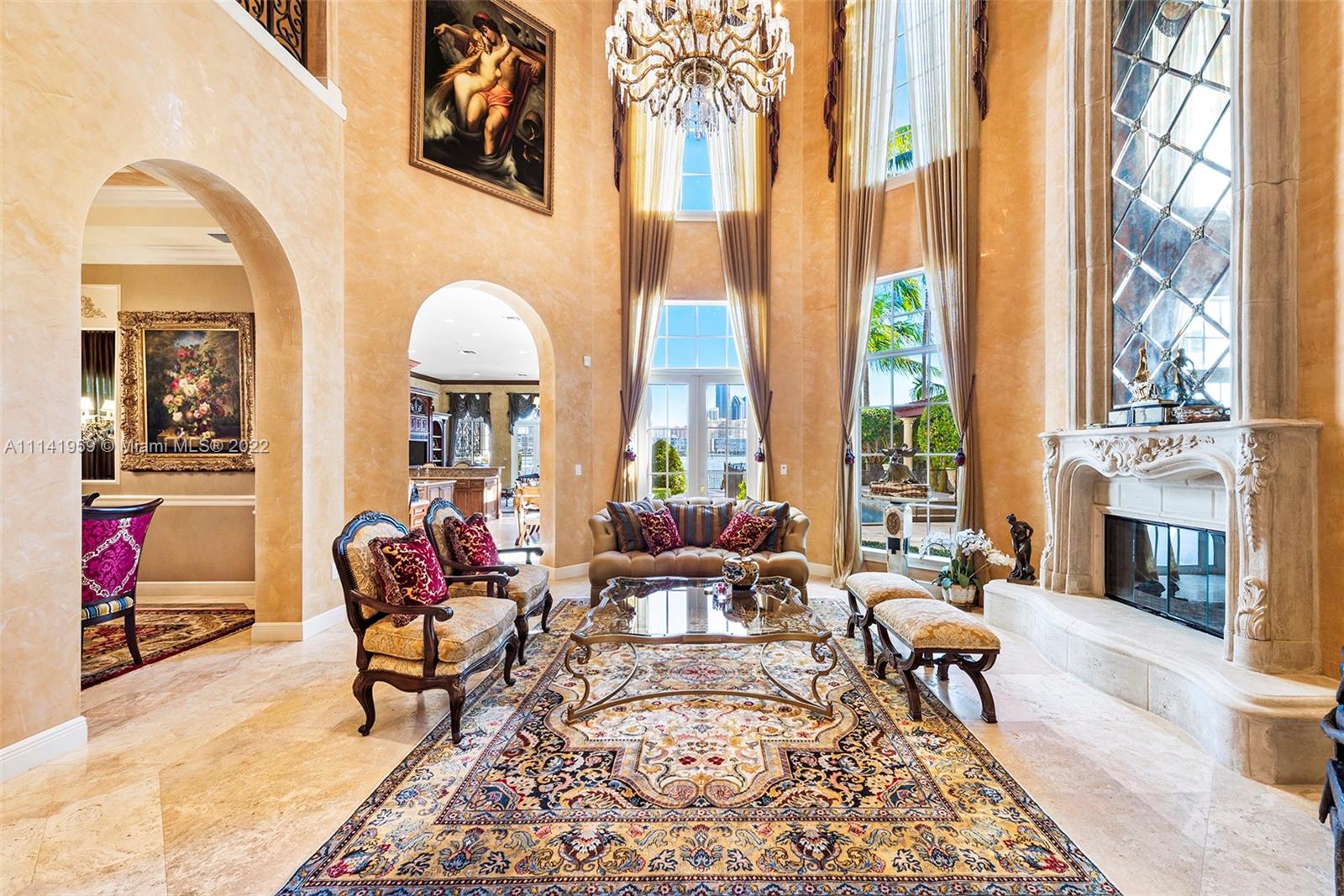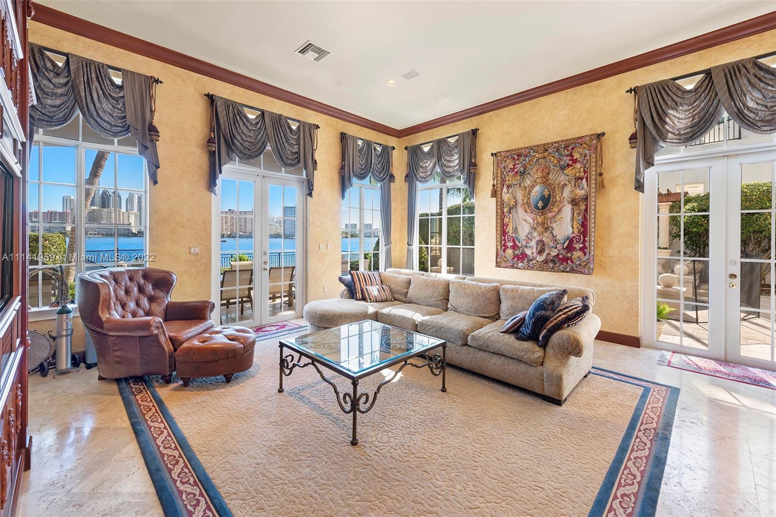 First time on the market, this beautiful waterfront home in Island Estates is in the best location with incredible views of the open bay and Sunny Isles Skyline. Over 5426 SF of living space with high ceilings, formal dining and living rooms with open kitchen to large family room and gorgeous outdoor entertaining area featuring extended deck, pool and jacuzzi and summer kitchen and fireplace. Residence has beautiful designer details throughout, marble floors and massive master bedrooms closets, with en-suite bedrooms on the second floor. Home has a two car garage, interior elevator and a boat slip in the private Prive marina.