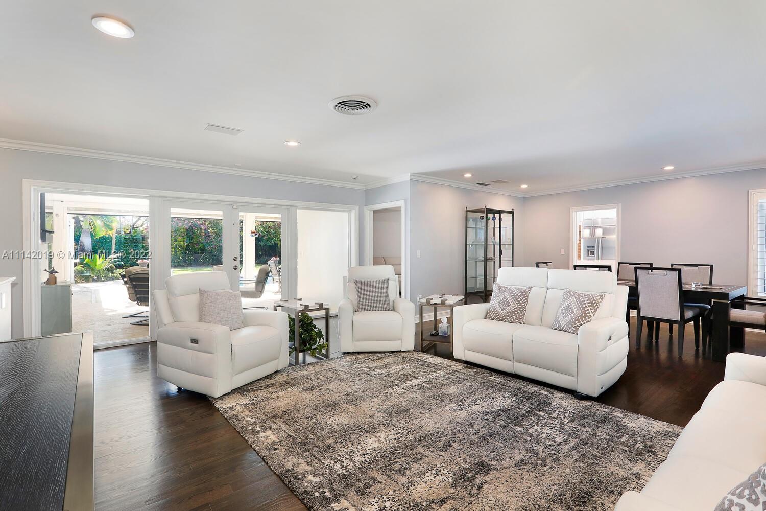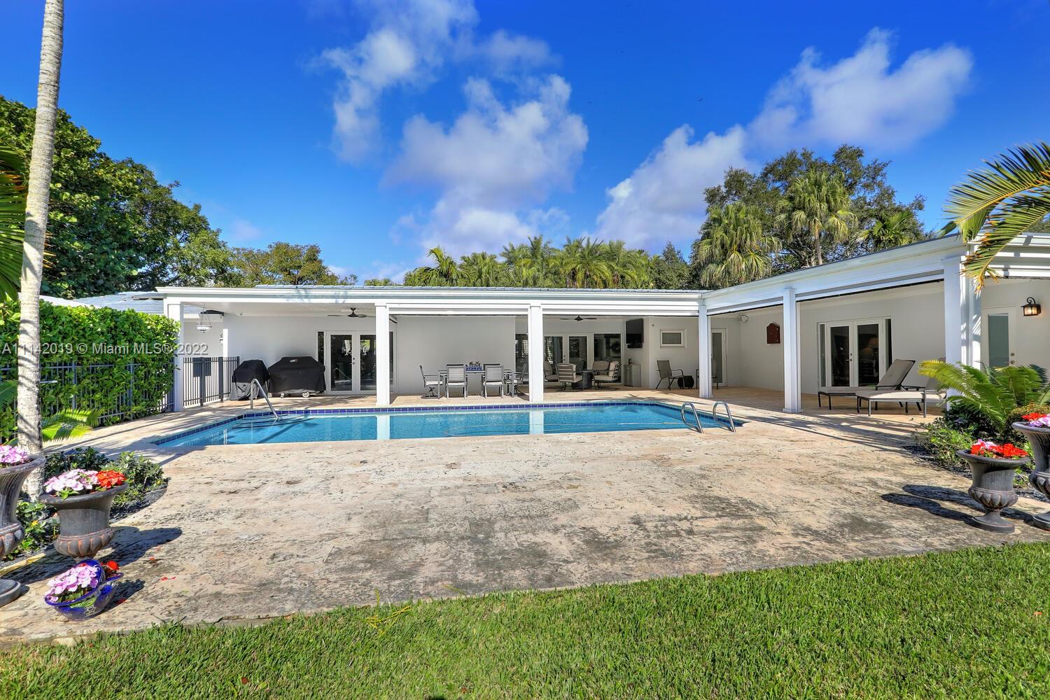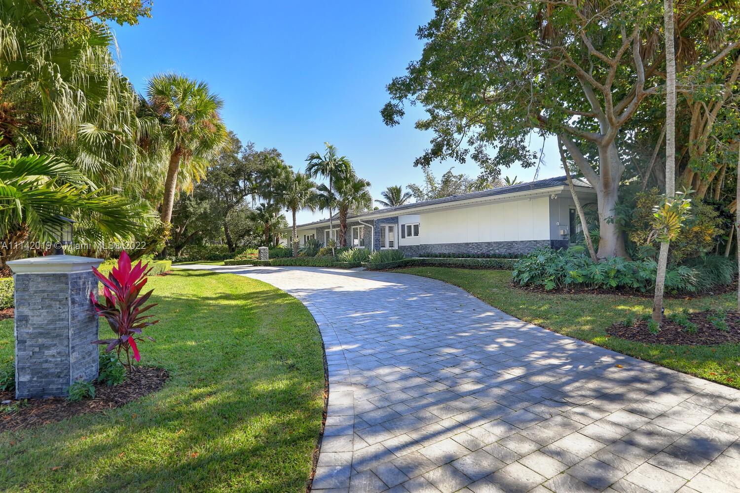 Exclusive Pine Bay Estates, rarely a home listed for sale in this small community in South Coral Gables. This mid-century ranch, sitting on a 3/4 acre corner lot has been meticulously updated to today's standard of living. 4 bedroom and 3 baths with complete hurricane protection including newly installed high impact glass windows and doors. Total Sonos sound package provides entertainment inside and out. The newly resurfaced salt water swimming pool has a Diamond Bright interior. Set way back off the street, the newly done circular driveway was paved with brick pavers. The huge backyard can be enjoyed through walls of glass or by using the large entertaining screened in porch next to the pool. The screen panels can be raising or lowered electronically with a remote. Enjoy the privacy!