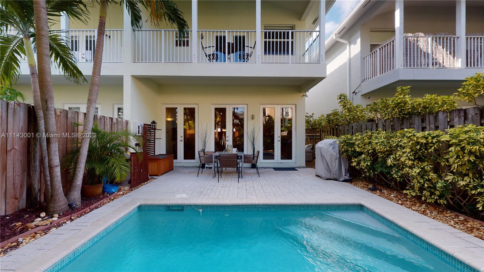 Well maintained 3 bedroom, 2.5 bath town home with a private pool in the Grove. Travertine marble and wood floors. High ceilings. Impact doors and windows. Covered patio. Heated pool. Open kitchen with upgraded SS appliances and granite countertops. One car garage plus gated parking space. Second floor has three nice size bedrooms, four walk in closets and a large loft area with lots of natural light which is excellent for home office, play area or sitting room/den. Large covered balcony in the master bedroom, overlooking the private pool. Another nice size balcony in the front overlooking the courtyard. Low maintenance fee which includes the building insurance and management. Interior and exterior TV cameras. Not in a flood zone. Walking distance to Downtown Coconut Grove