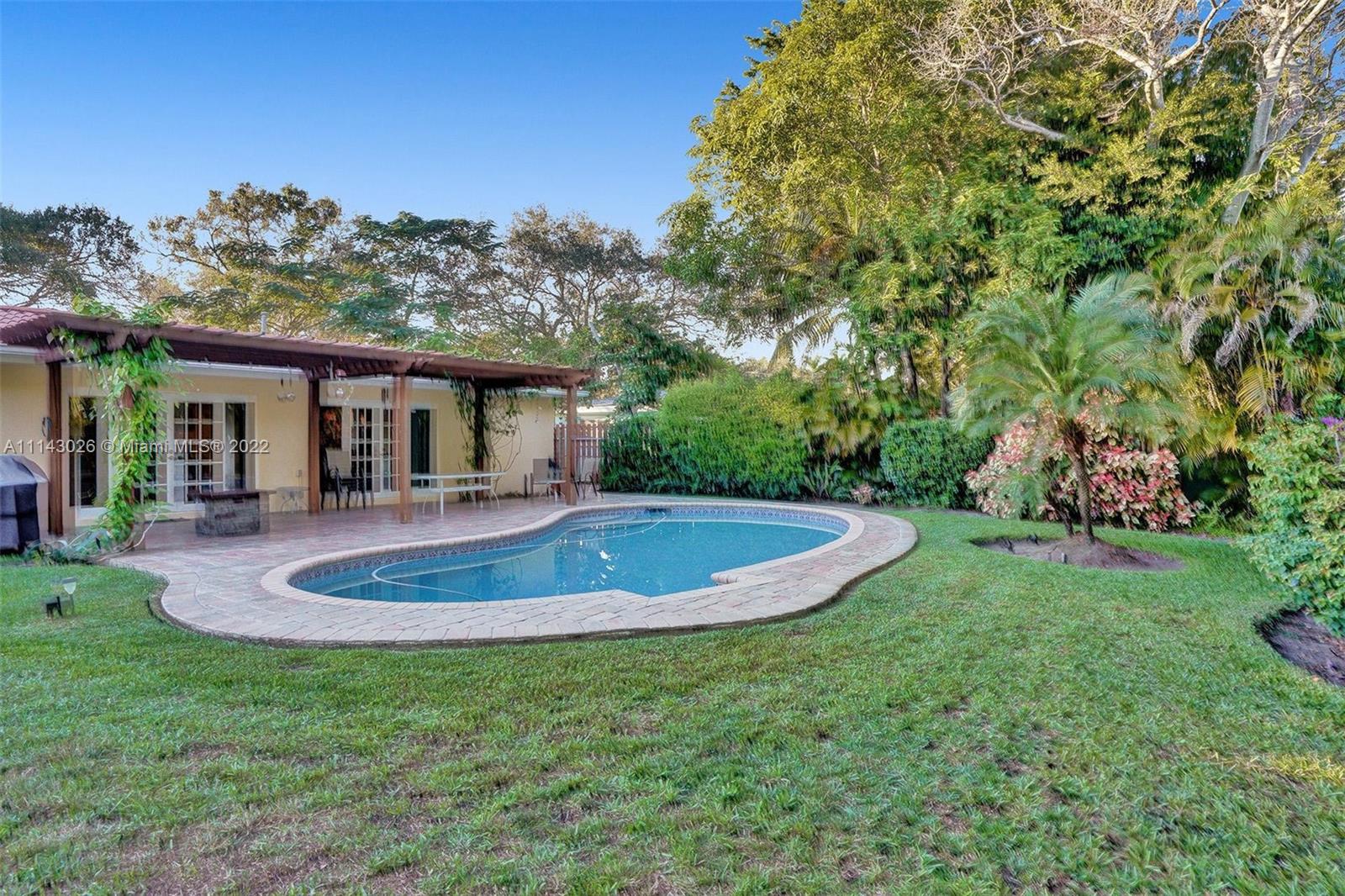 After passing the pristine front landscape, you’re ushered inside into the open-concept living area with vibrant tile flooring, and tons of natural light. Around the corner, you’ll find the quaint dining area and the galley-style kitchen with granite countertops and solid wood cabinets. Relax and unwind in the primary bedroom, which boasts a magnificent, updated ensuite bath and plenty of closet space. The four remaining bedrooms give you plenty of space; each room has either new wood like flooring or carpet, and the rear bedroom, includes a walk-in closet, a full cabana bath with access to the back patio. Behind the home you’ll find a large pergola, an outdoor hot/cold shower, paver patio and custom in-ground pool.