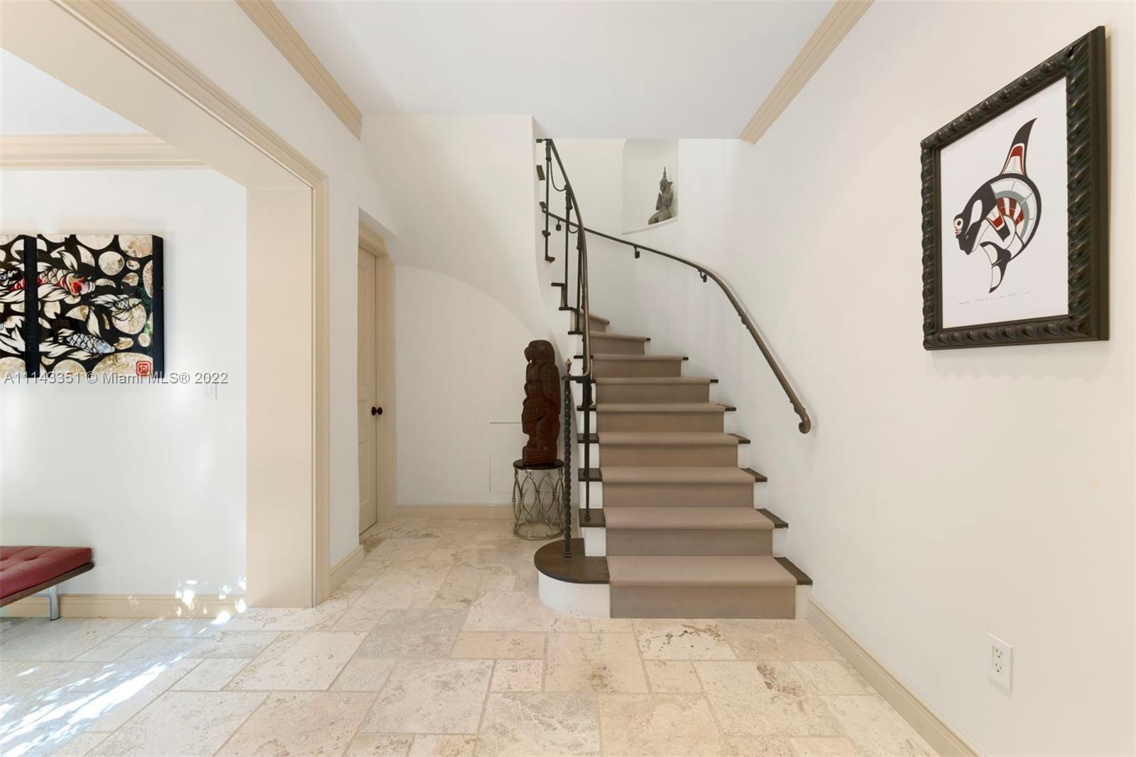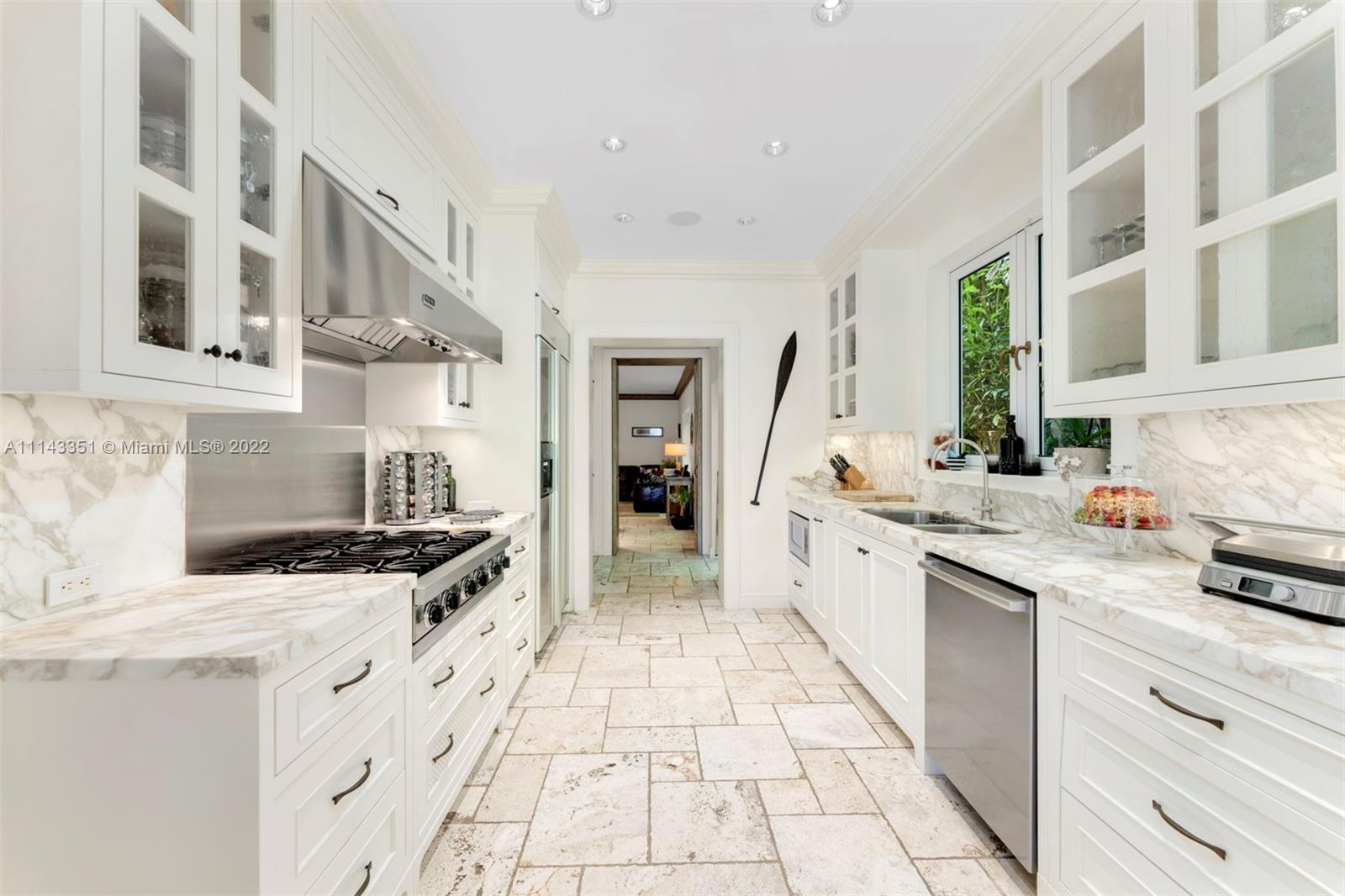 Enjoy coveted Sunset Island living in this beautiful 2 story WF residence on Sunset Island IV, the most walkable of the 4 Islands. Enter through private gates to a circular driveway leading to a magnificent verdant courtyard garden that opens to a 6BD,5+1BA home. 15,750 SF lot, 75’ WF, private dock, boat lift, natural light through entire home, fine marble & hardwood floors, large hurricane impact La Finestra windows. Renovated gourmet kitchen w/ top-of-the-line appliances, formal dining room, expansive bedrooms, spa-like principal bathroom, walk-in closets, guest house & 2 car garage. Outdoors curated for entertaining surrounded by greenery of soaring hedges w/ an oversized pool, summer kitchen & your very own sand beach complete w/a bench swing to sway along w/ the calming ocean breezes.