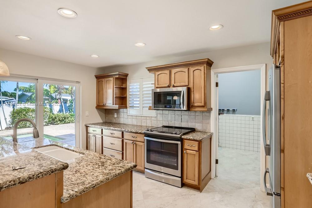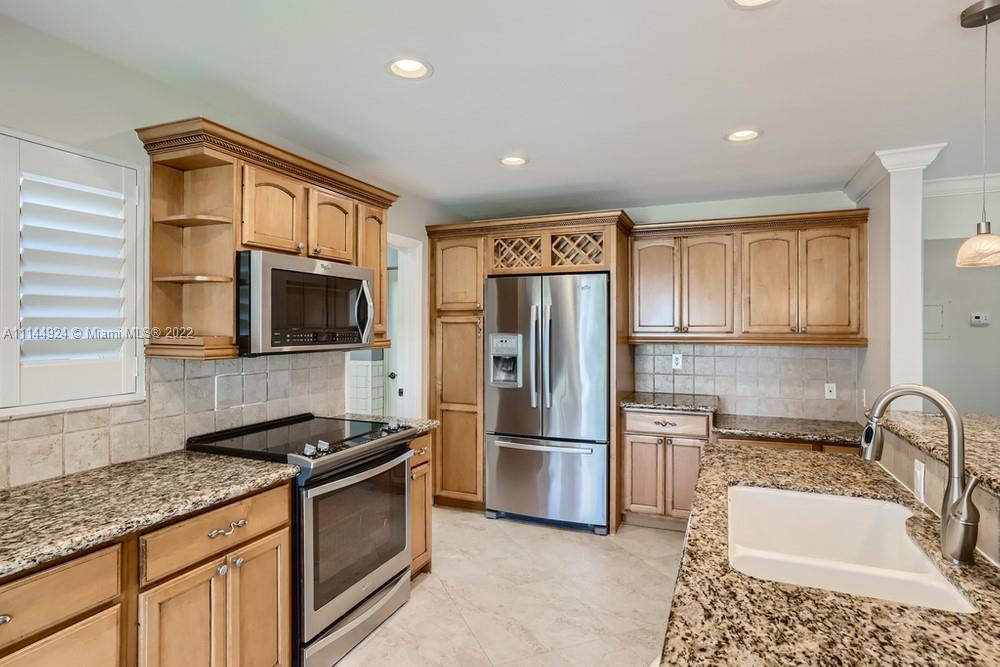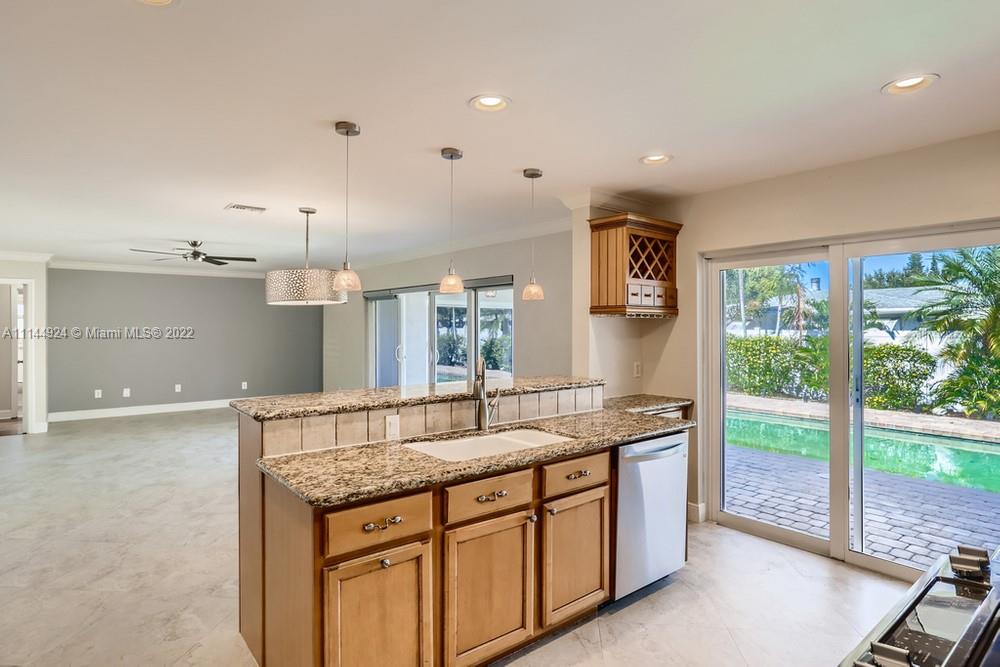 This 4 bedroom, 3 bathroom home welcomes you with poolside views! The entrance guides you in through a charming blue door and leads you into a sunny living area highlighted by the sliding doors ahead and boasting more than enough room for entertaining. Your eat-in kitchen then greets you with an array of cabinetry and an abundance of sparkling stone countertop and bar space to take you from breakfast to dinner with ease! Nearby, the primary bedroom provides you with room to relax and recharge while including a convenient en suite bathroom outfitted with a sizable vanity. The property also features a fully-fenced backyard and an accompanying pool area perfect for summers outdoors! Located moments from a number of venues, your options for entertainment are endless.