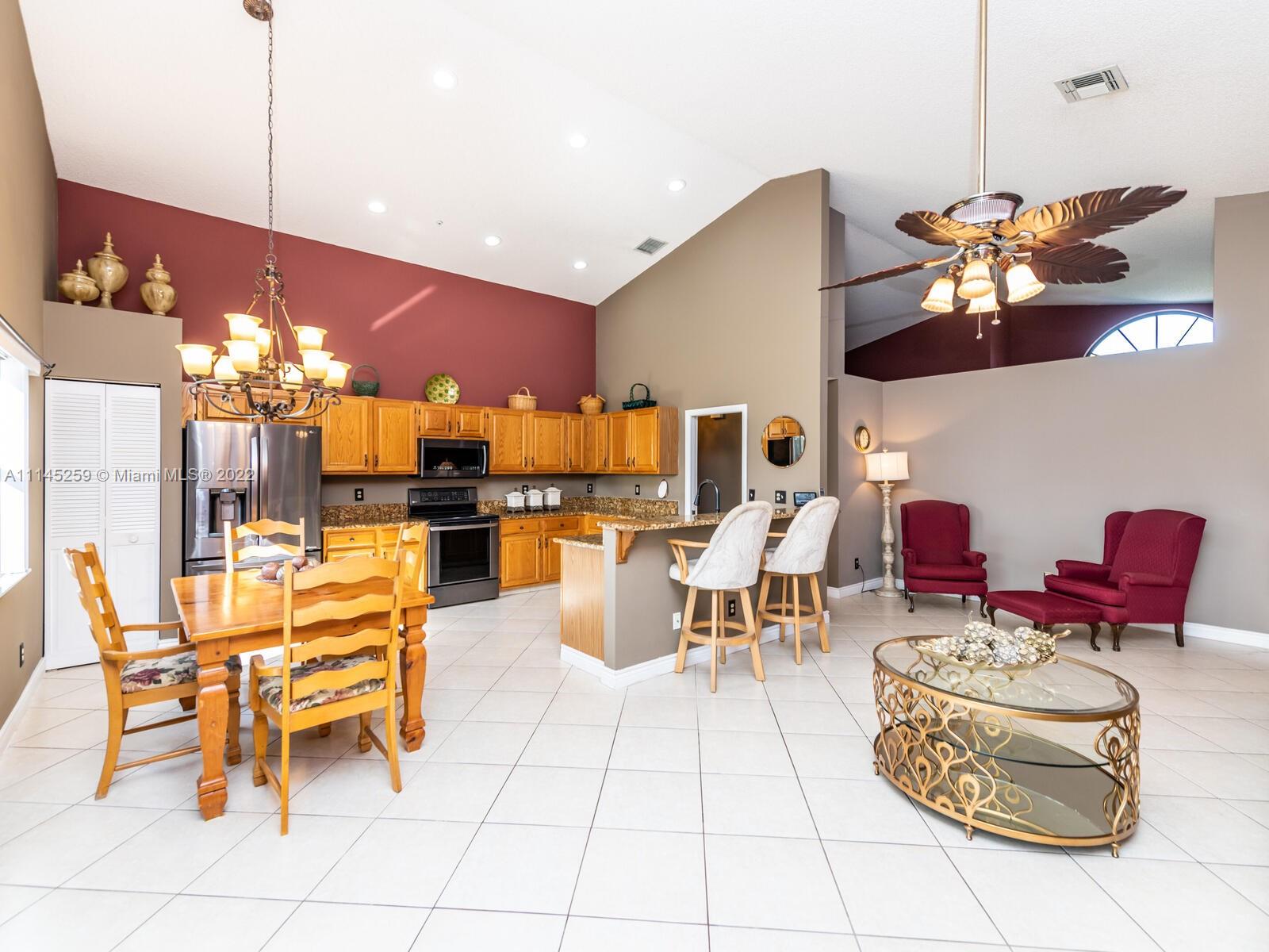 Single owner home in prized Forest Ridge community with majestic live oak community entrance, access to natural preserve for strolls, bike riding and dog walks ready for new family. Roof 2012, keyed hurricane impact shutters. Hurricane Impact front door and arched window. Eat-in kitchen with granite countertops and bar seating. Vaulted ceilings throughout. Bedrooms carpeted. Master bedroom with two walk in closets has double sink vanity. Second bathroom has double sink vanity and shower/bath. Oversized tile throughout sunny, south facing living areas. Enclosed patio with small pet gate. Large fenced backyard. A-rated Davie school district. Short walk to Silver Ridge Elementary. Separate indoor laundry. Brick paver walkway/alcove and driveway. All appliance warranties on hand.