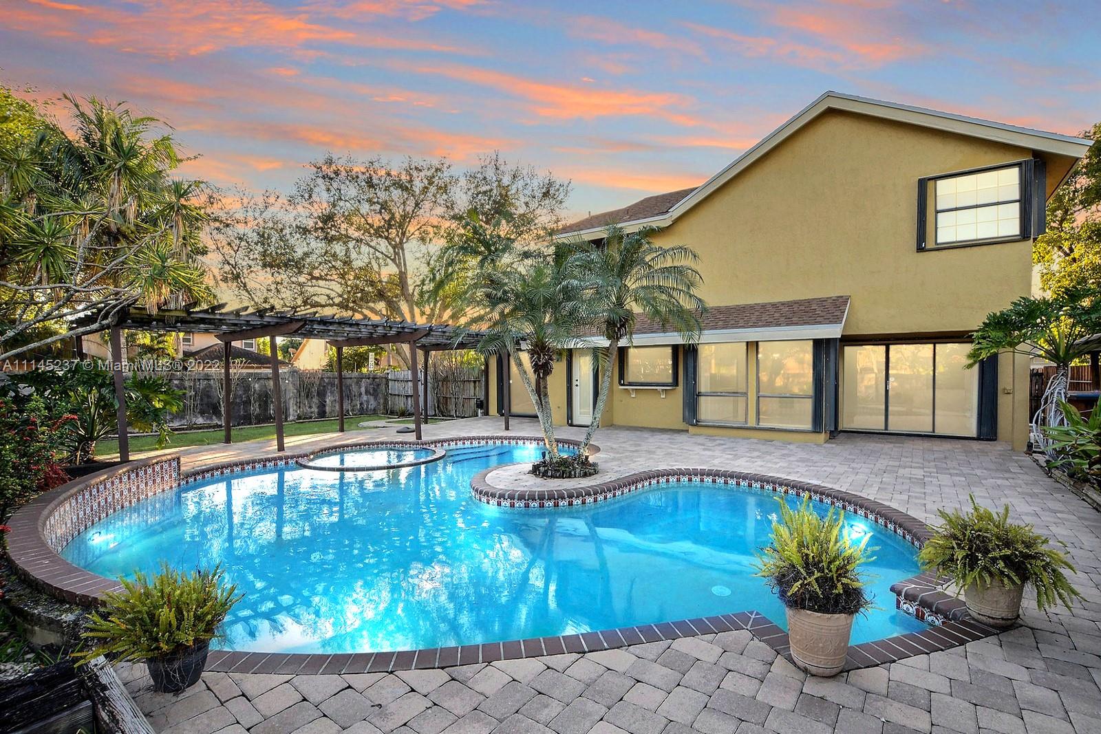 THIS BEAUTIFUL 3 BED + LOFT, 3 BATH HOME SITS ON A PREMIUM CORNER LOT IN THE SOUGHT AFTER TREE LINED COMMUNITY OF COUNTRY ADDRESS. FRENCH STAINED GLASS DOUBLE DOORS LEAD YOU INTO AN OPEN VAULTED CEILINGS, ROMANTIC WOOD BURNING FIREPLACE & PLENTY OF NATURAL. LOFT CAN BE TURNED INTO A 4TH BEDROOM AND DOWNSTAIRS CABANA BATH IS A TRUE FULL BATH. PRIMARY SUITE FEATURES DOUBLE SINK VANITY, UNIQUELY TILED ENCLOSED TUB AND SPACIOUS WALK IN CLOSET. GORGEOUS REAL-WOOD FLOORS. BACKYARD IS A TRUE OASIS WITH POOL AND SPA, LUSH LANDSCAPING, BEAUTIFULLY TILED PATIO, BUNGALOW AND BAR AREA. ACCORDION SHUTTERS, AND 2 CAR GARAGE. ACCESS TO COUNTY ADDRESS PARK, TREE TOPS PARK, COOPER CITY SCHOOL DISTRICT AND PLENTY OF AMAZING SHOPS AND RESTAURANTS.