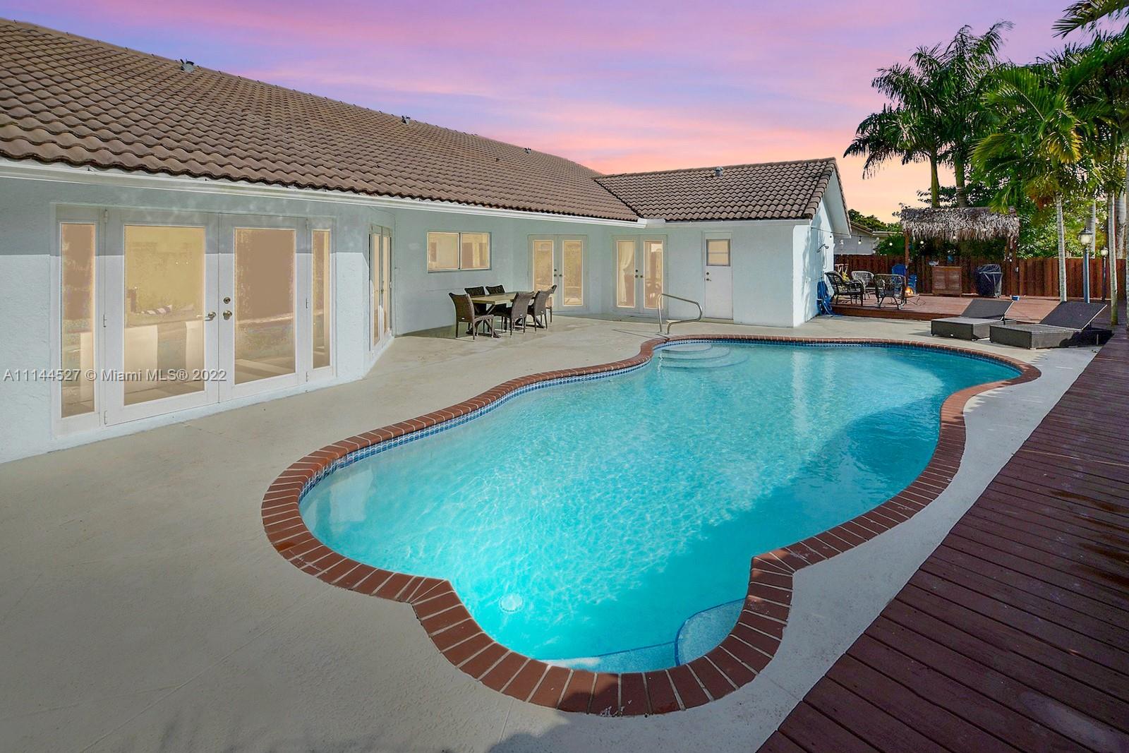 BEAUTIFUL POOL HOME IN CYPRESS GLEN, CORAL SPRINGS FEATURES 4 BEDS 2 BATHS ON A CHARMING CUL DE SAC LOT. EXTENDED DRIVEWAY WITH PRETTY PAVERS, CUSTOM WOODEN GARAGE DOOR AND STAINED GLASS DOUBLE DOOR ENTRANCE.SPECTACULAR KITCHEN WITH CUSTOM WOOD CABINETS, COOKING ISLAND, GRANITE COUNTERTOP AND STAINLESS STEEL APPLIANCES. FRESH PAINT, ELEGANT FEATURES, VAULTED CEILINGS, FRENCH DOORS AND SEPARATE LARGE FAMILY ROOM OFF KITCHEN. PRIMARY SUITE WITH DIRECT ACCESS TO BACKYARD, DOUBLE VANITY, SOAKING TUB AND GLASS ENCLOSED SHOWER. UPDATED SECOND BATH & IMPACT WINDOWS. LARGE FENCED IN BACKYARD WITH POOL, DECK AND PLENTY OF ROOM FOR LOUNGING FURNITURE, A COZY FIRE-PITS AND BARBECUE. NO HOA