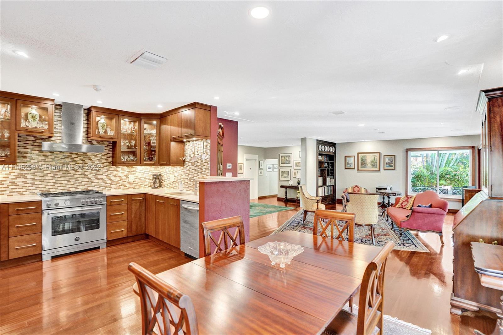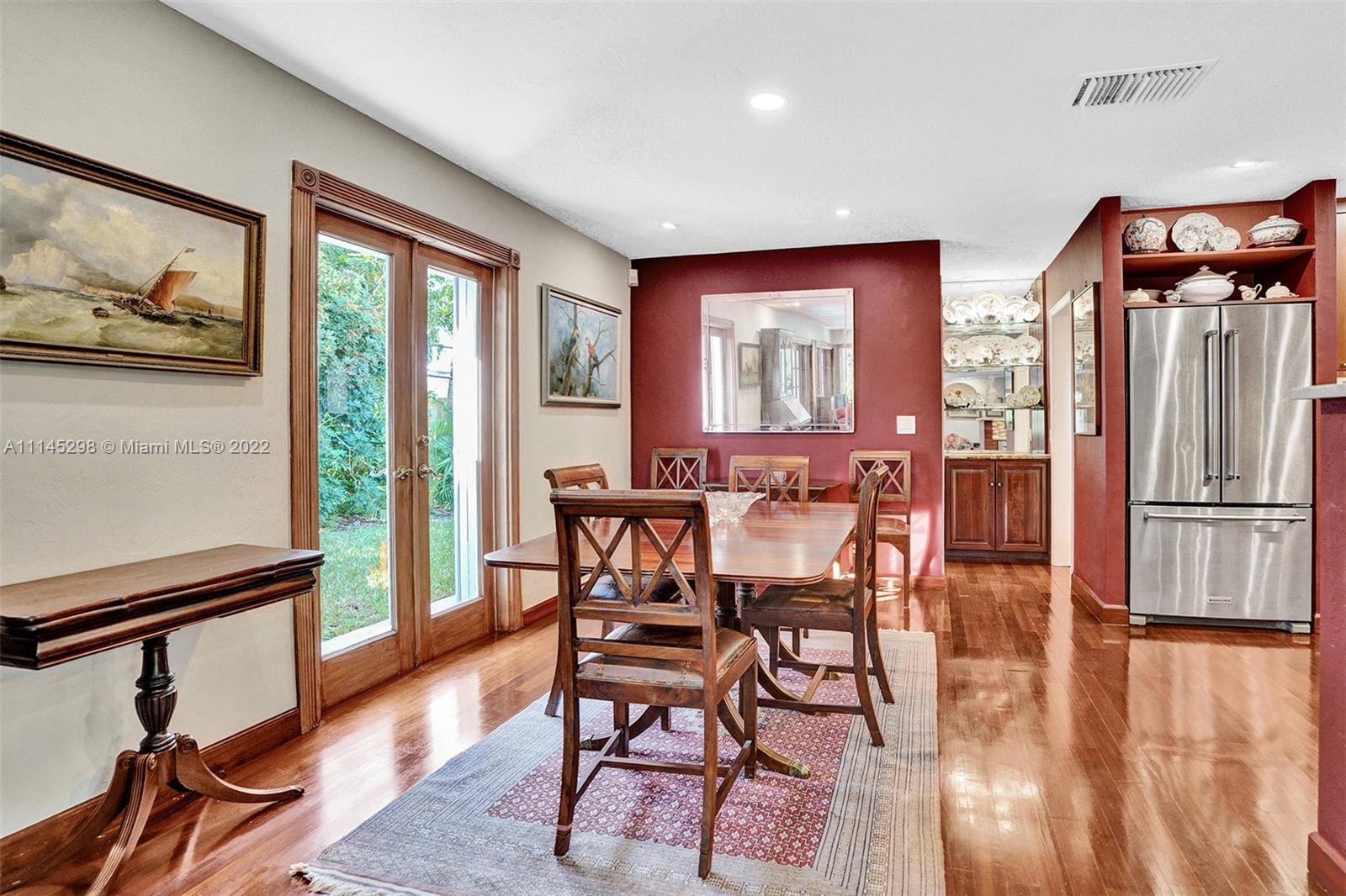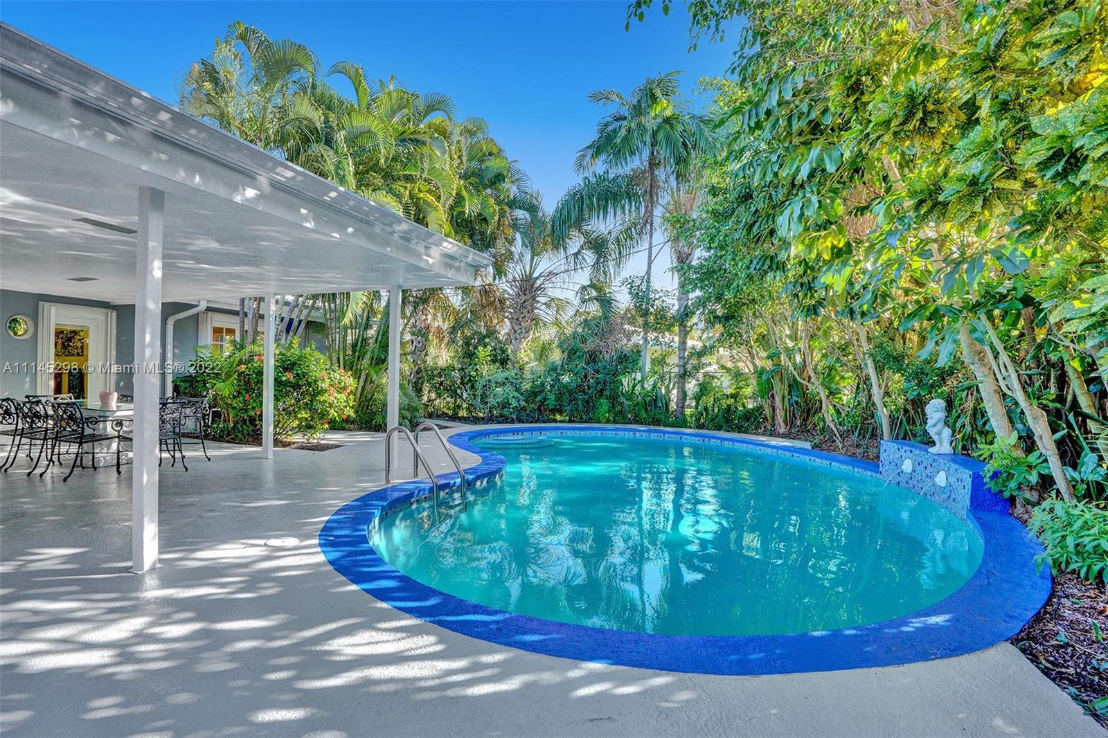 The living area has three sets of French doors overlooking the pool, giving the home brilliant natural light, along with a large picture window in the formal sitting area in the front. The upgraded kitchen which opens to the dining area and living space is perfectly suited for any chef; equipped with stainless steel appliances, quartz countertops, tiled backsplash and oversized Italian gas-fired range. The primary bedroom, with hardwood flooring and French doors, opens onto the backyard. An ensuite cabana bath has a walk-in shower and dual vanity sinks. The secondary bedrooms are bright, well-sized and accommodating. You can enjoy your morning coffee in the cozy front portico or by the custom heated pool in the covered back patio.
