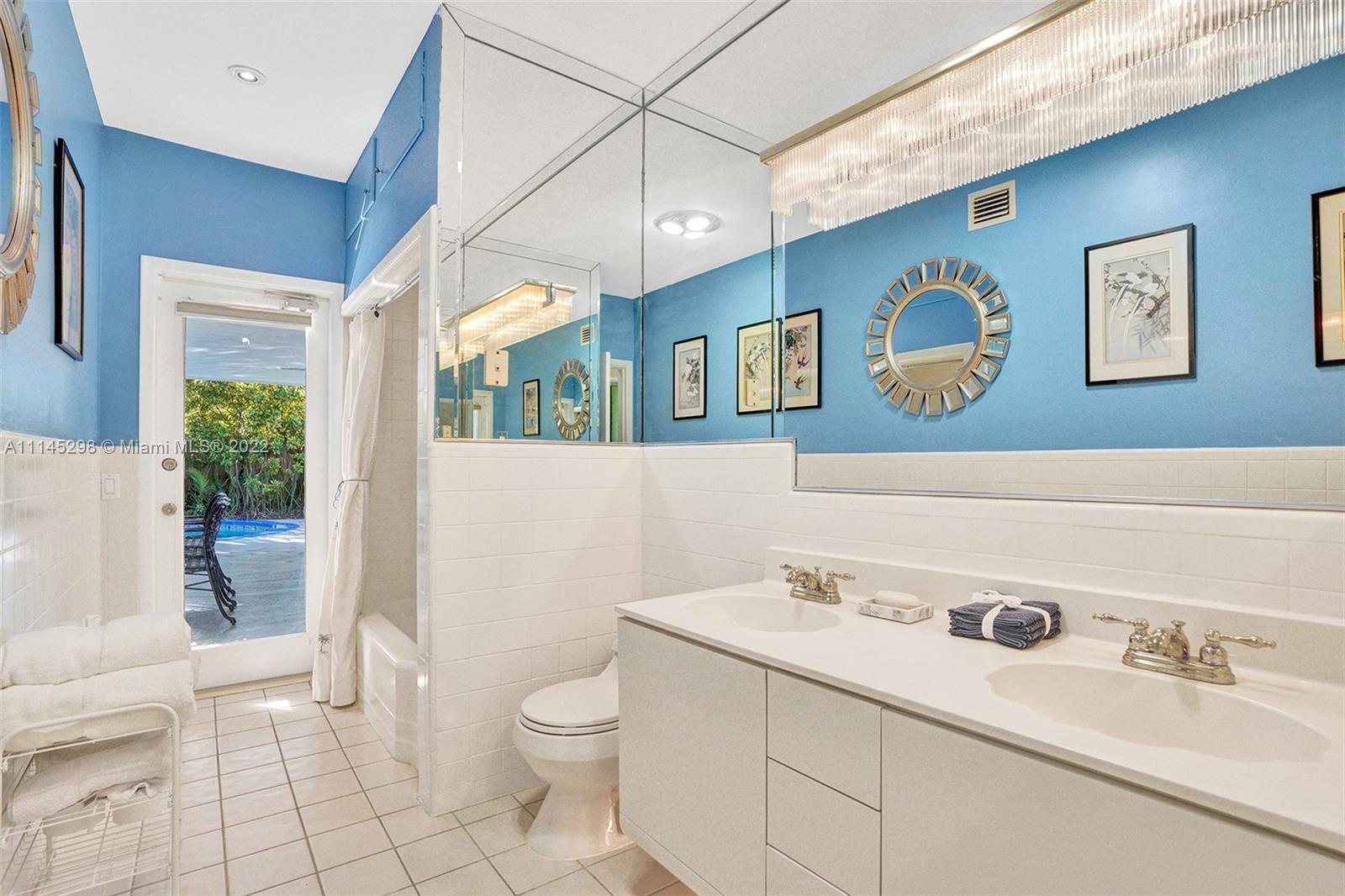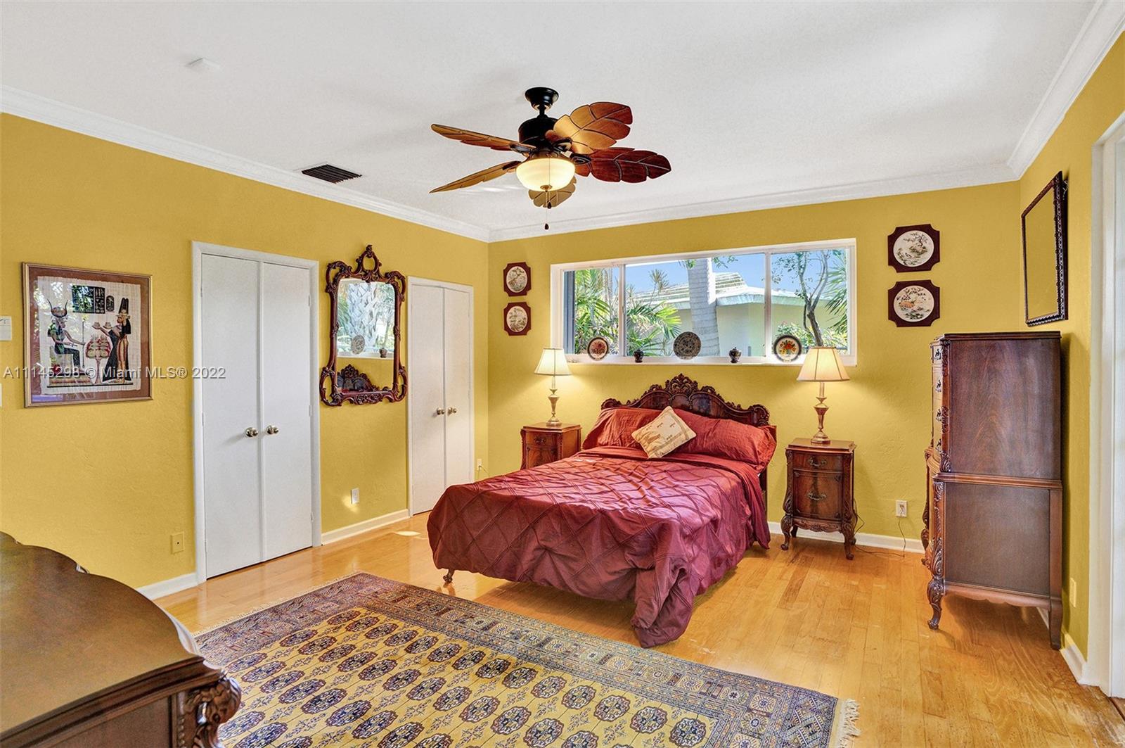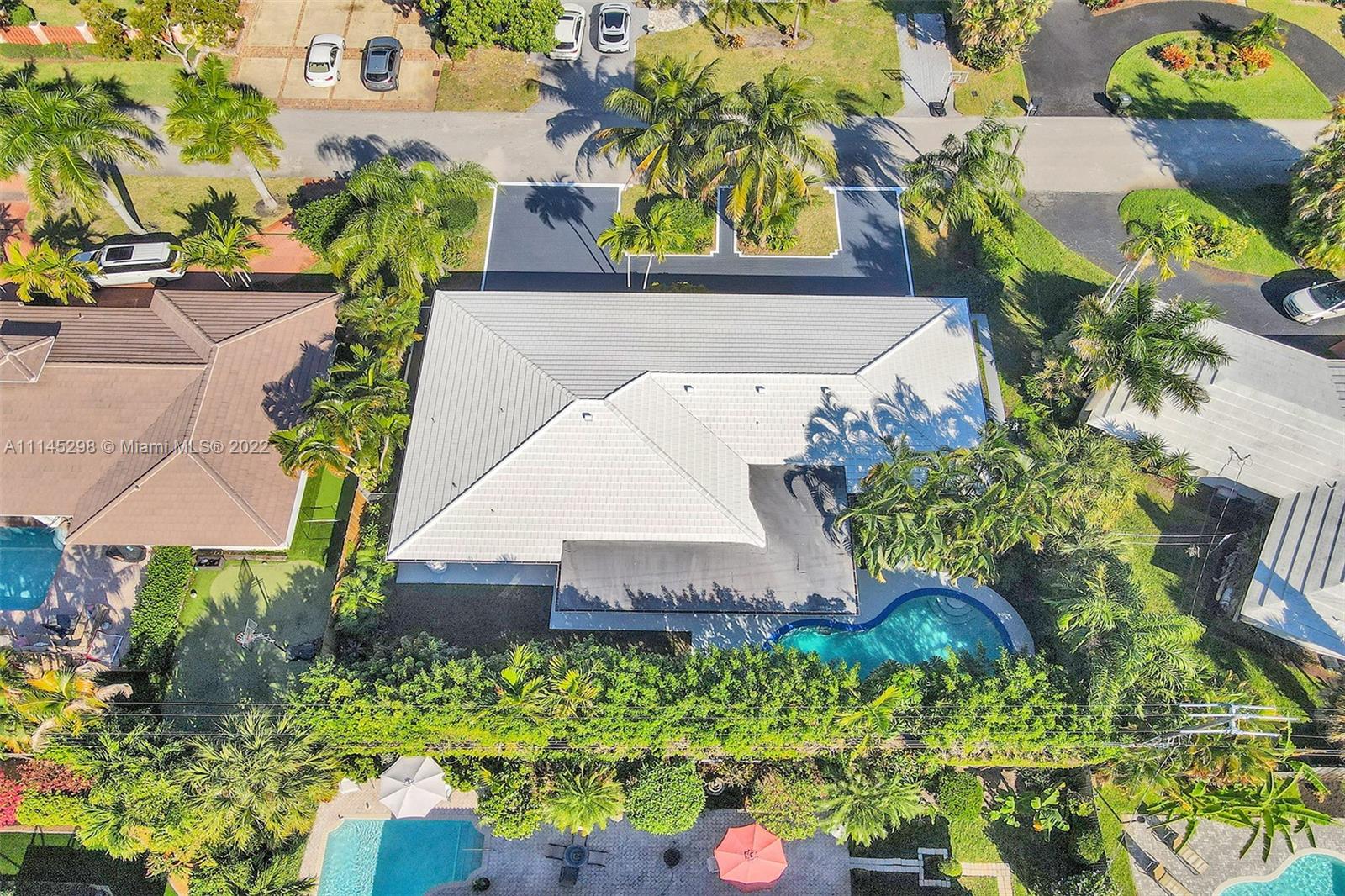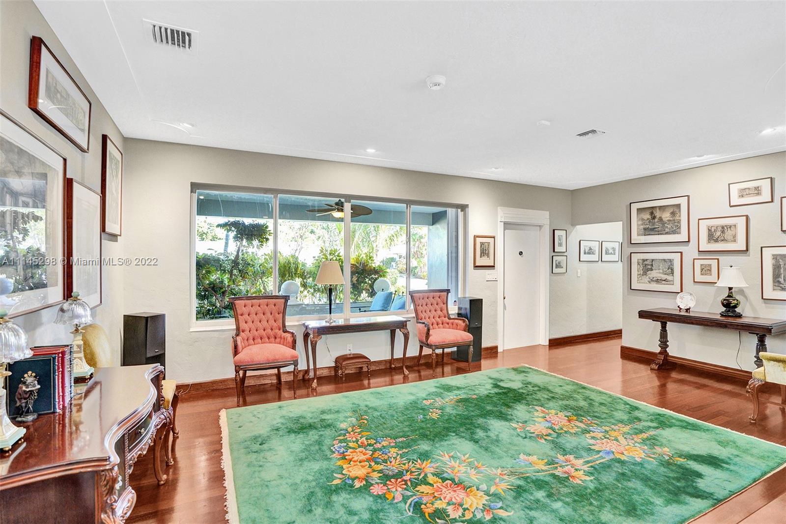 The living area has three sets of French doors overlooking the pool, giving the home brilliant natural light, along with a large picture window in the formal sitting area in the front. The upgraded kitchen which opens to the dining area and living space is perfectly suited for any chef; equipped with stainless steel appliances, quartz countertops, tiled backsplash and oversized Italian gas-fired range. The primary bedroom, with hardwood flooring and French doors, opens onto the backyard. An ensuite cabana bath has a walk-in shower and dual vanity sinks. The secondary bedrooms are bright, well-sized and accommodating. You can enjoy your morning coffee in the cozy front portico or by the custom heated pool in the covered back patio.
