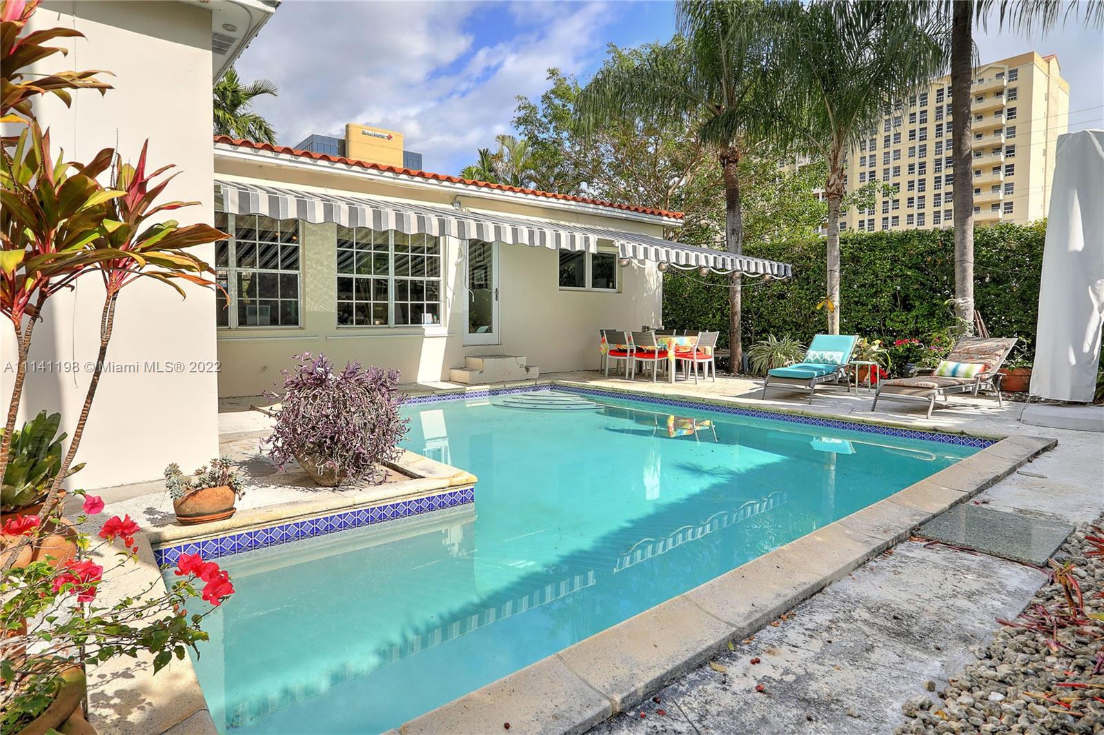 Proudly own this 4 bedroom/2 Bath with pool located just a few blocks to Miracle Mile and Downtown Coral Gables! This rare opportunity to purchase this split plan features large living and dining areas complemented by stunning original wood flooring and wonderful natural light. Spend your free time relaxing in this backyard oasis featuring a beautiful L-Shaped pool, tall privacy hedges and patio area with a large retractable awning. All four bedrooms are spacious and this home has been designed well to feature ample storage space with extra hallway closets and utility room with washer/dryer and storage loft. This home has a new A/C, partial Impact Windows and updated plumbing that has been connected to municipal water and sewer. Schedule your showing today!