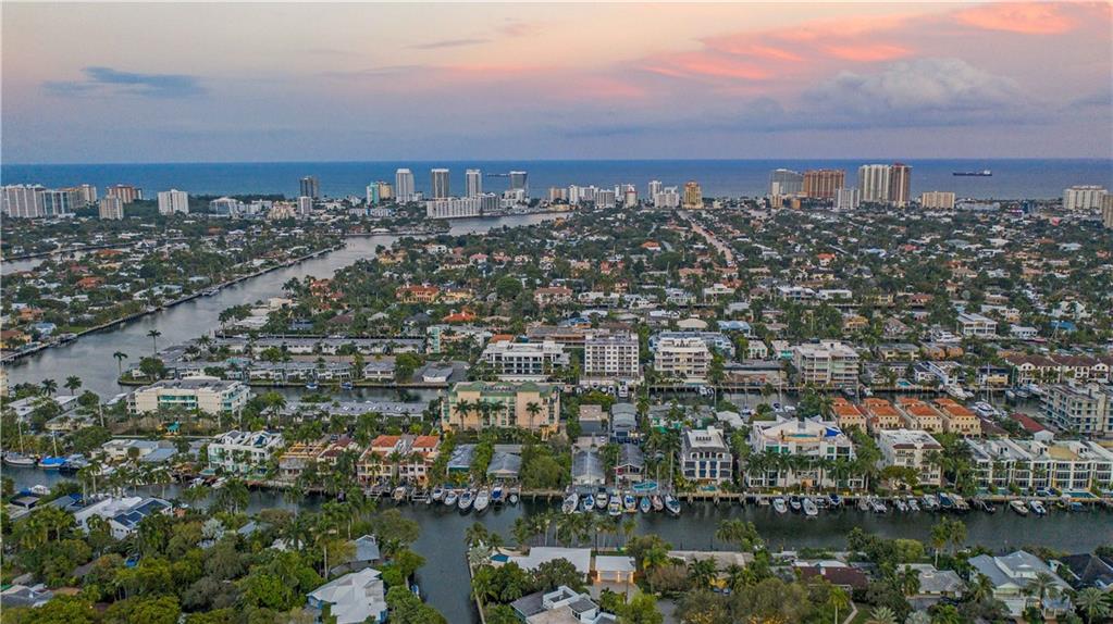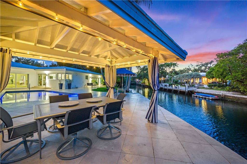 Park-like North Gordon's premier point property encompasses over 16,000 square feet & no-fixed-bridge water front of over 240 feet with 162 feet along the wide, deep Karen Canal. A recent multi-level ipe dock also has a float platform. Sleek Mid-Century architecture is updated for the 21st Century including re-built roof, newer electrical and plumbing systems and all impact-rated windows and doors. The sunken living room has volume ceilings. Walls of sliding glass merge outdoor and indoor living featuring water views from all public areas. Travertine patios surround the re-done, heated pool and water facing gazebo. In front, a crescent drive leads to an oversized three car garage with additional storage and laundry room with a dog wash. Very walkable to parks and Las Olas dining.