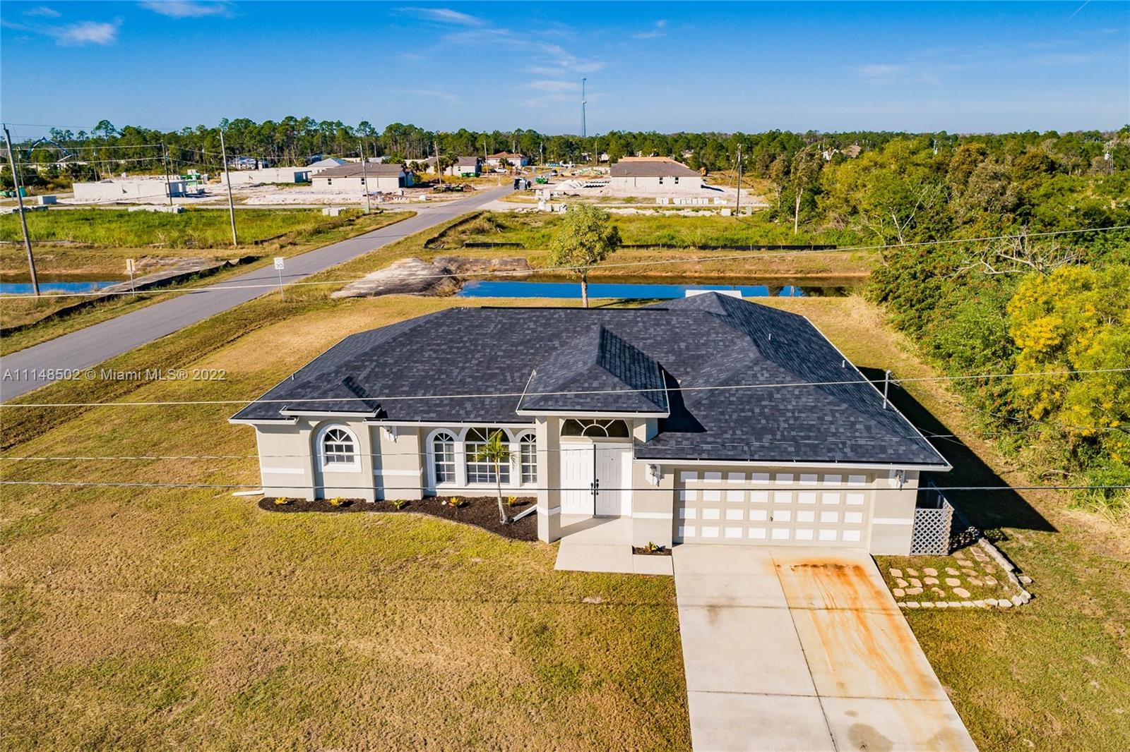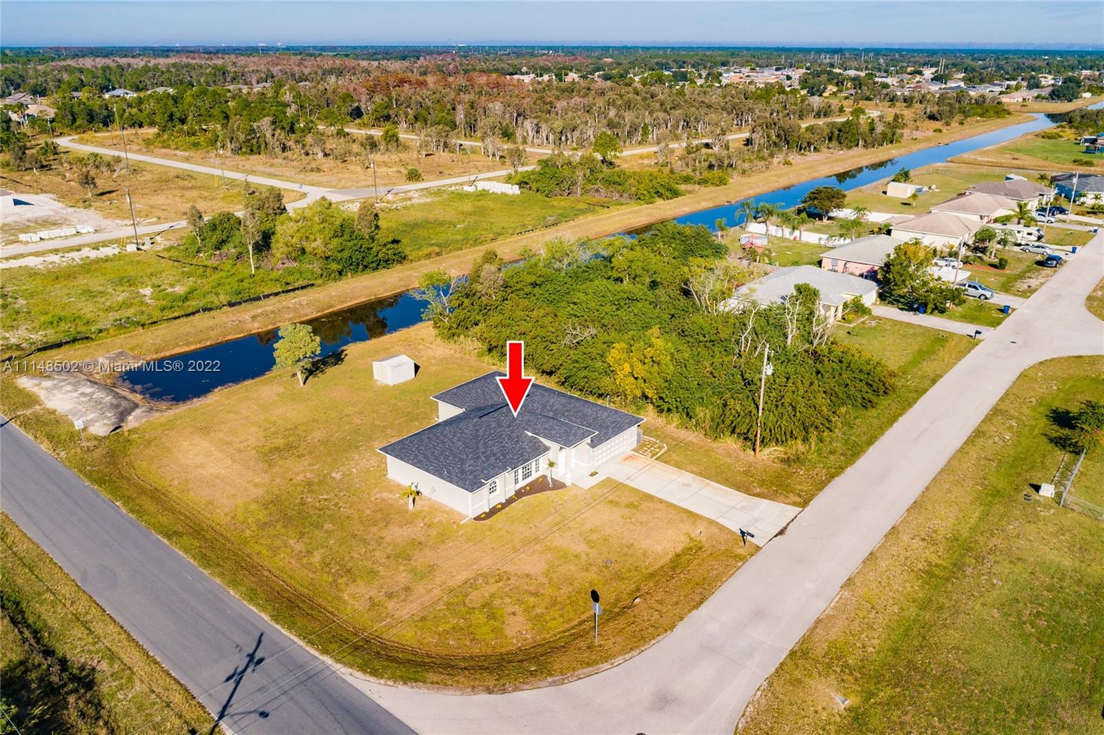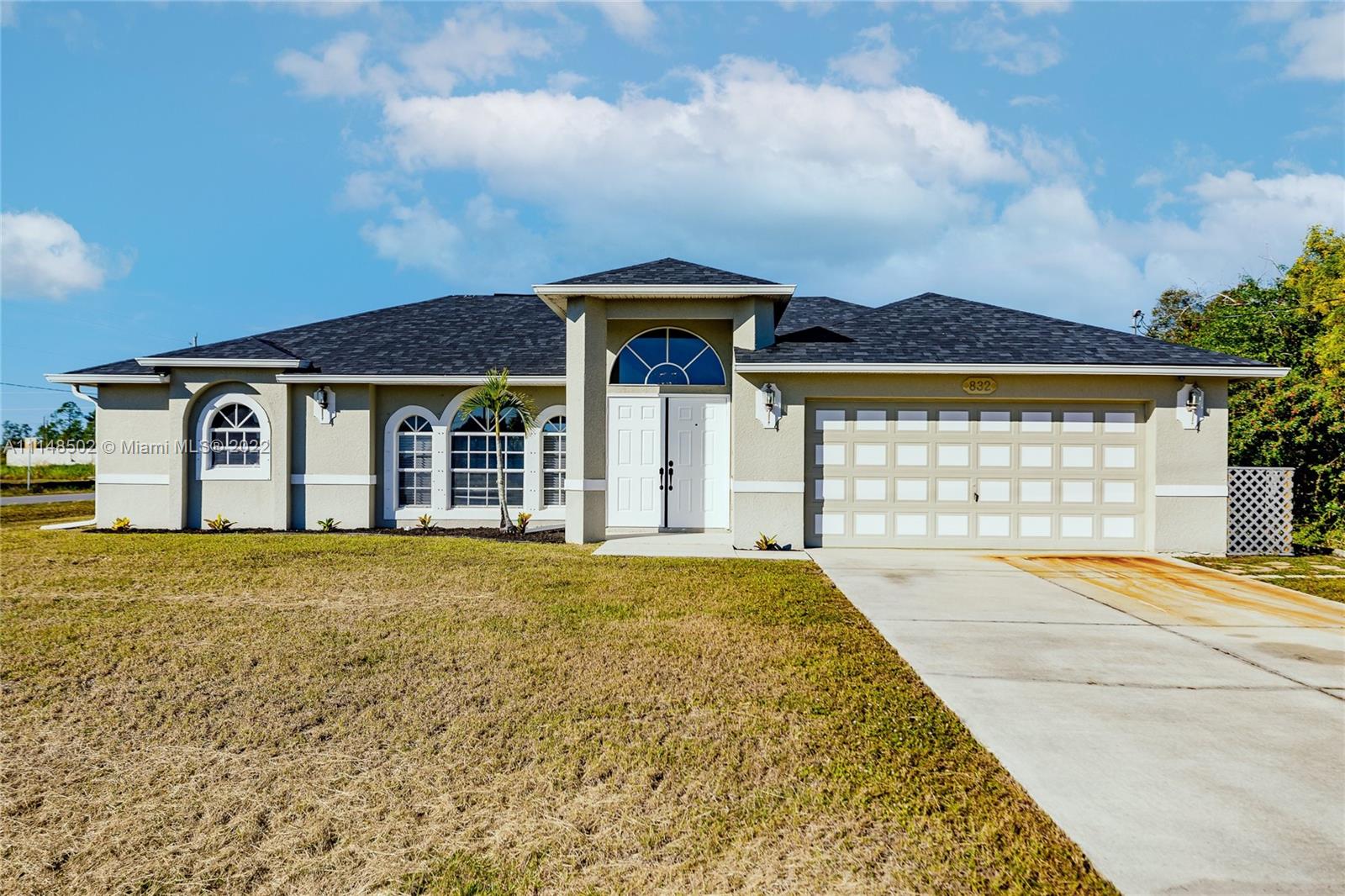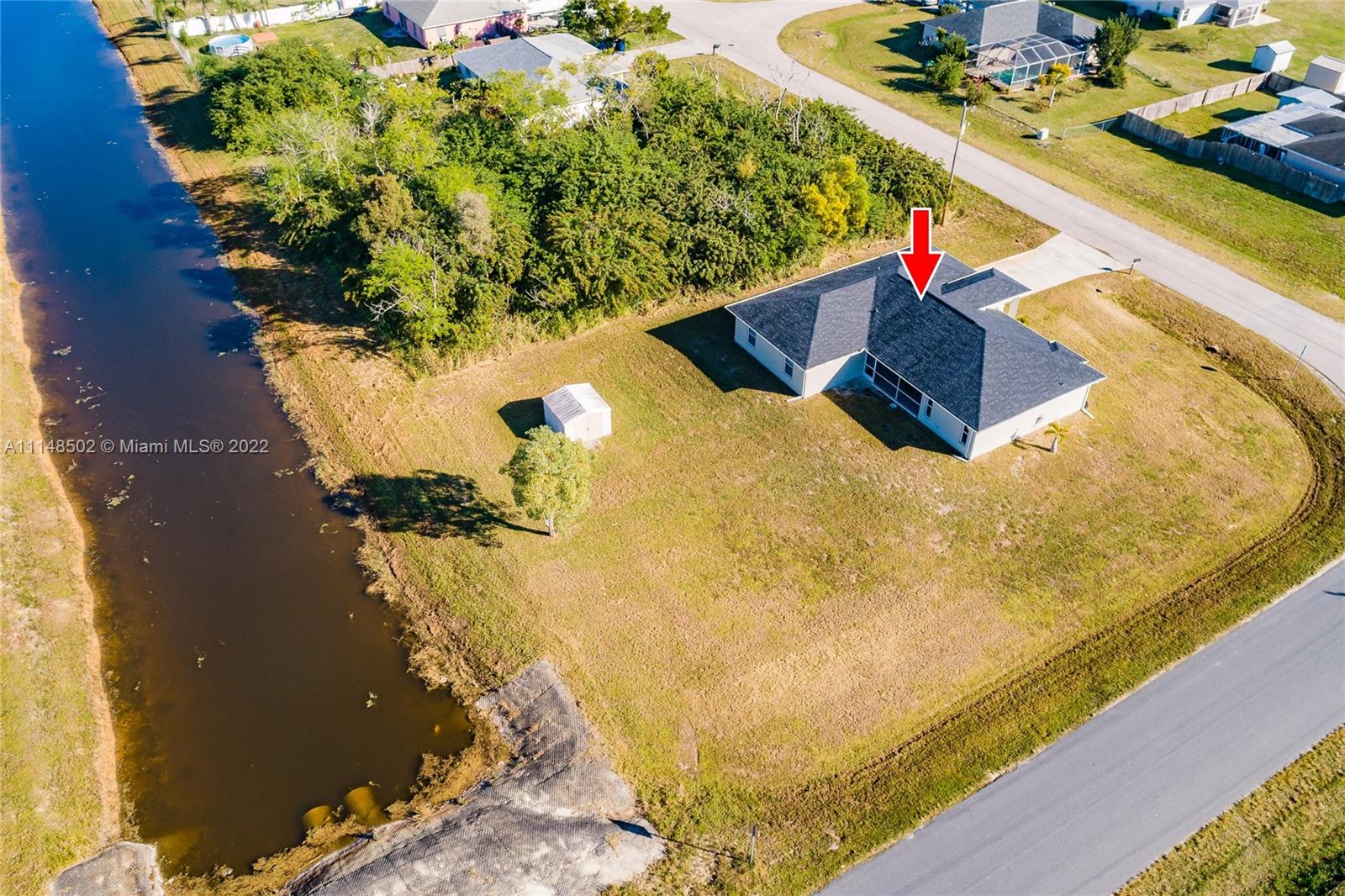 A MUST SEE! This doubled door corner lot beauty will not last. Spacious split plan three bedrooms two bathrooms two car garage situated on 14,586 sqft of land. This open floor plan home boast of natural lighting with 6 x 36 ceramic tile in the common areas and carpeting in the bedrooms. The kitchen has stainless steel appliances and laundry room includes washer, dryer and utility sink. Master bedroom features his and hers closets with separate roman tub, shower and water closet. The screened lanai overlooks the fresh water canal and there is 10 x 10 shed for additional storage. You cannot go wrong with the new roof installed May 2021 and storm panels.