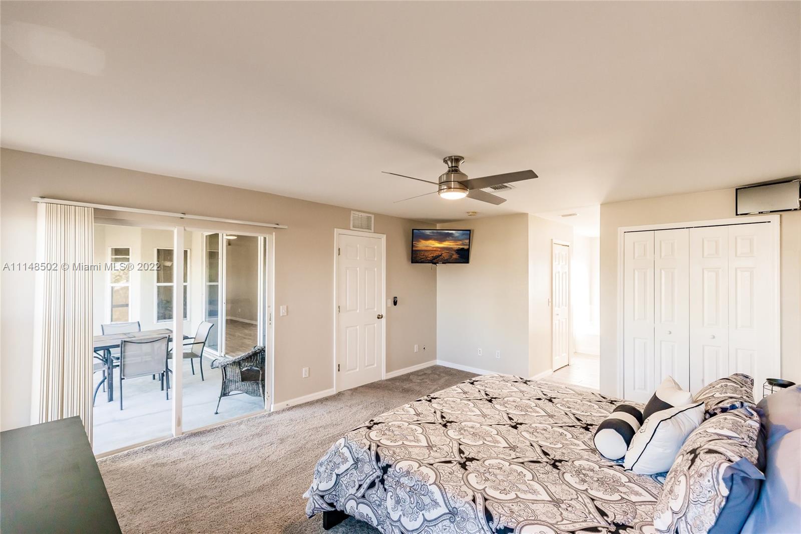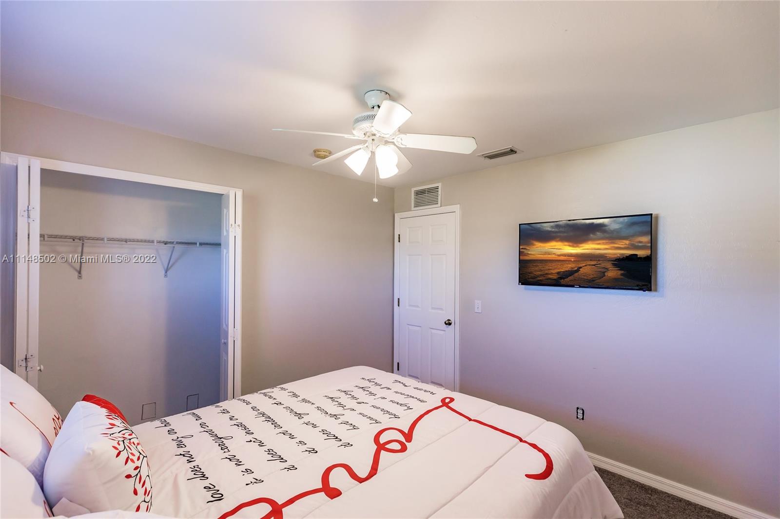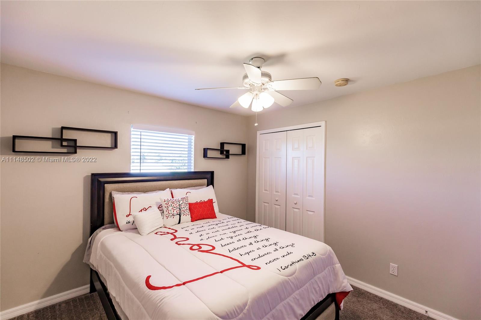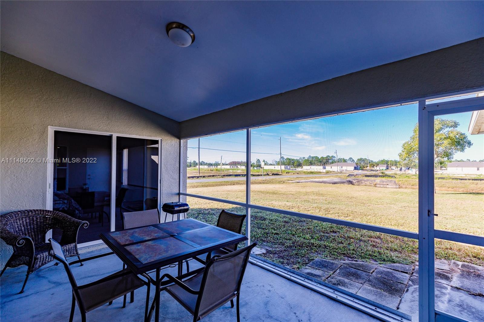 A MUST SEE! This doubled door corner lot beauty will not last. Spacious split plan three bedrooms two bathrooms two car garage situated on 14,586 sqft of land. This open floor plan home boast of natural lighting with 6 x 36 ceramic tile in the common areas and carpeting in the bedrooms. The kitchen has stainless steel appliances and laundry room includes washer, dryer and utility sink. Master bedroom features his and hers closets with separate roman tub, shower and water closet. The screened lanai overlooks the fresh water canal and there is 10 x 10 shed for additional storage. You cannot go wrong with the new roof installed May 2021 and storm panels.
