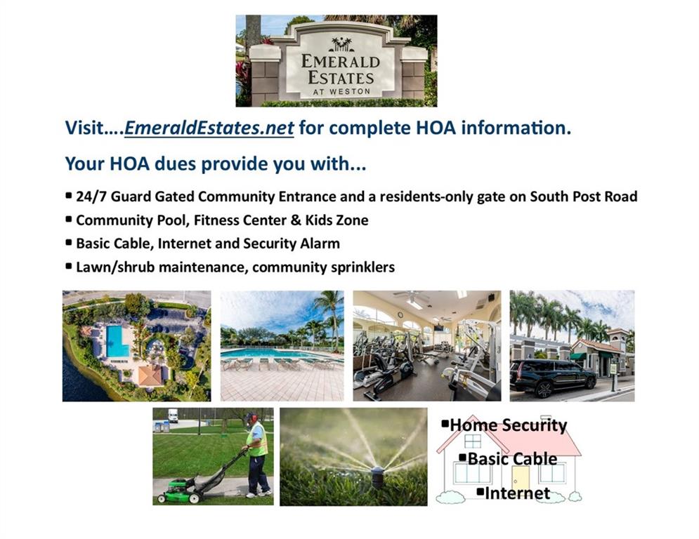 Upgraded home features: Impact Windows & Doors..Artificial Turf backyard..6' privacy wood fence..Big screened patio..Upgraded Granite Eat-in kitchen with Snack Bar, Stainless Steel appliances & Pantry with convenient pullout drawers..Water Heater & A/C less than 3 yrs old..Crown Molding..Updated bathroom..Walk in closet with built-ins..Upgraded neutral floors..Full size 2-car garage..Community Clubhouse features: Pool, Fitness Center, Kids play zone..HOA incl security alarm, basic cable, 24/7 guard gate, pool, lawn maintenance (sprinklers, fertilizing, trimming)..Emerald Estates Park is next door: tennis, basketball,fishing,party pavilions,shaded kids play zone,lakefront walking path. A+ schools..Around corner from Publix, dining at Weston Commons & close to Weston Town Centre..