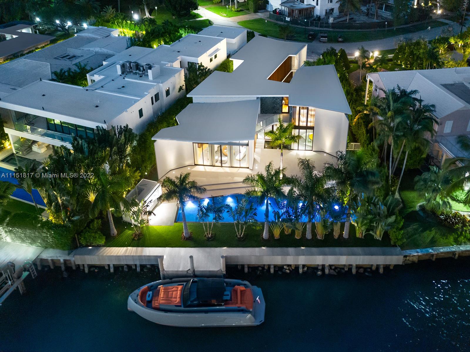 Sited in one of Miami Beach's exclusive enclaves, this private estate on Lakeview Drive features 111 feet of waterfront on Surprise Lake. A new residence designed by world design star Achille Salvagni encompasses 7,951 sqft. of total living space along with a 90 ft infinity pool, cabana, and private boat dock. An entry gallery, double height living room, dining room, dine-in chef's kitchen with Wolf and Subzero appliances, sculptural cabinetry with 24-ct gold leaf detailing, a bronze staircase, two bedrooms, and steam room, are on the ground level. The second floor features a master suite with a private deck and four more bedrooms. Built beyond exacting standards with detailing to the finest degree, from curvilinear interiors to the use of extraordinary materials throughout.