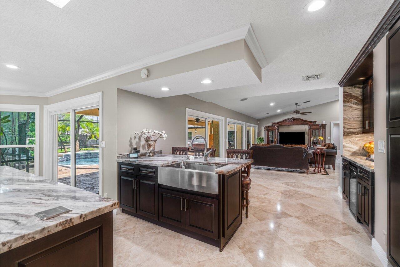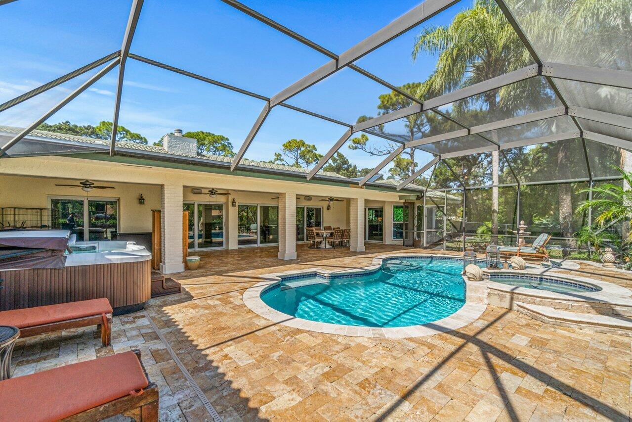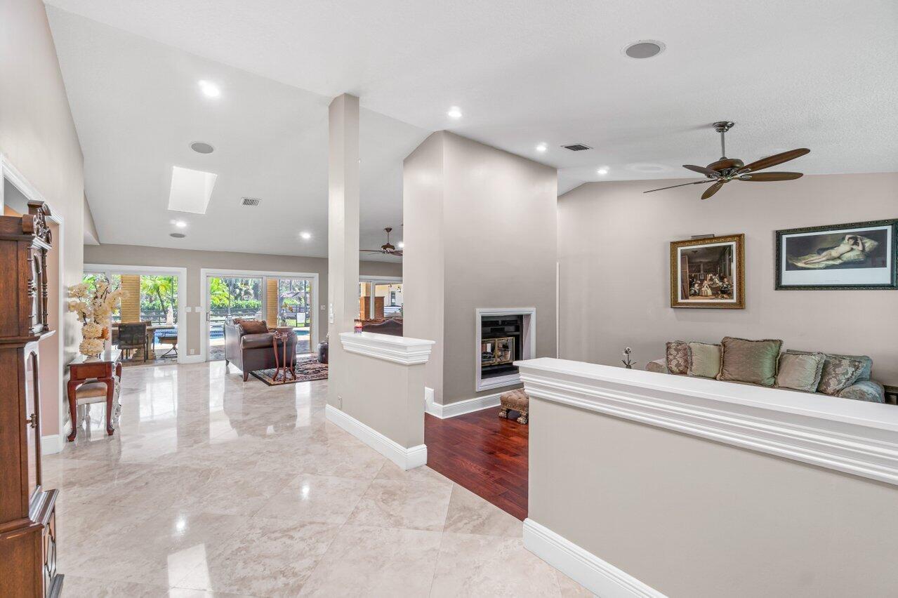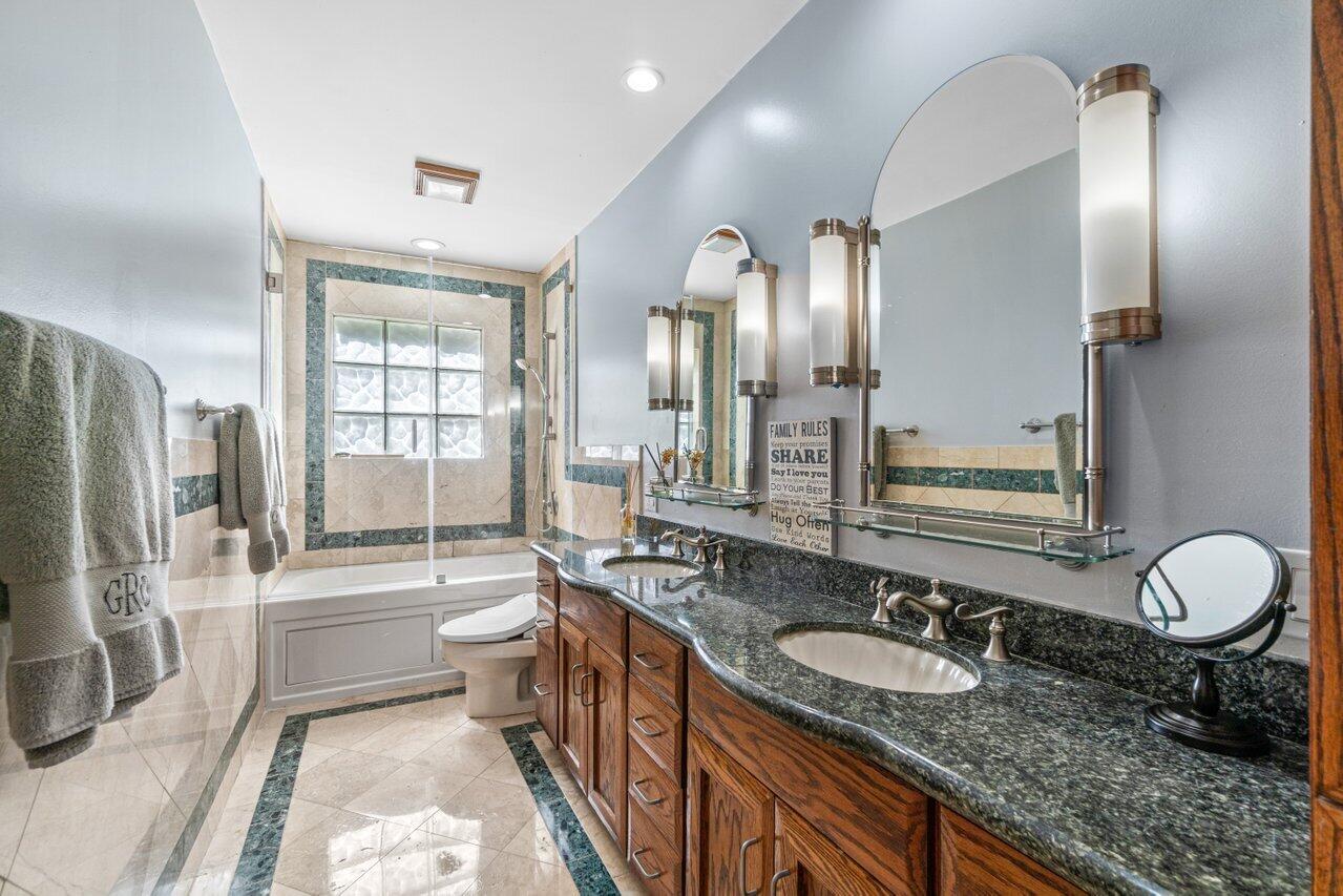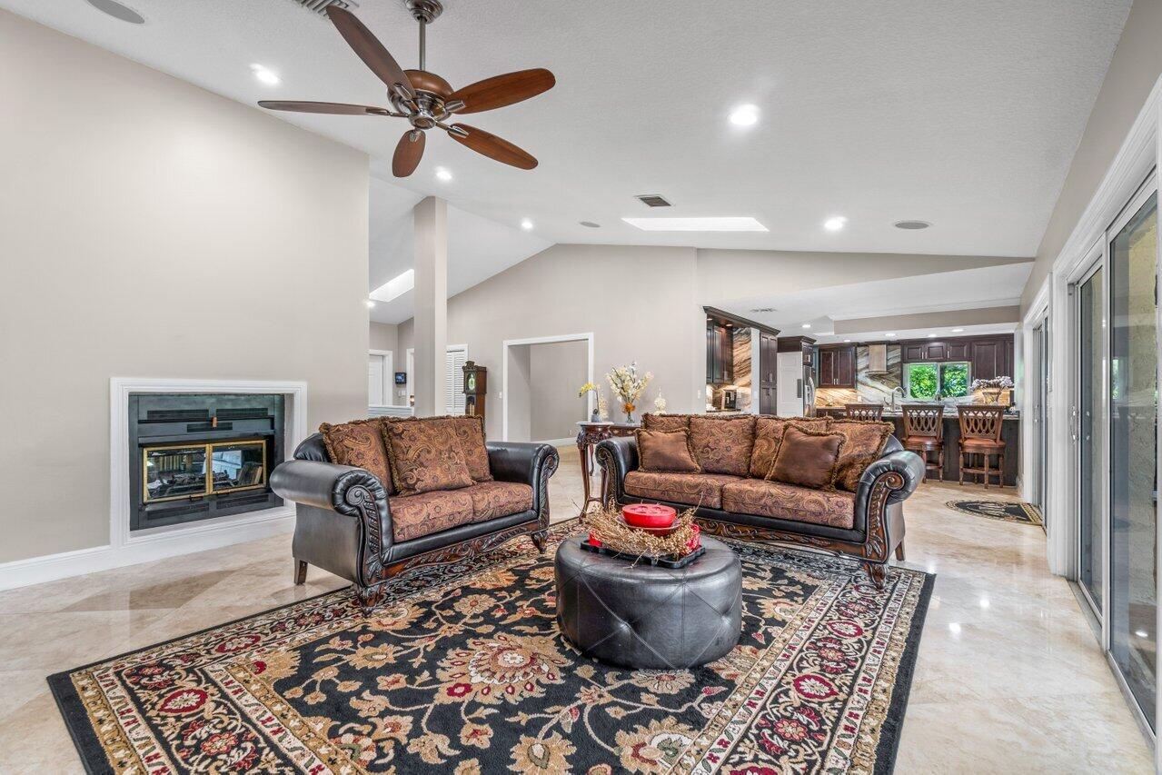 Plenty of room to roam in this true 5 bedroom, 3.5 bath sprawling ranch with an open concept floor plan situated on 1+ acre in highly desirable Pine Tree Estates*Newer remodeled gourmet kitchen with custom solid wood cabinets boasts quartzite counters and backsplashes, SS appliances, 2 large farmhouse SS sinks, bountiful storage*Living areas have vaulted ceilings, skylights, marble and new wood floors in LR and BR's*Large family room and living room have dual sided wood burning fireplace*Spacious Primary BR suite has huge custom closet built ins*Primary bath with double sinks, separate makeup station, whirlpool tub, shower with jets*4 additional BR's all generously sized w/ built in closets. 1 BR has en-suite bath with shower, perfect for inlaws or guests*