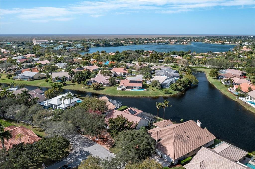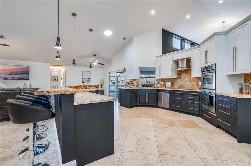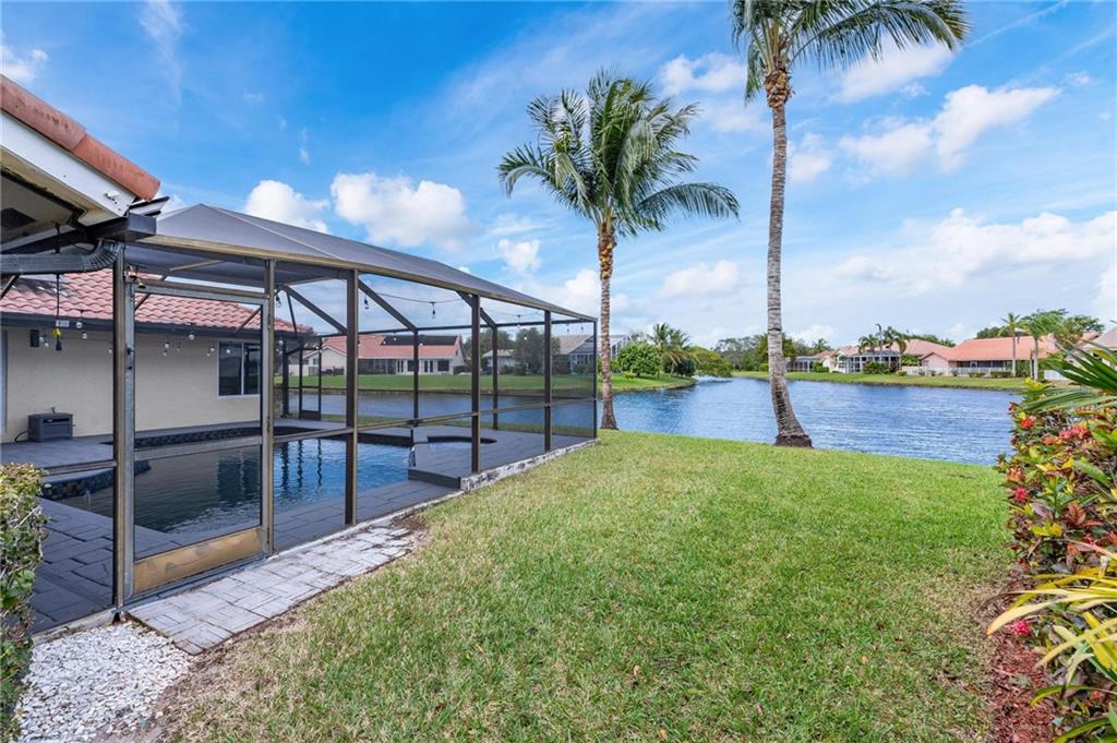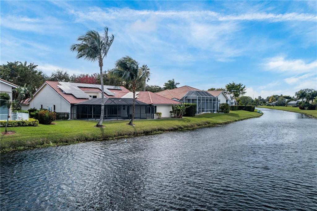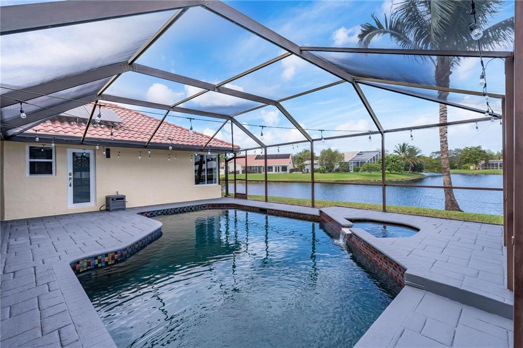 This home features 24x24 Travertine marble floors, all impact windows and doors, and solar panels (owned) power the entire home (not pool), and walking night-sky lights in the common areas and master bath. The giant kitchen comes equipped with a Subzero refrigerator, granite countertops, custom cabinets, double oven, water filtration system & touches faucet. This gorgeous home also boasts a separate laundry room with custom storage and 2 car garage. Relax under the covered screened in patio, while overlooking the spectacular view of the spa and pool with dark-green DiamondBrite extending out over the Lake! (Patio has 220, water, and ventilation run READY FOR SUMMER KITCHEN TO BE INSTALLED!) Located on quiet, family-oriented street. Tile roof 2006,flat roof 2020,HVAC 2016,water heater 2018