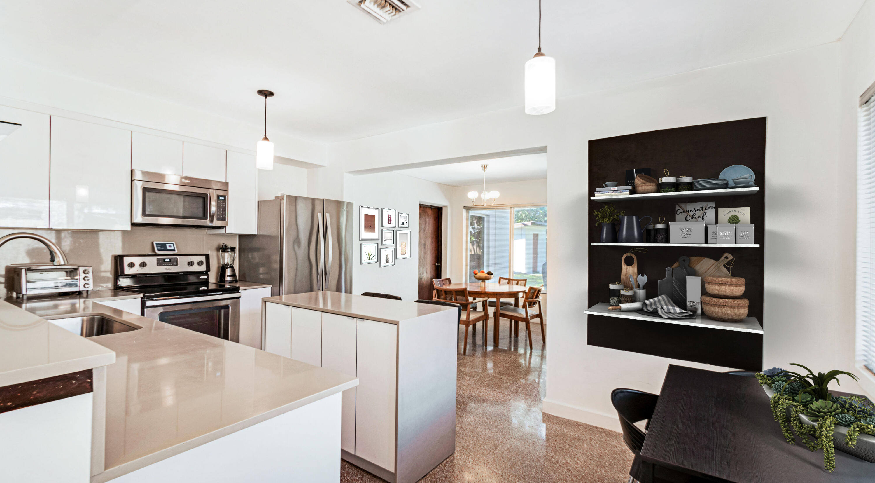 OPEN 3/5 9:30am- 12:00pm. This spotless 3 bed, 2.5 bath mid-century modern renovation is located between downtown Ft. Lauderdale & Wilton Manors. Open-concept Whirlpool stainless chef's kitchen with waterfall island & breakfast nook. Stunning resurfaced terrazzo floors throughout the home reflect natural light from all impact windows & doors into the tropical landscape trimmed in mature trees & full privacy fence. This home features two bonus rooms, one interior home office & one exterior utility room with laundry facilities. The large owner's suite is trimmed with new wood laminate & boasts a built-out walk-in closet and walnut sliding barn door. The en-suite bath features dual-head rain shower and lots of natural light. The entire exterior has been freshly painted.
