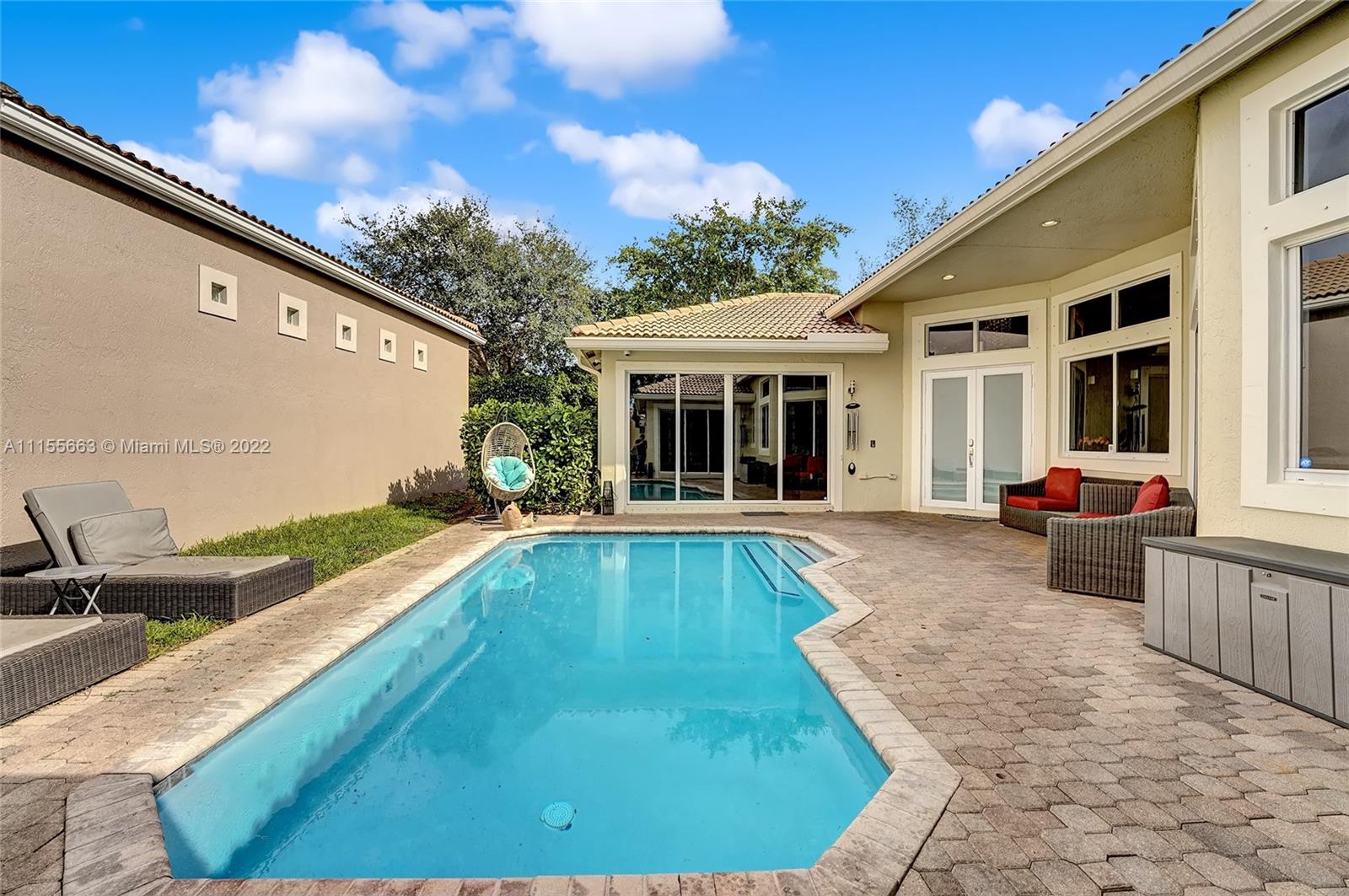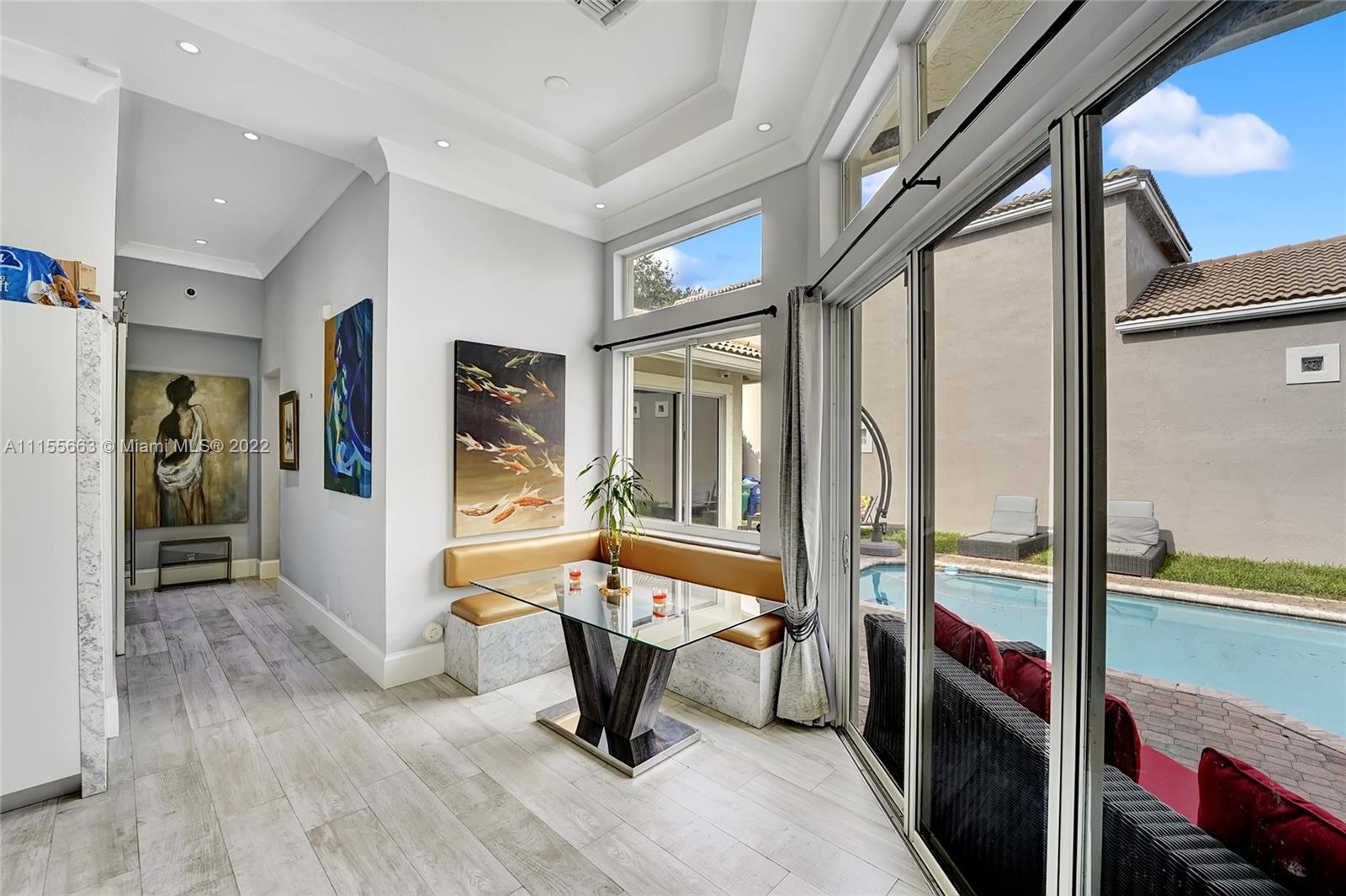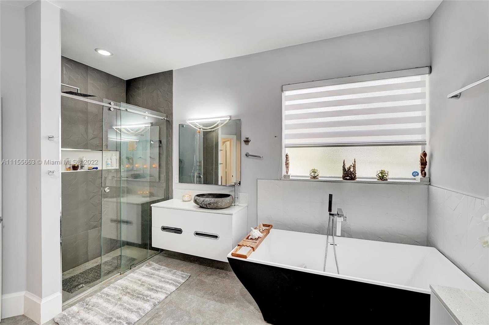 This luxuriously updated courtyard home features an open concept and decorator finishes throughout, perfectly blending natural light and modern luxury to add warmth, function and style. The primary suite is banked by sliding doors on both sides, maximizing indoor-outdoor living, and a spa style bath, complete with vessel sinks, a free standing tub and heated towel racks. The open chef's kitchen features marble countertops, custom cabinets, a Sub-Zero refrigerator and wine fridge. The 4th bedroom features barn doors and a full wall of storage -ideal as a bedroom or flex space. Porcelain wood plank floors throughout connect the split floor plan. A courtyard sits in the center of the home with a sparkling pool and private garden. Located in a prime neighborhood with resort style amenities.