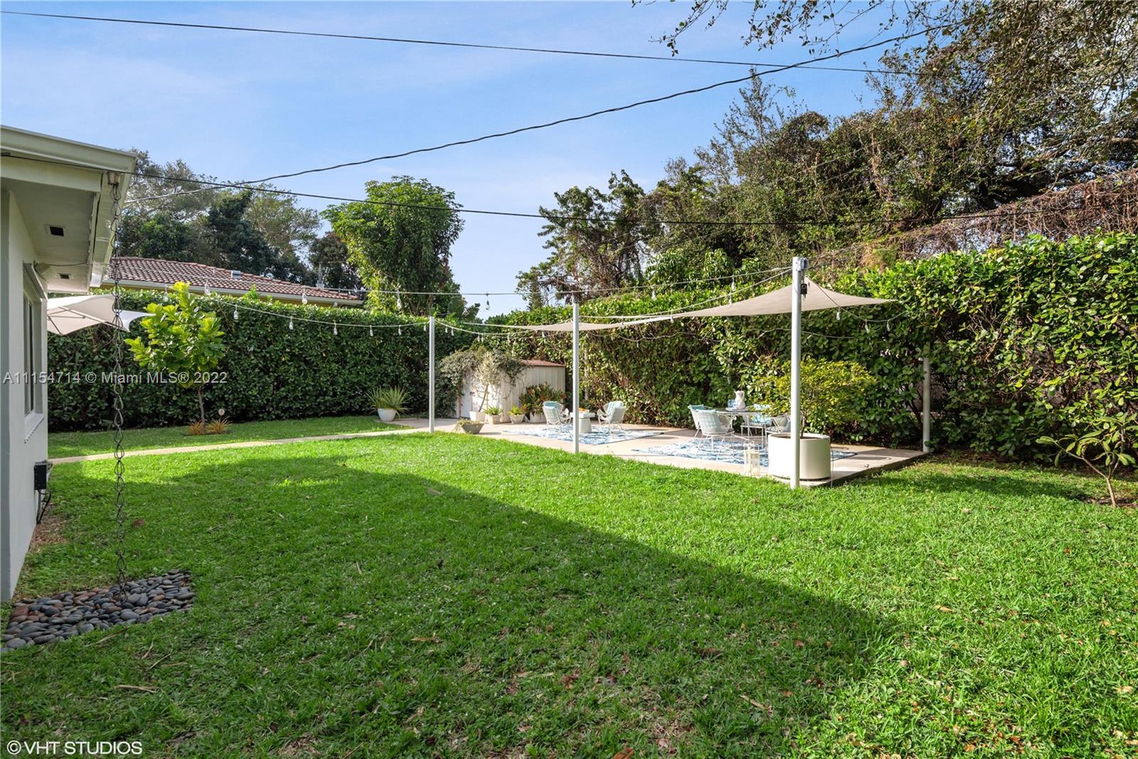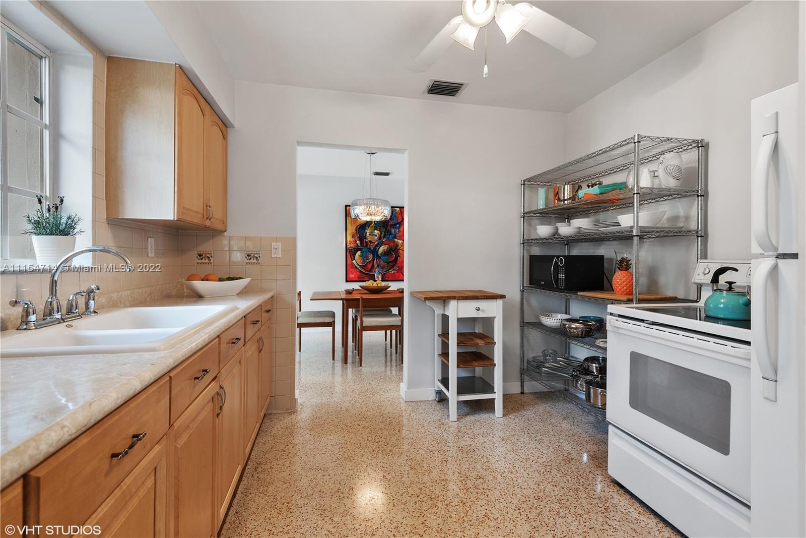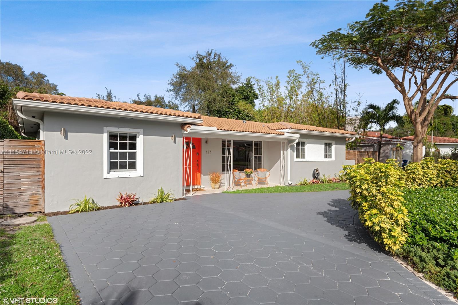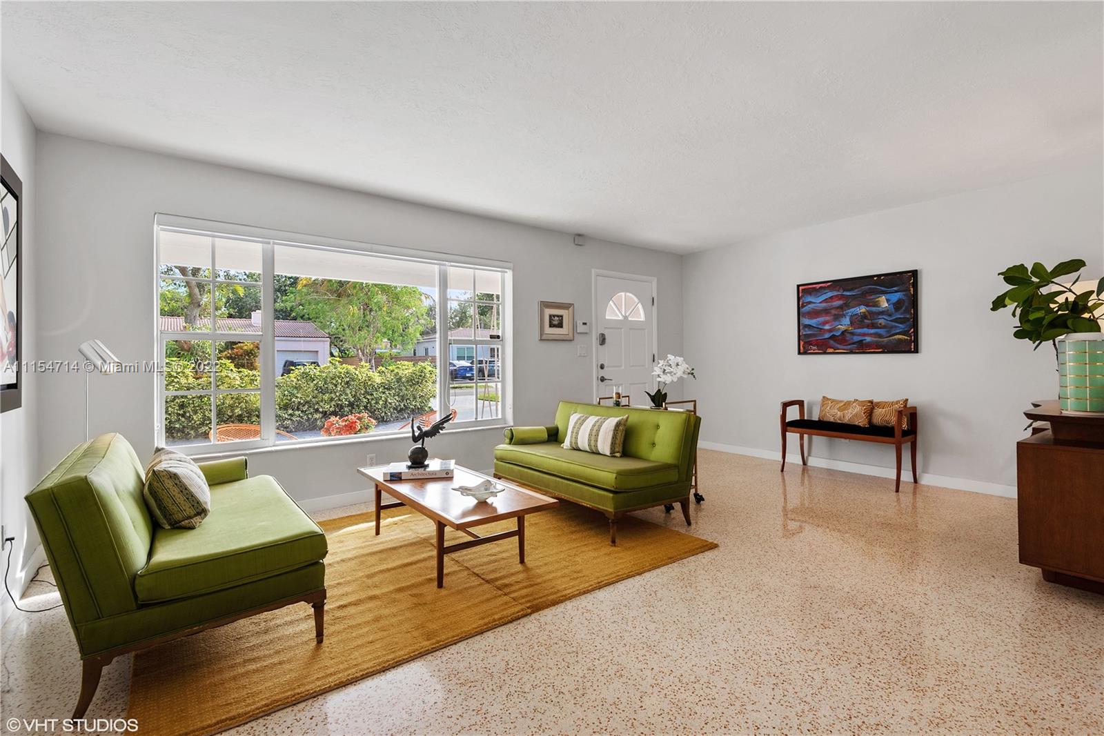 Mid-century modern ranch in Miami Shores with 3 beds/3 baths, 1747 total SqFt and a fully fenced yard with large entertaining patio and still room for a spacious pool. This pristine home boasts restored terrazzo floors and two bedrooms and two original 50's bathrooms in the main house and an in-laws' quarters with separate entrance via the shared laundry room features gleaming white porcelain tile floors, a morning bar, roomy closet, split system AC and a roomy modern bath en-suite. Additional features include a stamped circular driveway, mature landscaping, huge back yard w/covered patio, cafe lights, storage shed & tall privacy hedge. Updates include: BRAND NEW HVAC 2022, exterior paint 2021, tankless water heater 2016, septic system 2015, hurricane shutters 2014, S-tile roof 2007.