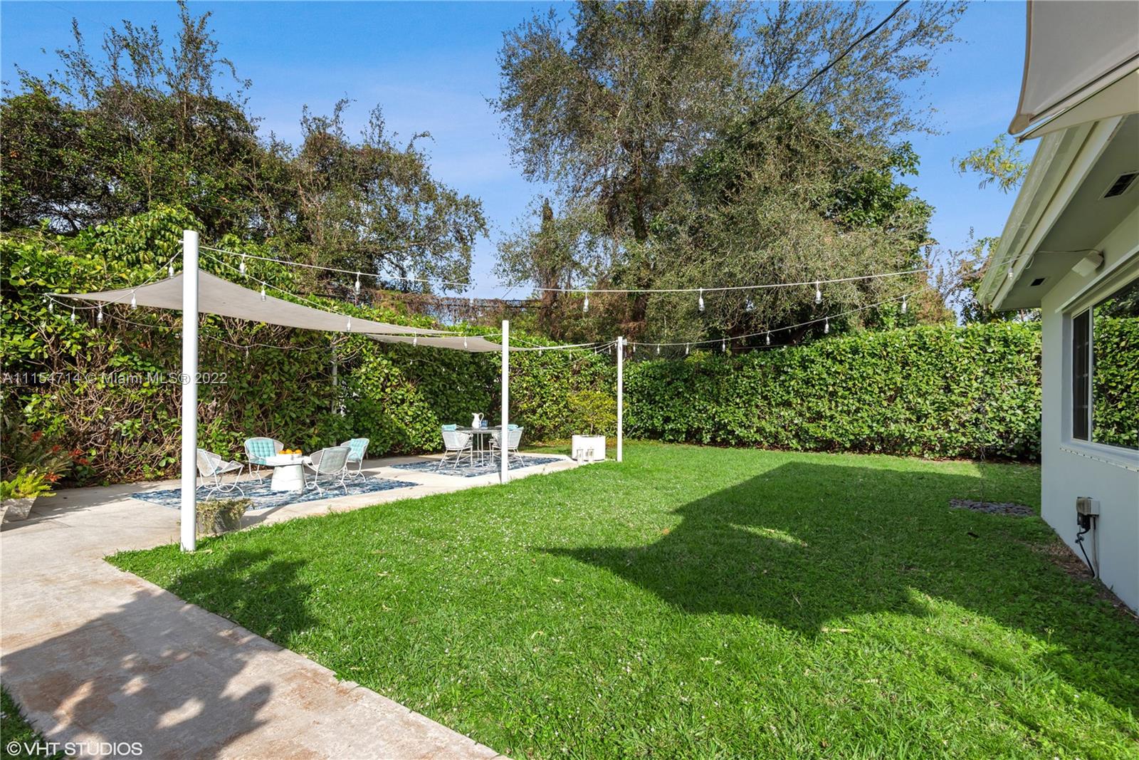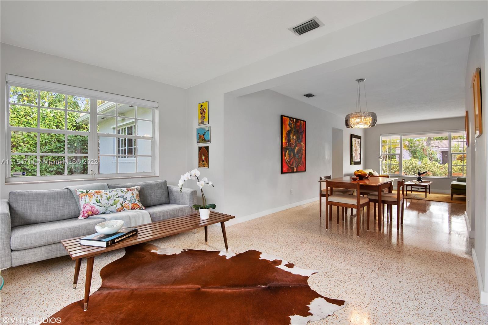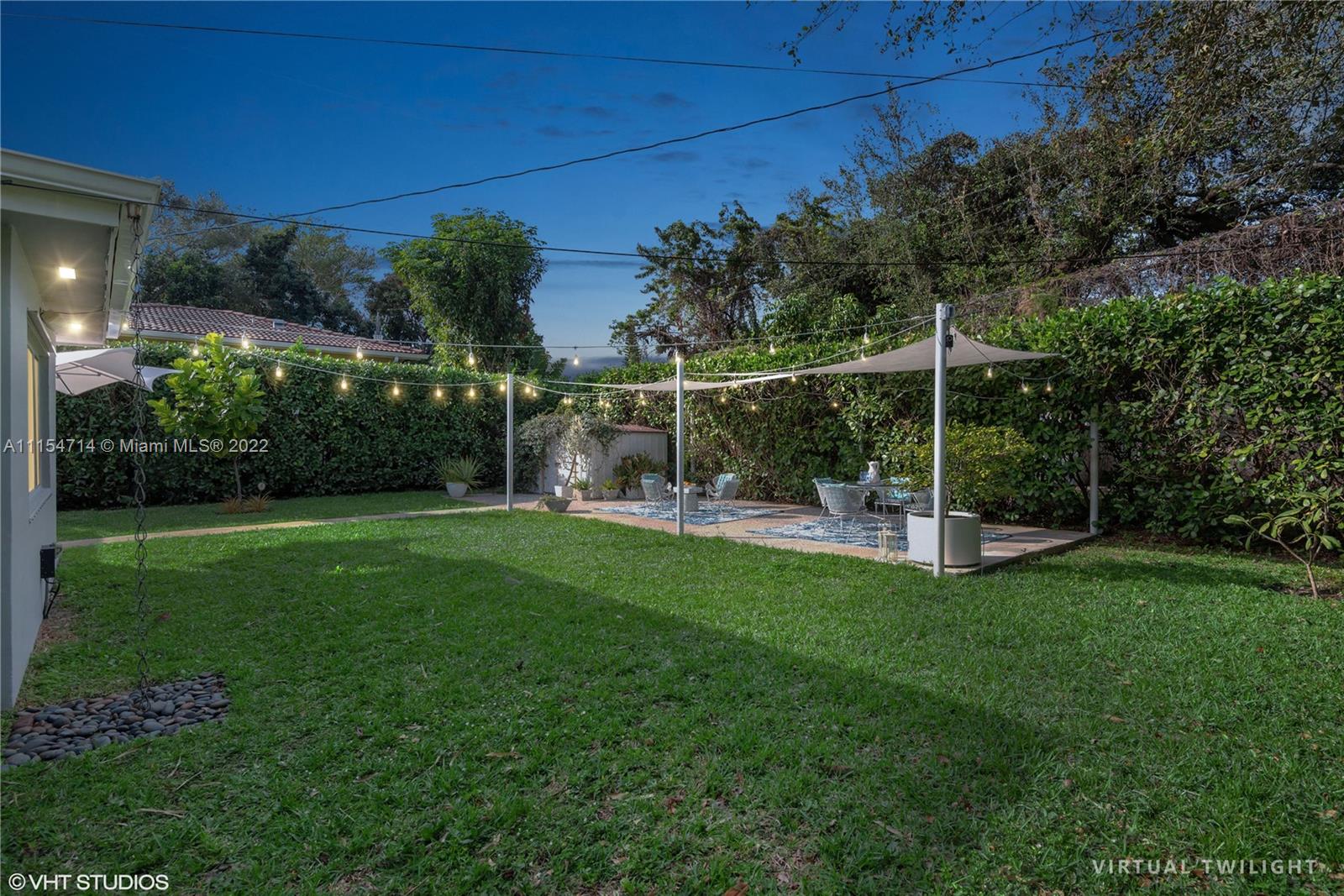 Mid-century modern ranch in Miami Shores with 3 beds/3 baths, 1747 total SqFt and a fully fenced yard with large entertaining patio and still room for a spacious pool. This pristine home boasts restored terrazzo floors and two bedrooms and two original 50's bathrooms in the main house and an in-laws' quarters with separate entrance via the shared laundry room features gleaming white porcelain tile floors, a morning bar, roomy closet, split system AC and a roomy modern bath en-suite. Additional features include a stamped circular driveway, mature landscaping, huge back yard w/covered patio, cafe lights, storage shed & tall privacy hedge. Updates include: BRAND NEW HVAC 2022, exterior paint 2021, tankless water heater 2016, septic system 2015, hurricane shutters 2014, S-tile roof 2007.