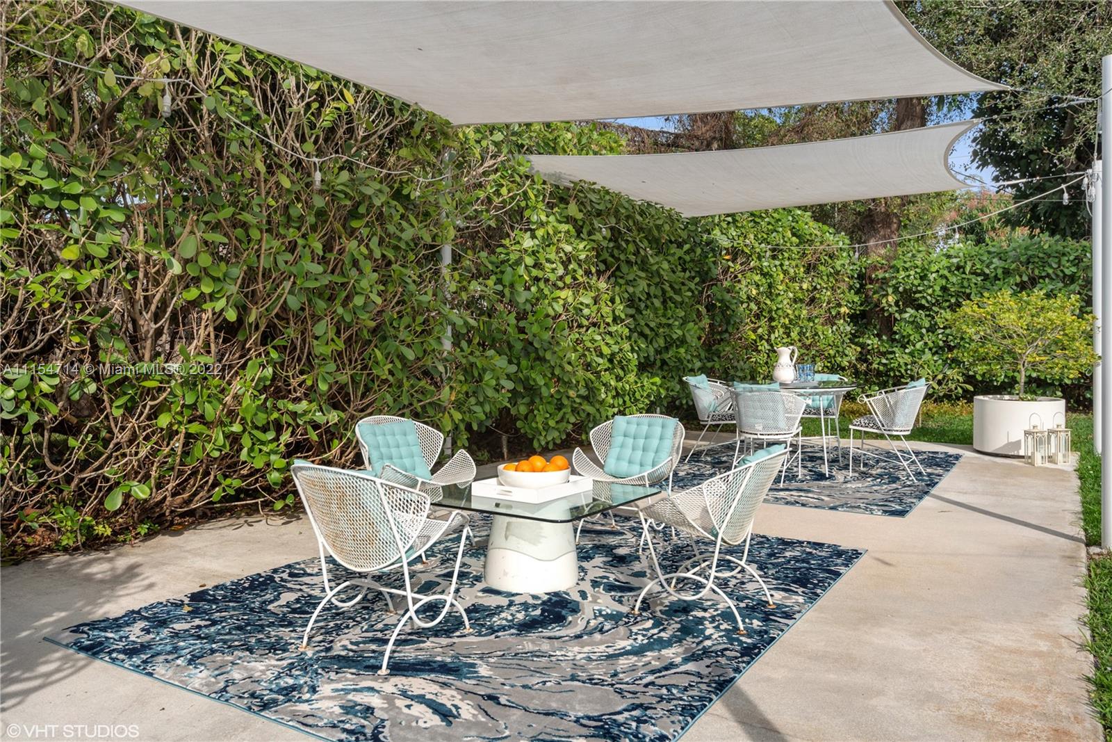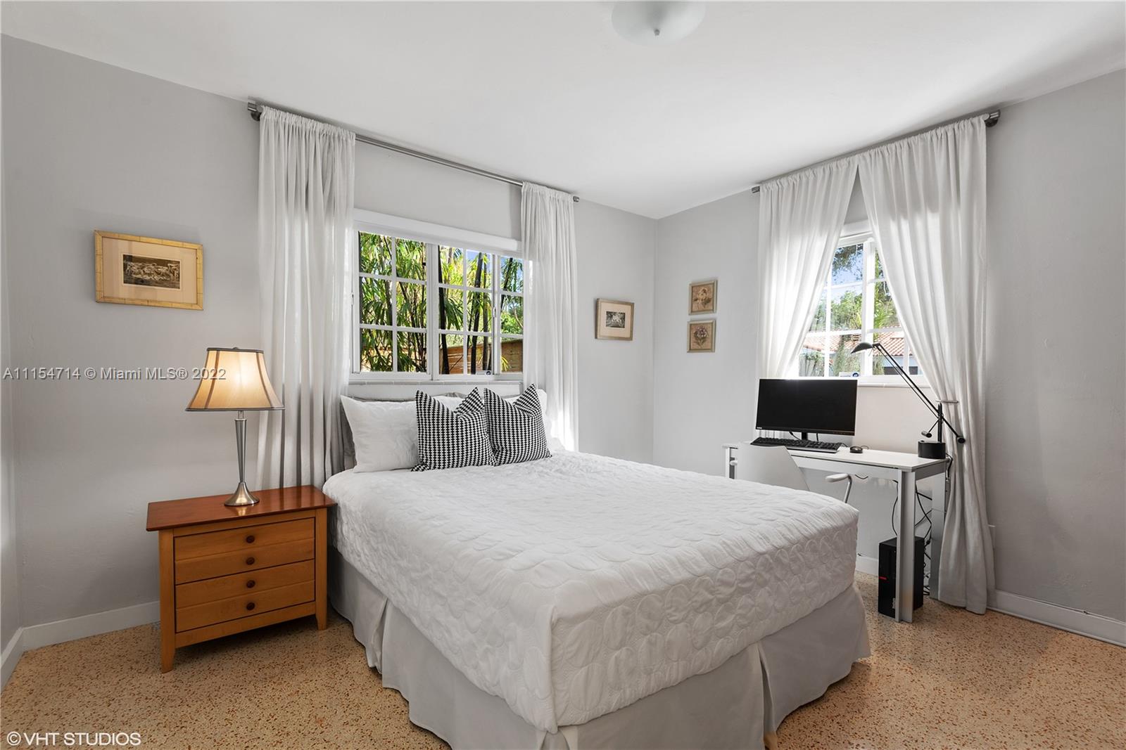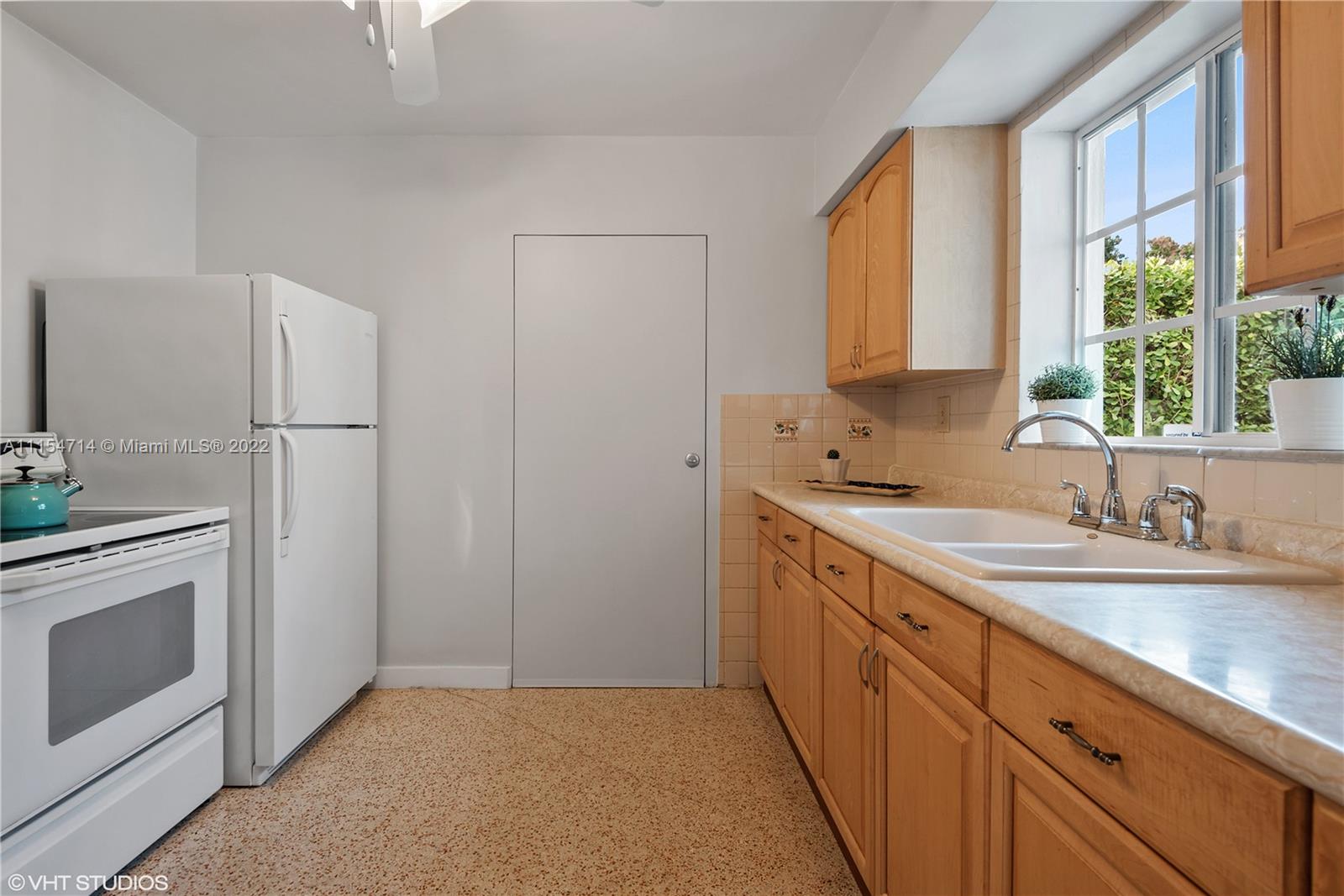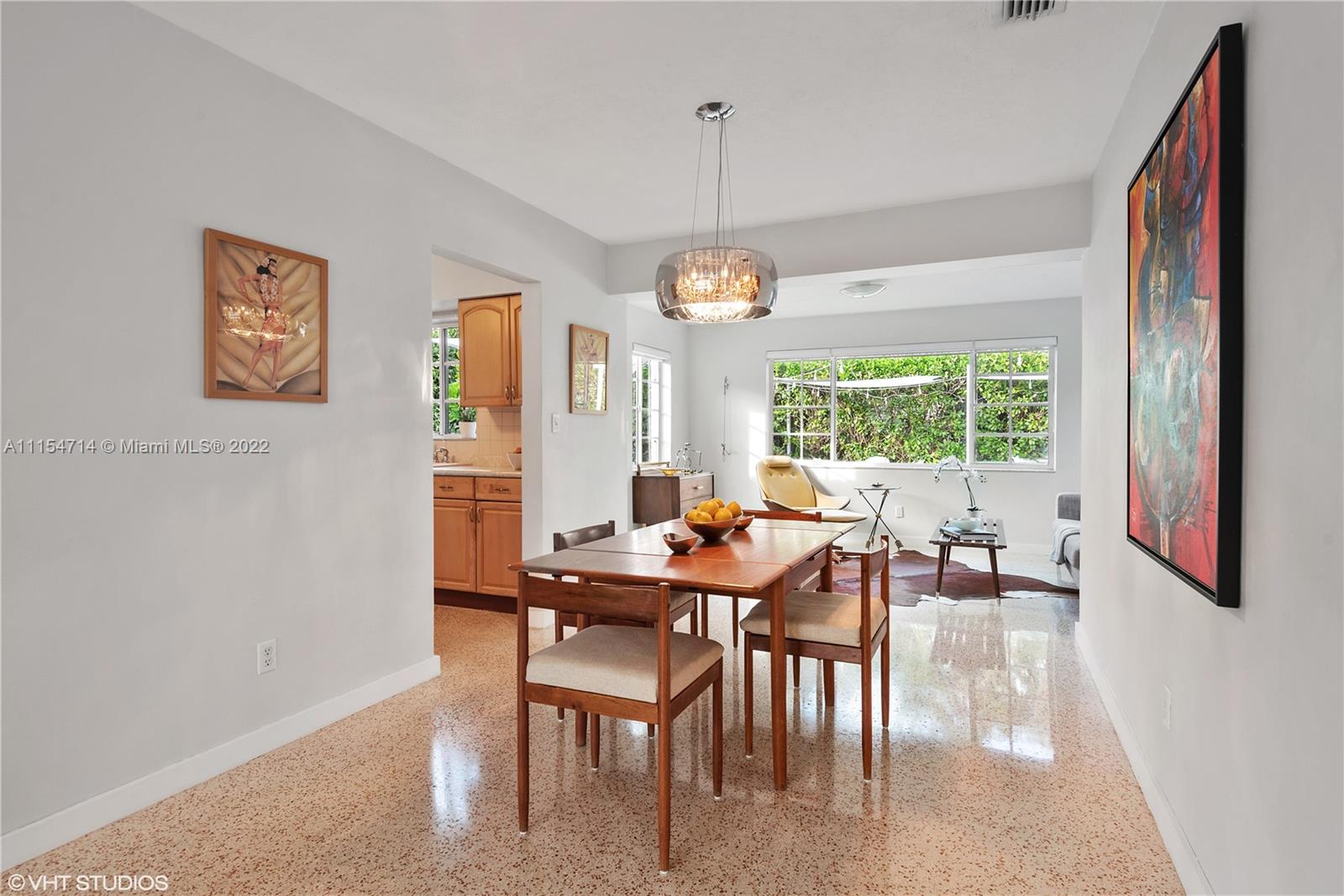 Mid-century modern ranch in Miami Shores with 3 beds/3 baths, 1747 total SqFt and a fully fenced yard with large entertaining patio and still room for a spacious pool. This pristine home boasts restored terrazzo floors and two bedrooms and two original 50's bathrooms in the main house and an in-laws' quarters with separate entrance via the shared laundry room features gleaming white porcelain tile floors, a morning bar, roomy closet, split system AC and a roomy modern bath en-suite. Additional features include a stamped circular driveway, mature landscaping, huge back yard w/covered patio, cafe lights, storage shed & tall privacy hedge. Updates include: BRAND NEW HVAC 2022, exterior paint 2021, tankless water heater 2016, septic system 2015, hurricane shutters 2014, S-tile roof 2007.