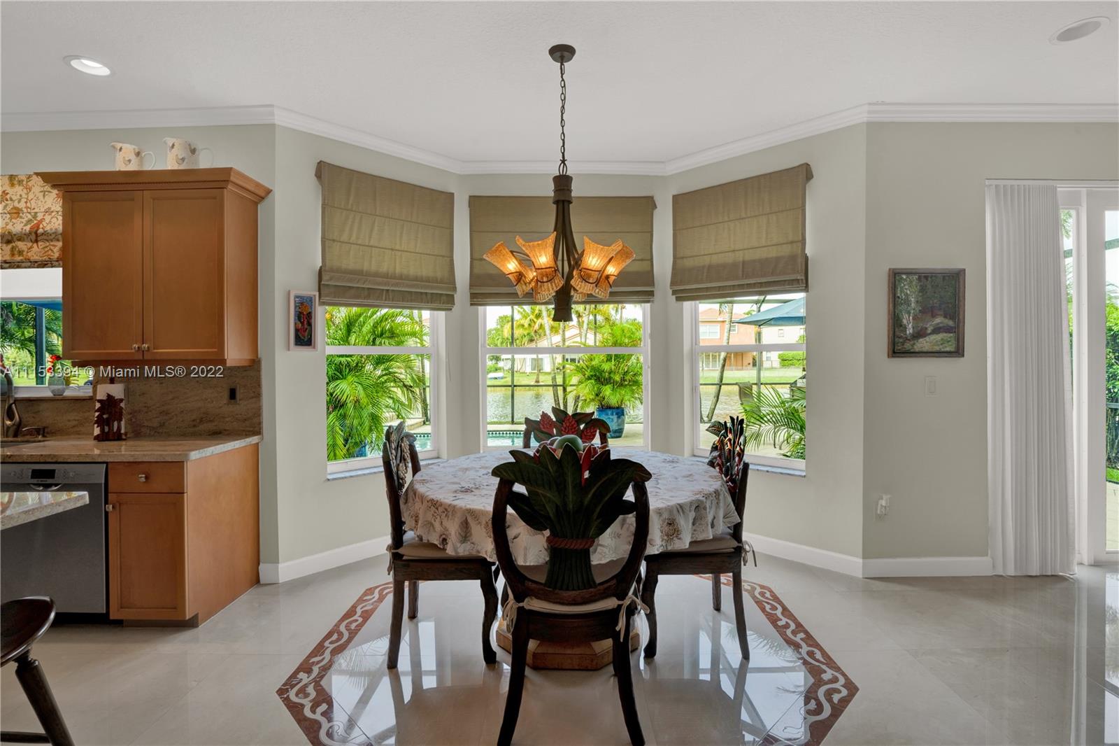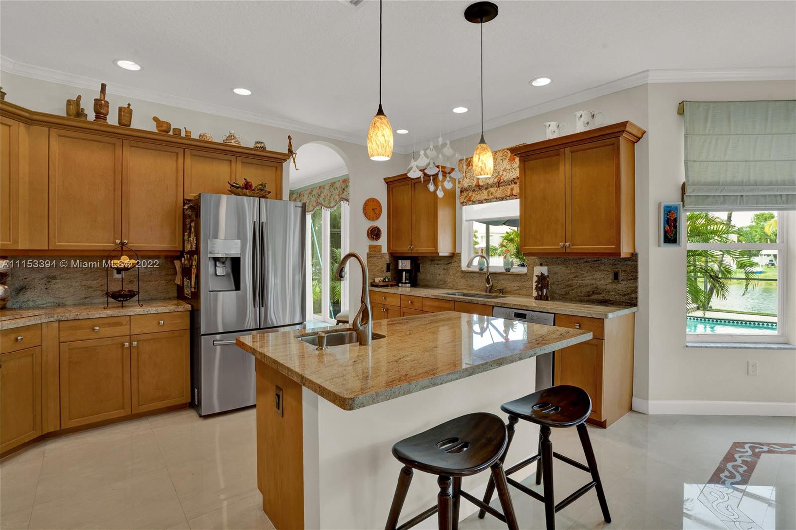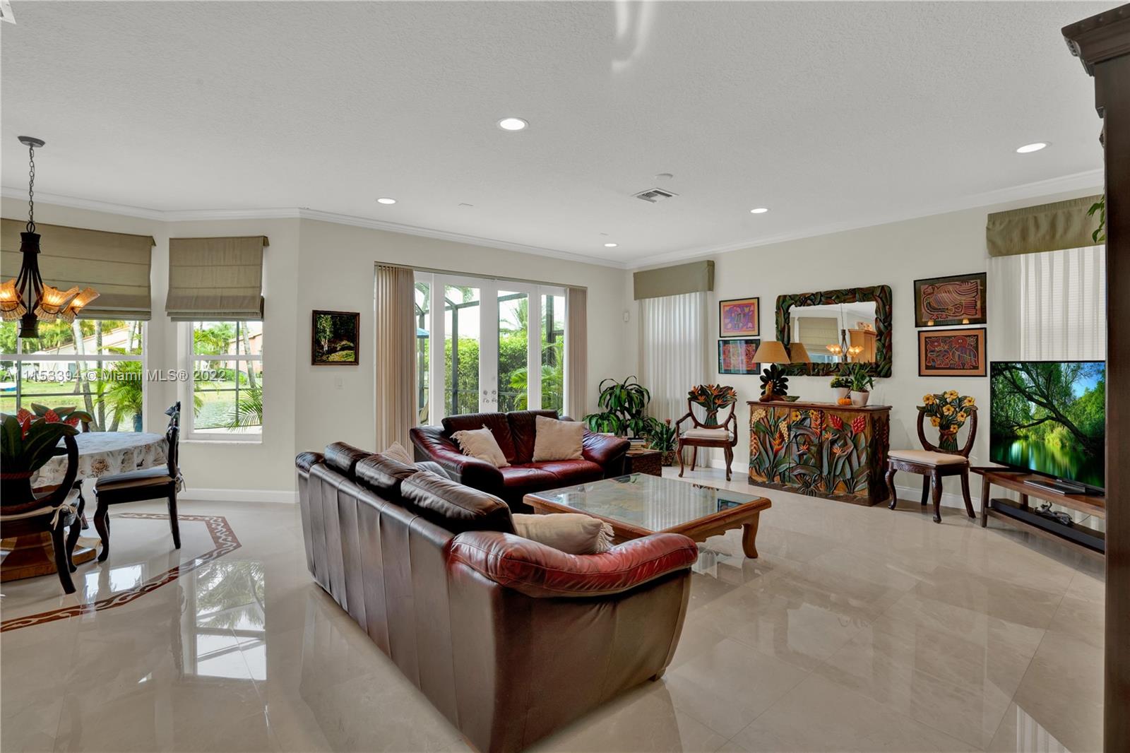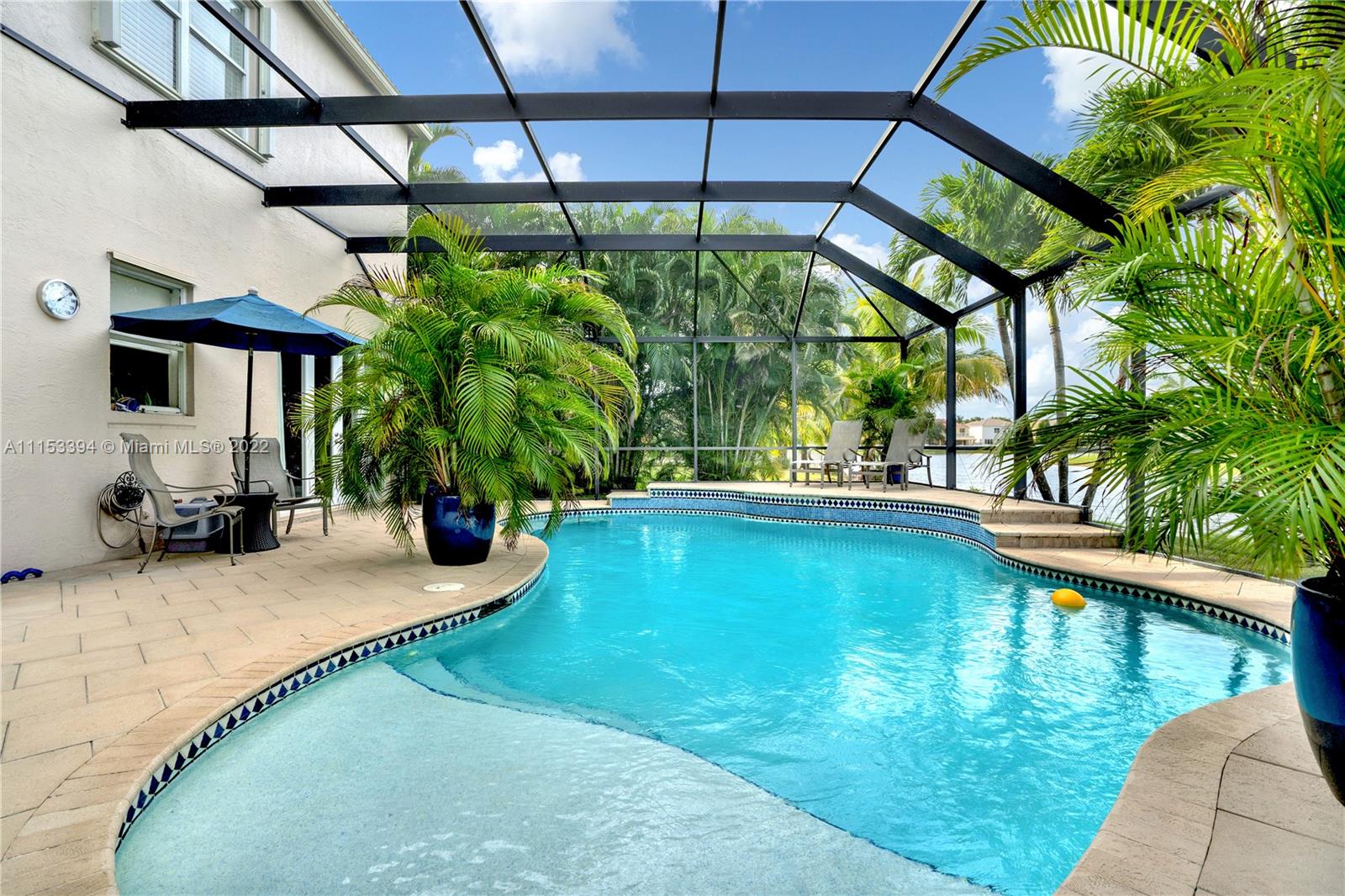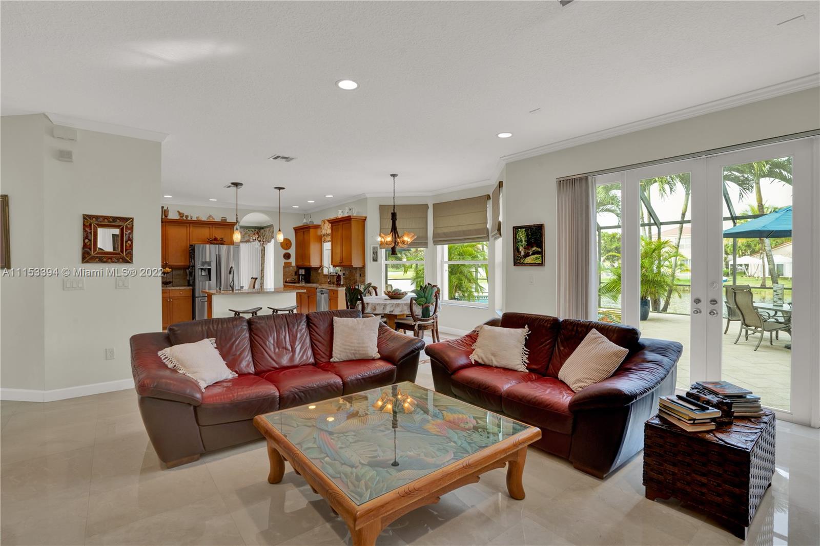 GORGEOUS waterfront house w/upgrades enhancing your living lifestyle. In the community of Riviera Isles. Beautiful Crème de Marfil marble on the first floor. w/marble inlay designs. Large kitchen w/beautiful granite countertops, stainless-steel appliances & maple wood cabinets. Spacious living & dining areas. Open kitchen & family room w/views of the pool & lake. Four bedrooms including a spacious Master Bedroom w/lake views. Three full bathrooms w/upgrades. Den area upstairs w/hardwood flooring that can be converted to a fifth bedroom. Ascending a gorgeous spiral wooden oak staircase you are greeted to an all tile second floor. Spectacular Salt-Water pool w/design artistic pavers for entire patio area w/views of the lake & astonishing sunset’s. Three car garage w/space for storage.