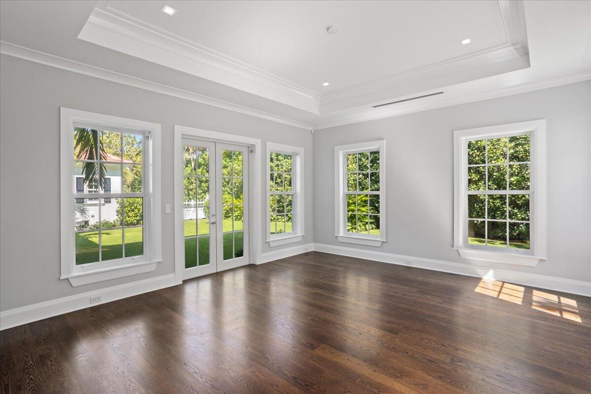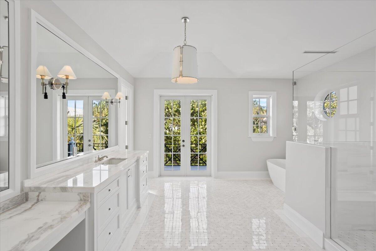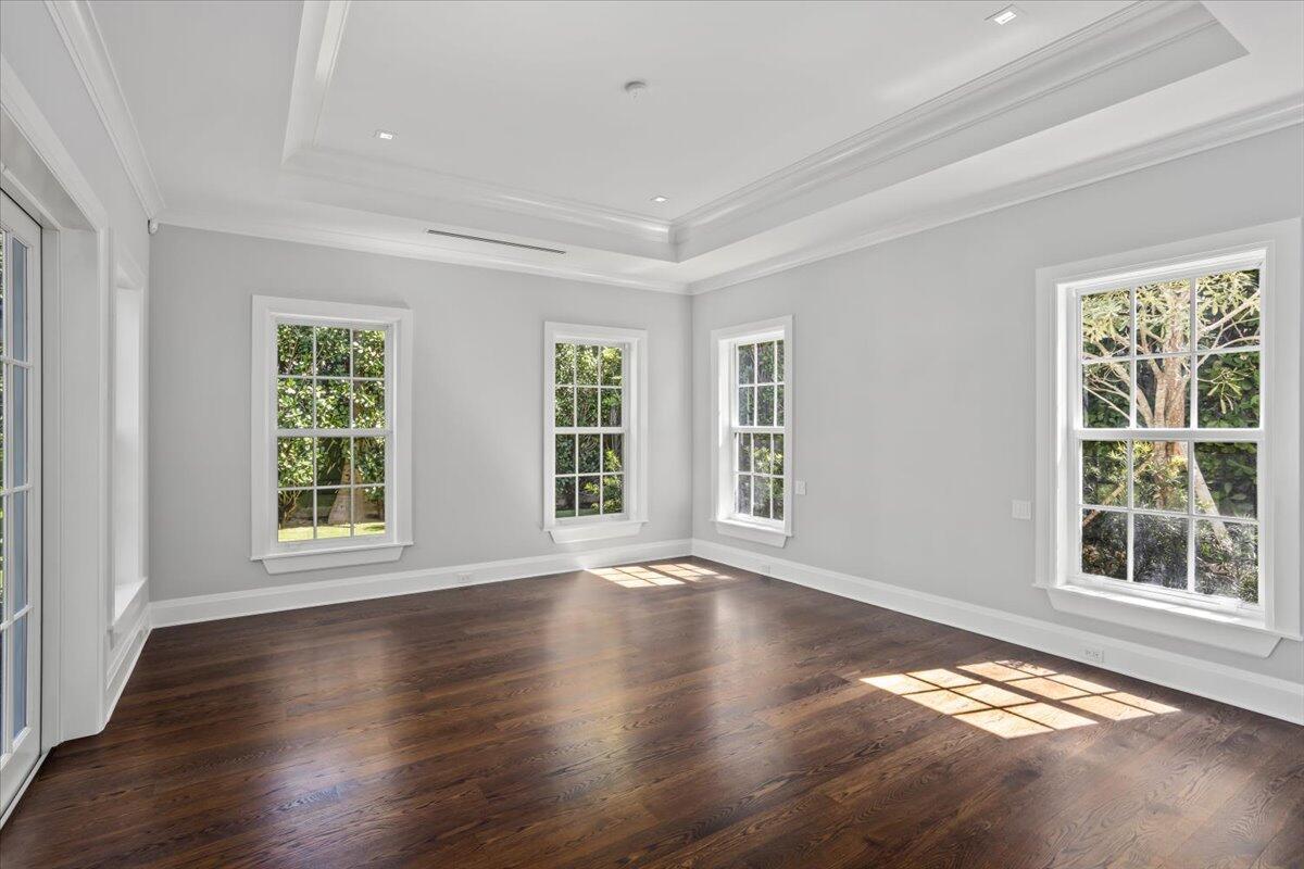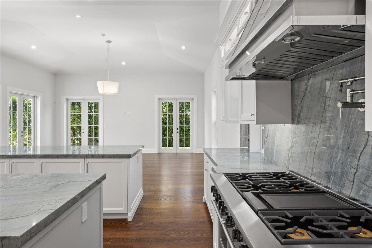Just completed on an oversized lot, this five bedroom, 6.1 marble bath estate has ultra-high ceilings and spacious rooms throughout. A stately entry foyer, separate bar with 2 refrigerators, hardwood floors and recessed lighting throughout. Bright and light, every room has at least two walls of windows/doors. The primary suite has two luxurious bathrooms, large walk-in closets, and a generous private terrace. The kitchen has quality cabinetry and appliances and expands onto a spacious family room. The east side of the property has a wonderfully sized garden area, and the west aide has an outdoor loggia that is adjacent to the oversized pool/spa. Additionally, there is an elevator, storage, 2 laundry rooms, air-conditioned two car garage,