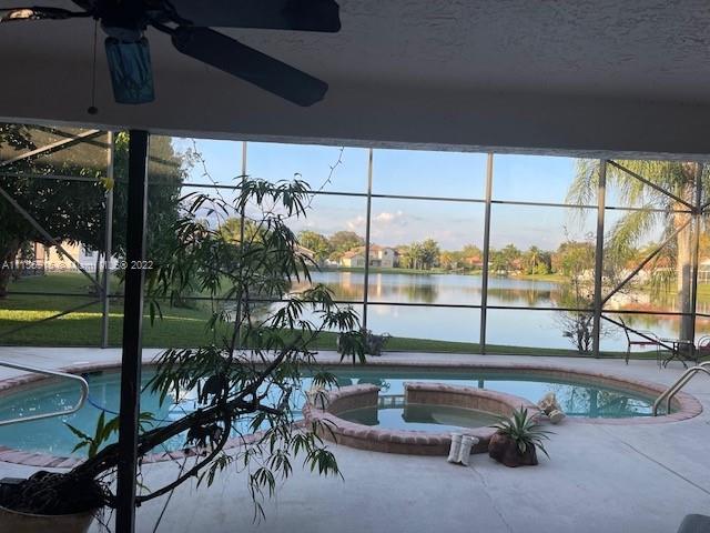 Buyer lost Financing.. Back on The Market! BEAUTIFUL WATERFRONT POOL HOME WITH JACUZZI... IN THE ESTATES OF TANGLEWOOD LAKES.!! THIS HOME HAS FULL DIRECT VIEWS OF THE PREMINUM LAKE THAT YOU CAN SEE FROM ALMOST EVERY ROOM.... IT HAS DRAMATIC SOARING CELINGS WITH A BEAUTIFUL TWO STORY FOYER!! LOTS OF WINDOWS THAT OFFERS AN ABUNDANCE AMOUNT OF NATURAL LIGHTING... ONE BEDROOM IS LOCATED DOWNSTAIRS AND OFFERS A PRIMARY SUITE WHICH LEADS OUT TO THE POOL AND COVERED SCREENED IN PATIO.... THIS HOME ALSO HAS A PRIVATE SEPARATE CABANA BATH..... DID I FORGET TO MENTION THE BEAUTIFUL MATURE MANGO TREE.... SIT BACK AND RELAX WATCH THE SUNRISE AND SUNSET..... THE HOME IS IN A FABULOUS GATED COMMUNITY AND....IS WAITING FOR YOU TO MAKE IT YOUR OWN!!