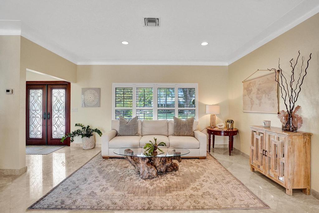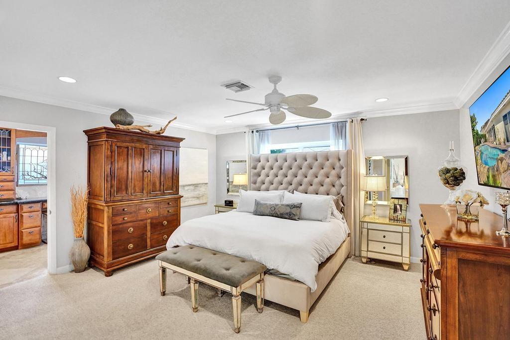 This home exudes the epitome of the South Florida lifestyle! Bright, open and beachy with a private infiniti pool, 80 feet along the wide, deepwater canal and beach access across the street. Hard to find 9 foot ceilings, stunning marble floors and impact windows and doors are a few of the special features. The floor plan has a perfect flow for entertaining with a large great room, 2 wine coolers, separate bar and coffee bar, large island and new 48" Kitchenaid refrigerator. Even the garage is outfitted with custom flooring and cabinetry and a new secondary refrigerator. Plus, a new A/C in 2020 and almost 9 ft. flood elevation. This is a stunning home in the single entry, secluded Bermuda Riviera neighborhood. Guard house has cameras and zoned for Bayview Elementary School disctrict!