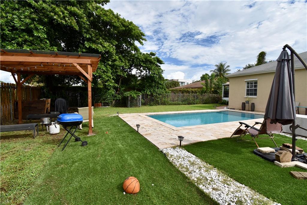 Beautifully gated corner lot home. Sits on double wide lot (2 lots) seller combined. Could potentially be separated if buyer chooses. 3 bdrm 2 bthrm split floor plan with a very spacious backyard. Crystal blue swimming pool nicely paved, custom wood pergola, screened back patio. Kitchen features upgraded granite counter tops and cabinets, stainless steel appliances, beautiful laminate flooring, washer & dryer, walk-in closets. Neighborhood is close to highways, downtown Las Olas, schools and parks.