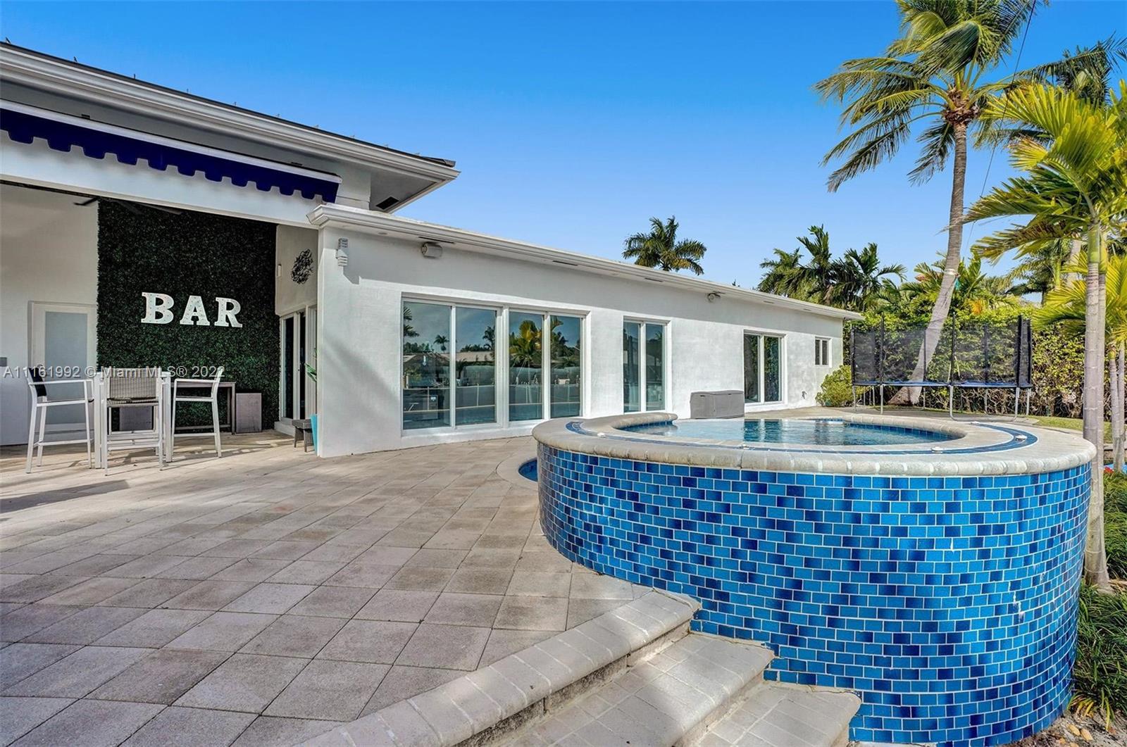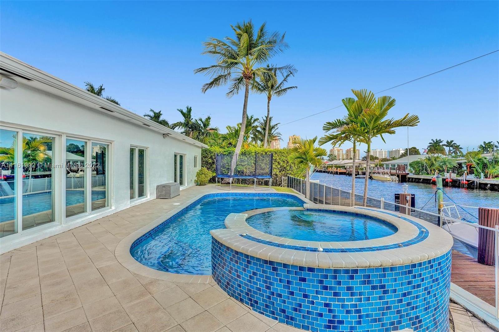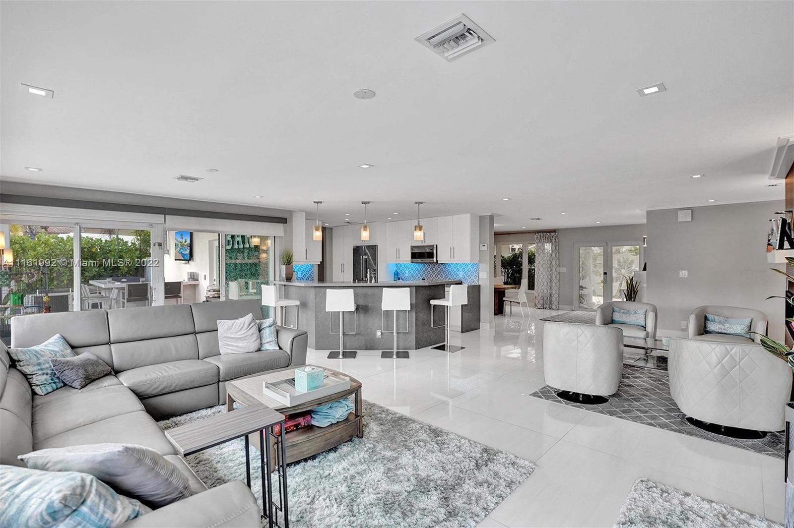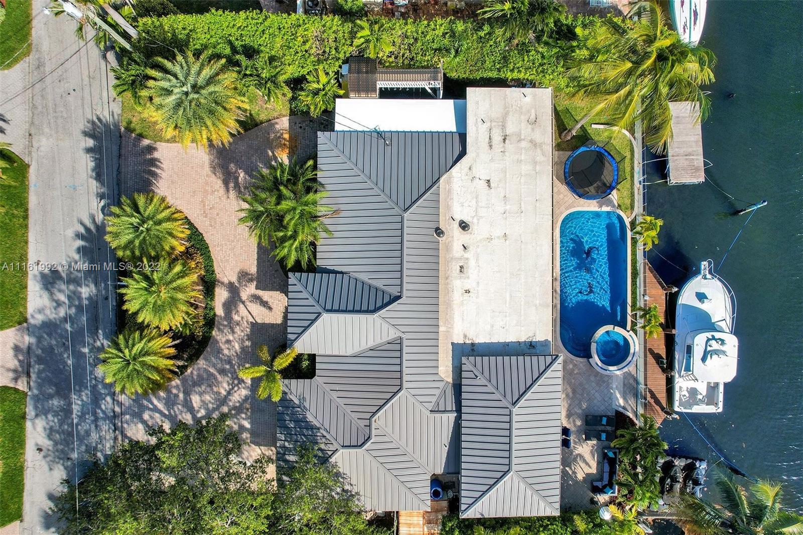 Modern Coral Ridge waterfront home with spectacular views of the coast. This boaters paradise includes impact windows & doors, porcelain 4x4 flooring, open kitchen & living areas overlooking the pool & canal, quartz countertops, long bar with designer backsplash, Viking appliances, LED lighting throughout, stone wall with LED electric fireplace, & custom lighting. The master suite includes direct water view with large walk in closet and bath. Exterior features new awning for carport, large 2 car garage with epoxy flooring, metal roof, 24x12 covered patio with high ceilings, light up bar with ice maker & beverage cooler, 11 car parking, pavers, 100' seawall, 30 ft dock, 2 dolphin pilings, & substantial tropical landscaping. Walk to the galleria mall, Bayview school and minutes to the beach.