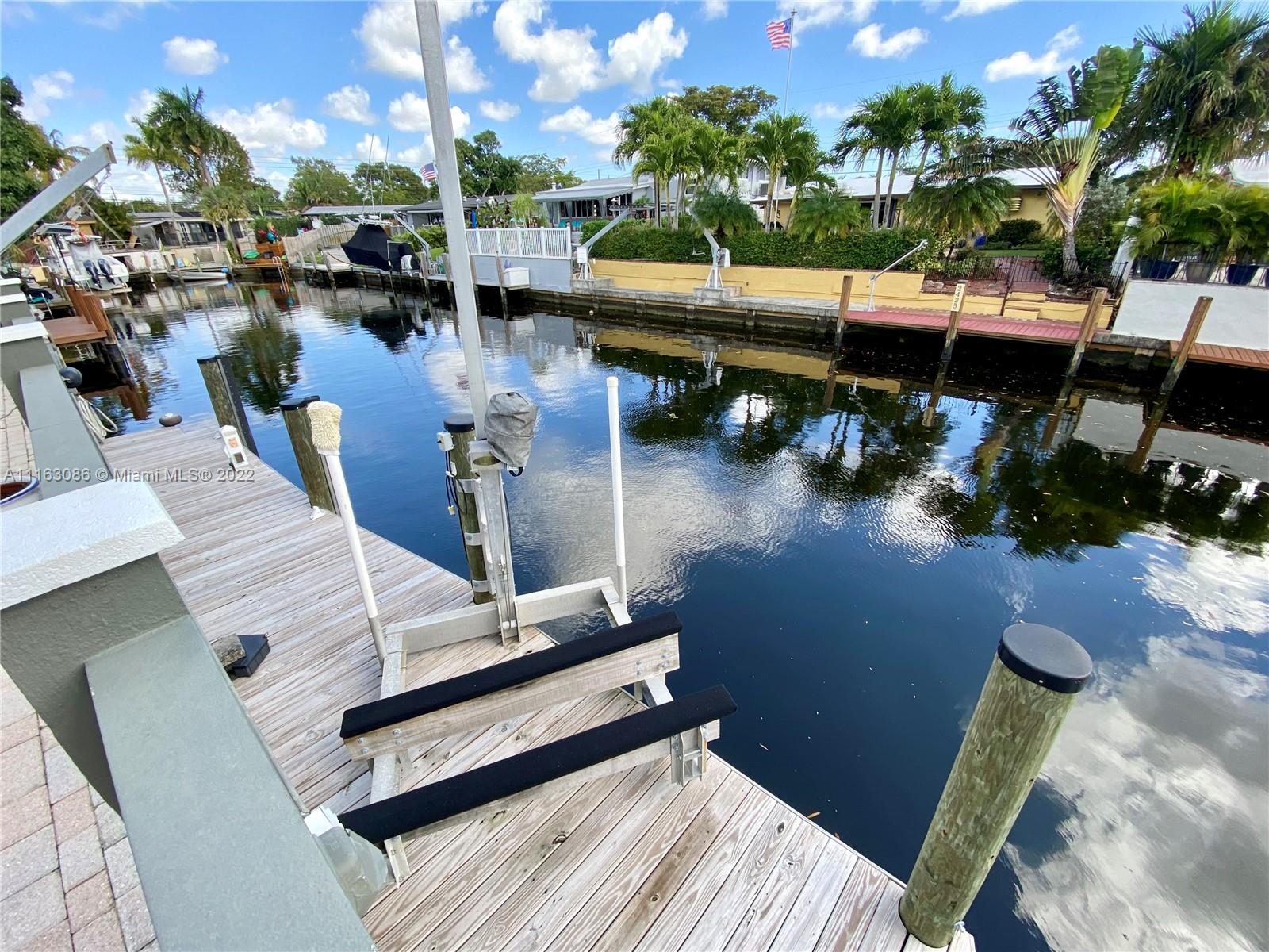 Don't miss this opportunity to have ocean access waterfront property in desired Fort Lauderdale! A beautiful 3 bedroom, 2 bathroom split floorplan home with a pool and garage. The kitchen was recently updated to include gorgeous granite countertops, wood cabinets, and nice stainless appliances. The highlight of this home is the backyard paradise which features a covered patio area, a large swimming pool, a jacuzzi, and a grass area for pets or kids to play. From the backyard, open the gate to step down to the newer dock with two boat lifts- one up to 26 ft and one for a smaller boat or jetski. This home features a charming bricked in front patio area with arch openings which could be converted to living area to make the home over 2100 living sq ft if more space was needed.