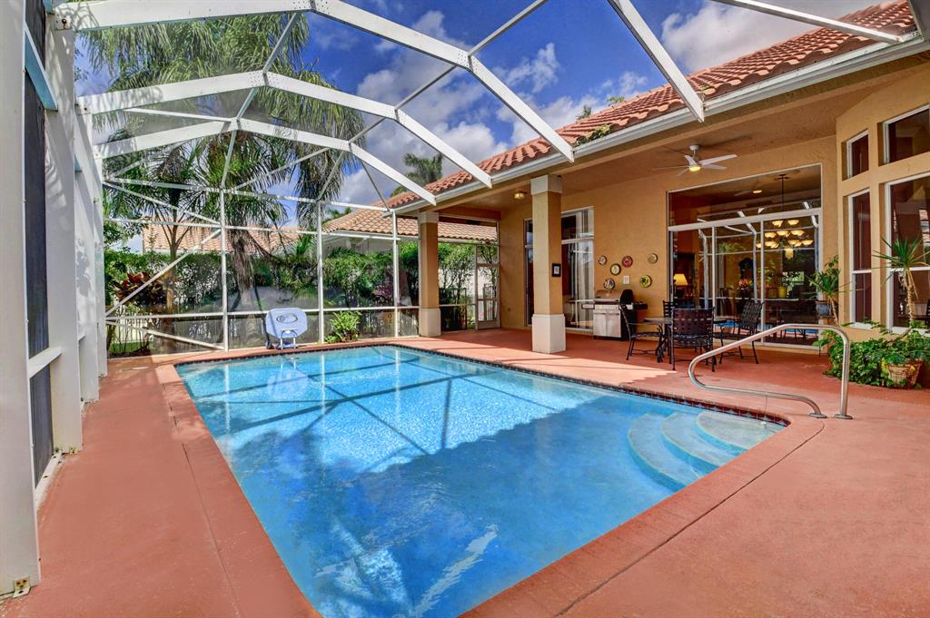 This remarkable home, situated on a quiet interior lot, features the open and airy floor plan of the sought-after Grand Cayman V model in the very desirable community of Boca Isles North. This total 3,660 sq. ft. house features 4 bedrooms with a convertible den, 3 full bathrooms, one of which is a cabana bath; and an exceptionally large family room. The split-bedroom floor plan features an especially large master suite with dual closets, dual sinks, a whirlpool tub, separate shower, and a WC. The kitchen offers ample cabinetry space, large custom granite countertops, and Frigidaire/Thermador SS appliances. Beautiful wood flooring throughout the house, with travertine tile in the kitchen and foyer. A spacious patio with a large pool, all screened-in and surrounded by lush landscaping.